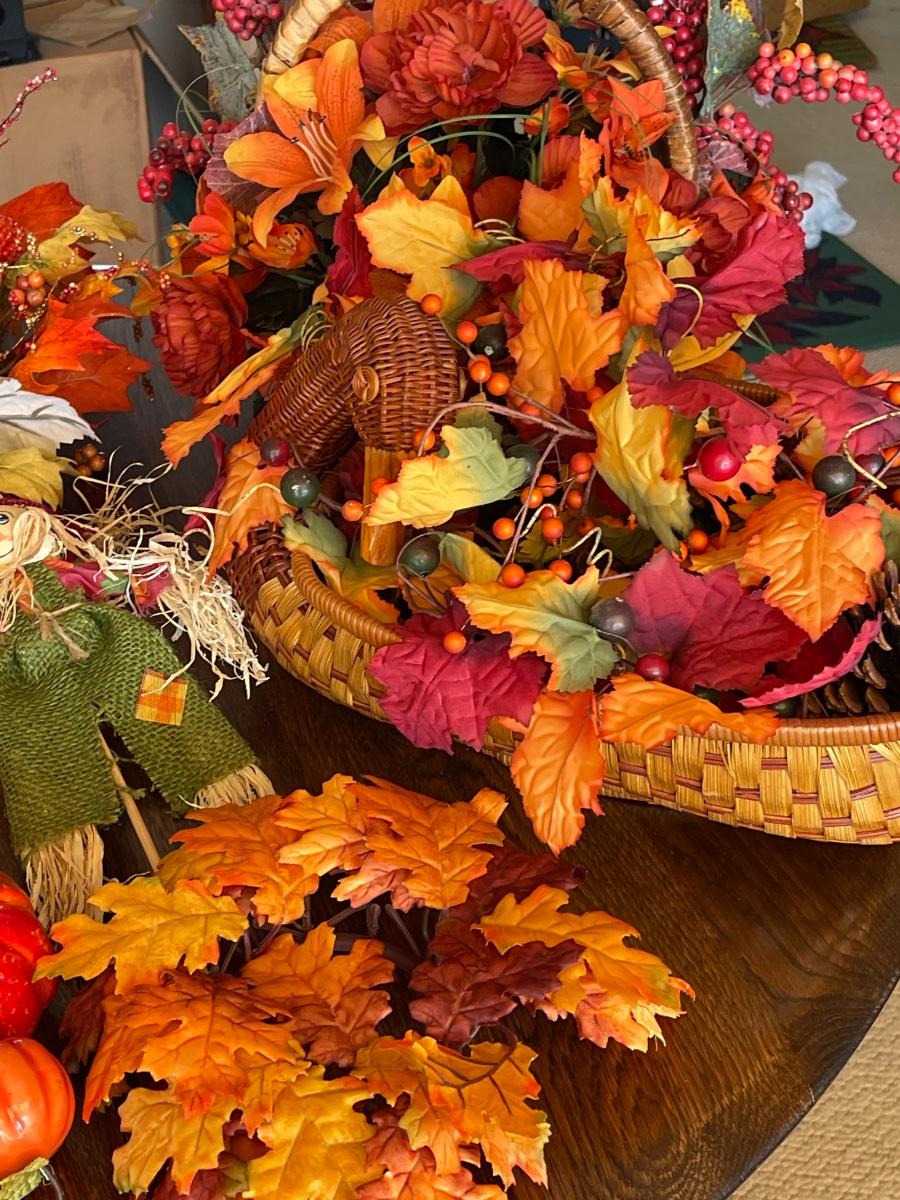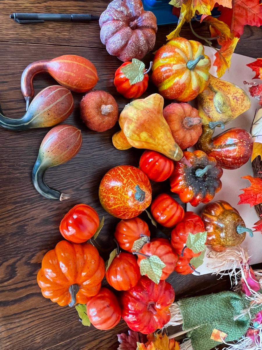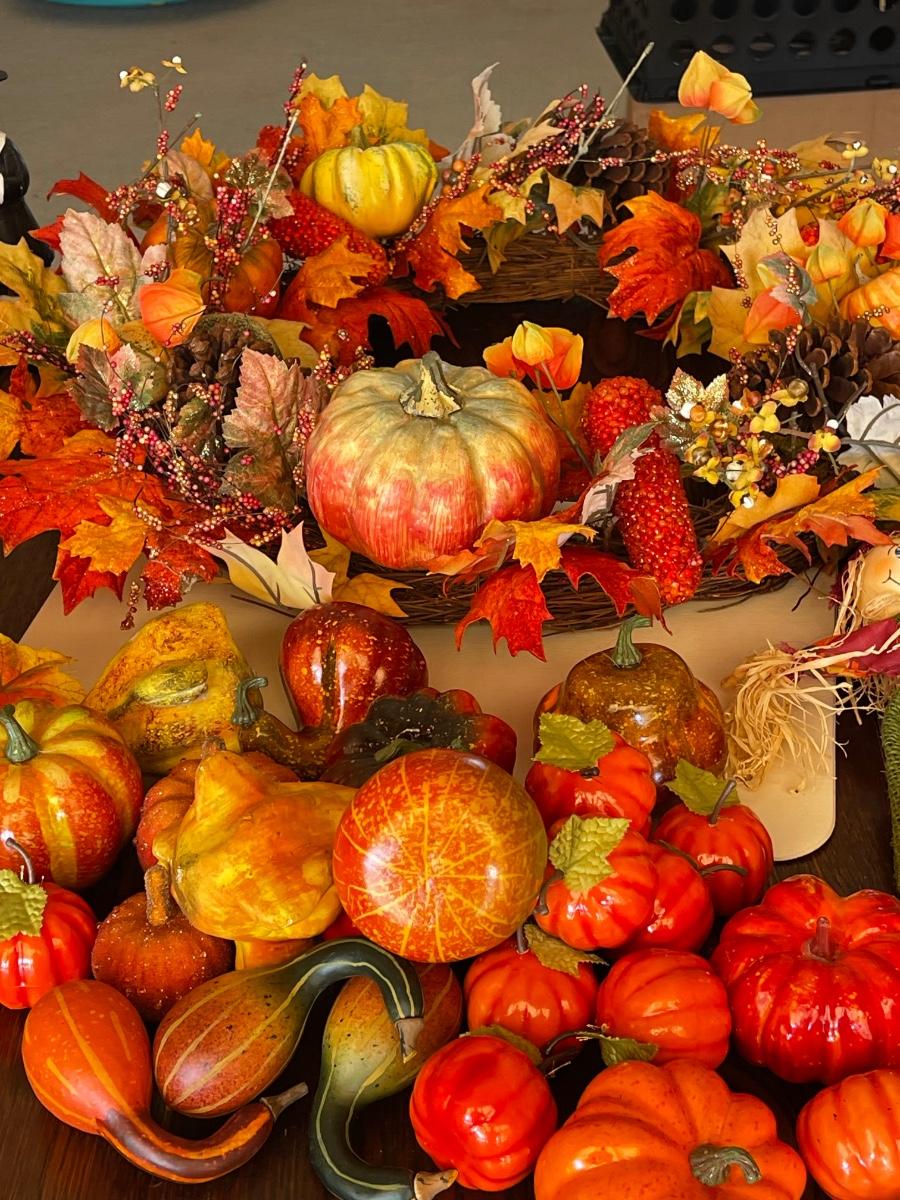 This lot consists of a lot of fall decor. It includes, garland and leaves and mini pumpkins. Great for decorating or making wreaths.