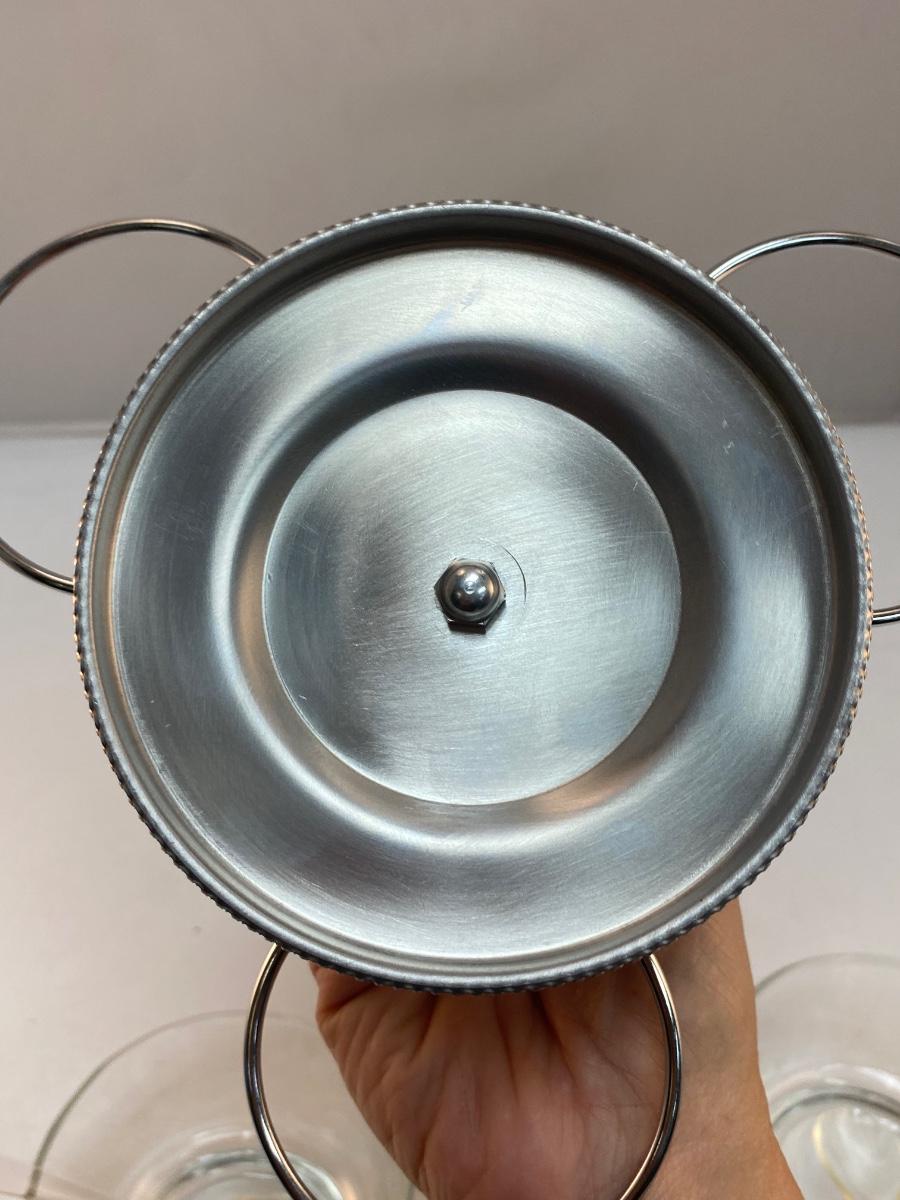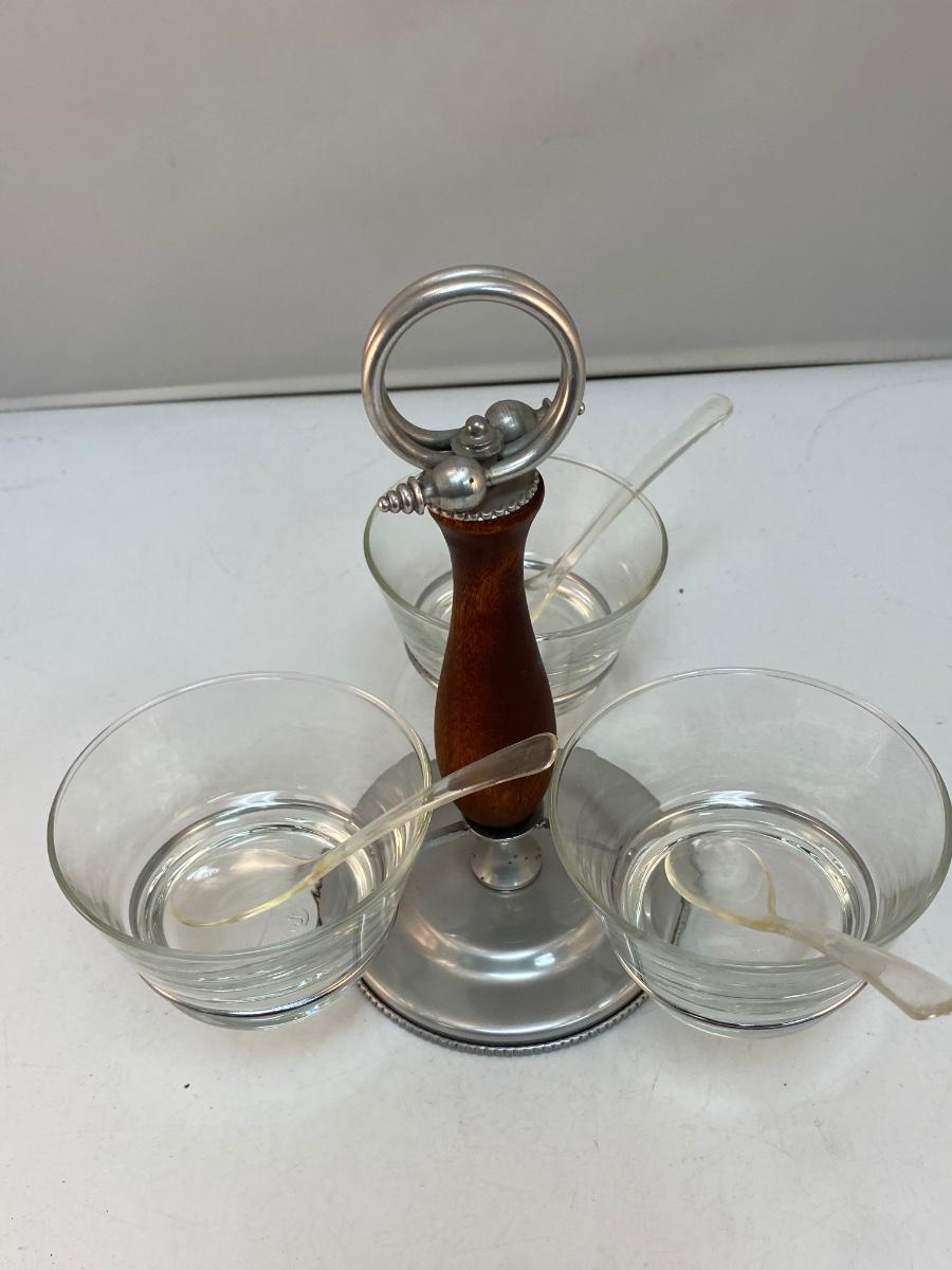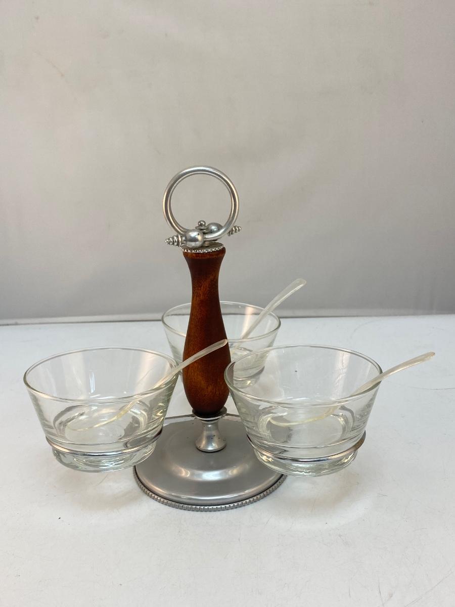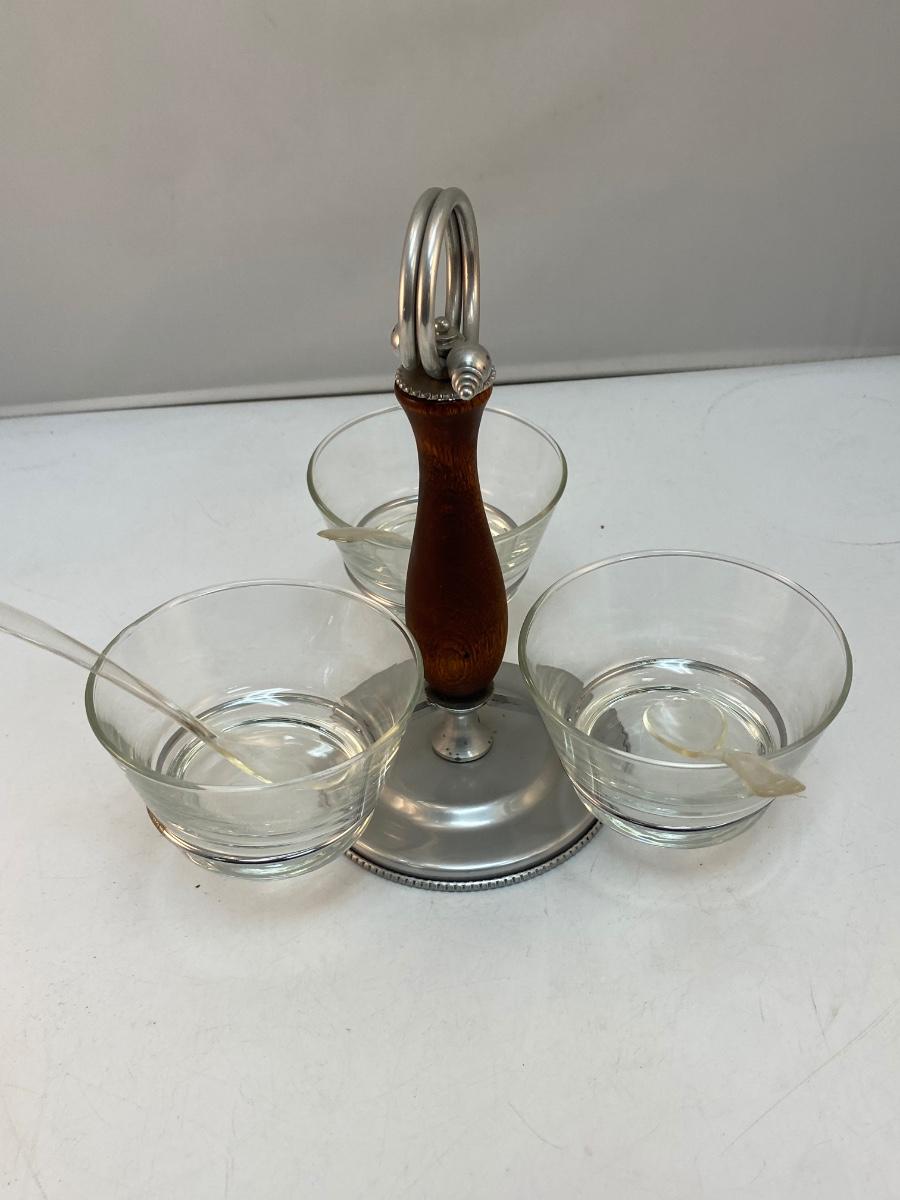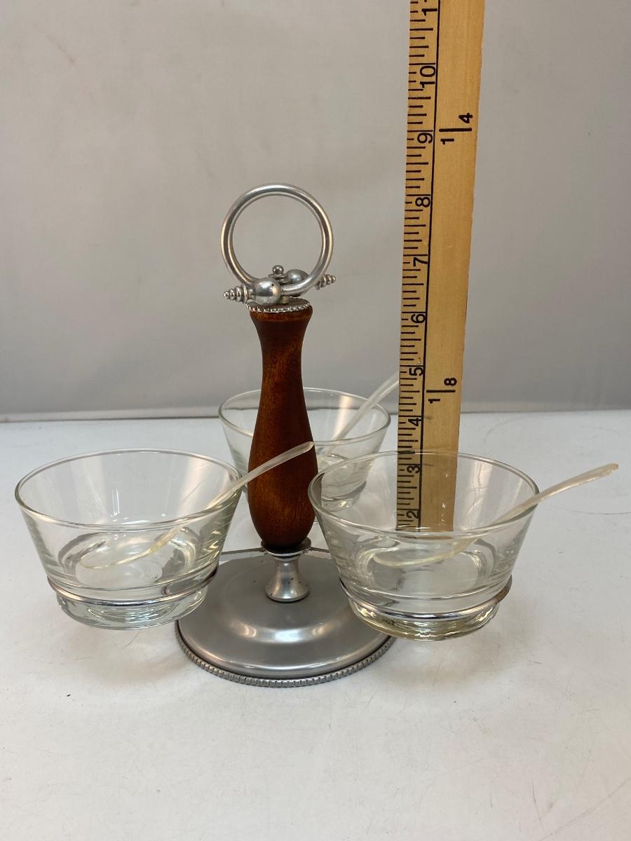 Vintage Retro Wood Handle Condiment Dip Caddy with Three Glass Serving Bowls & Spoons