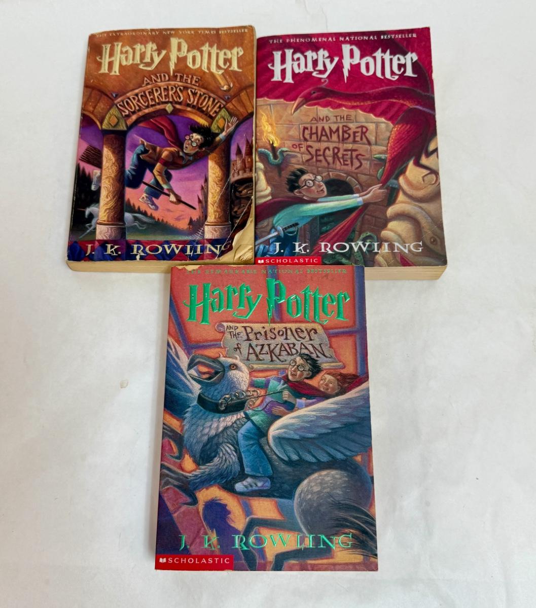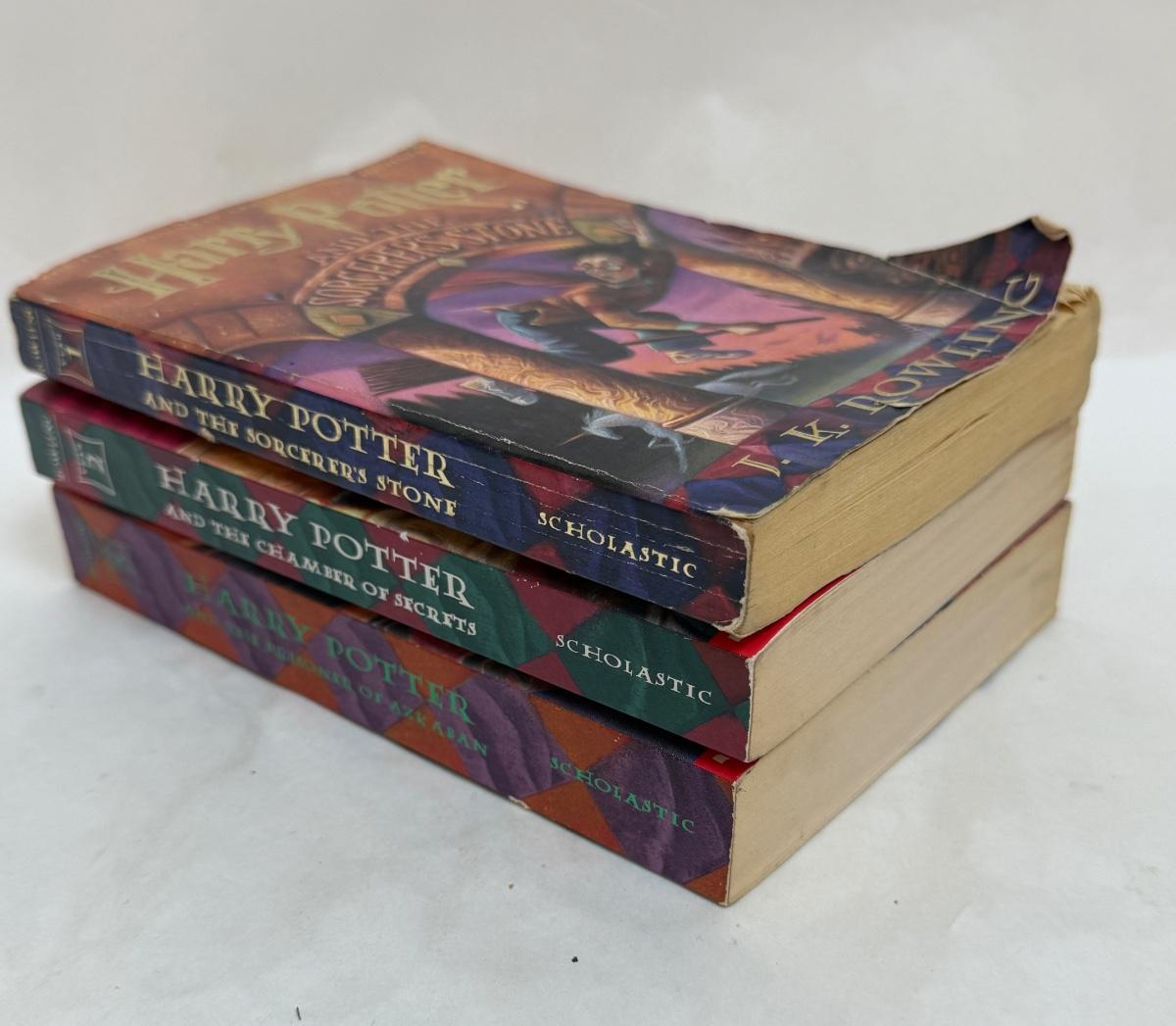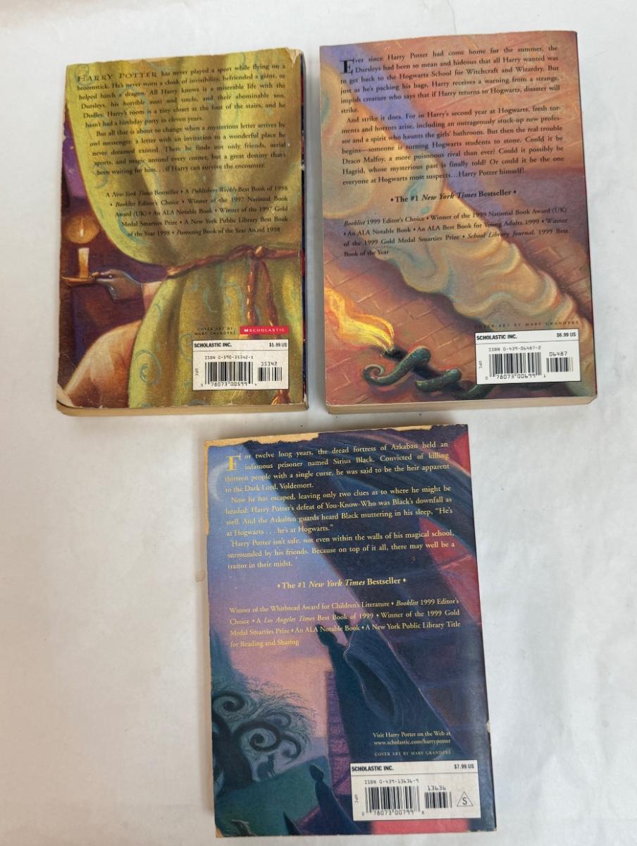 Titles include: Harry Potter and the Sorcerer's Stone, Harry Potter and The Chamber of Secrets, and Harry Potter and The Prisoner of Azkaban. One book has som pages curled up at the bottom corner, but are all otherwise in good, used condition.