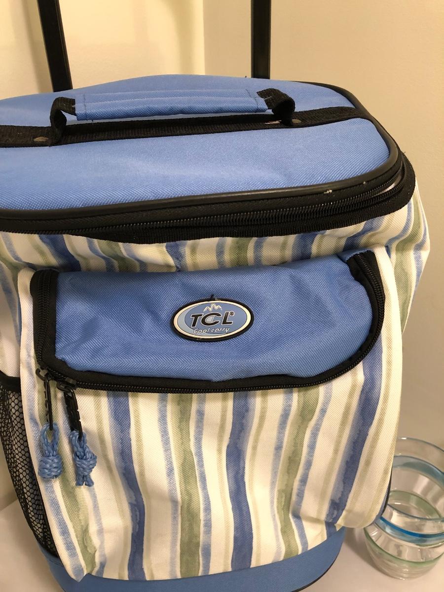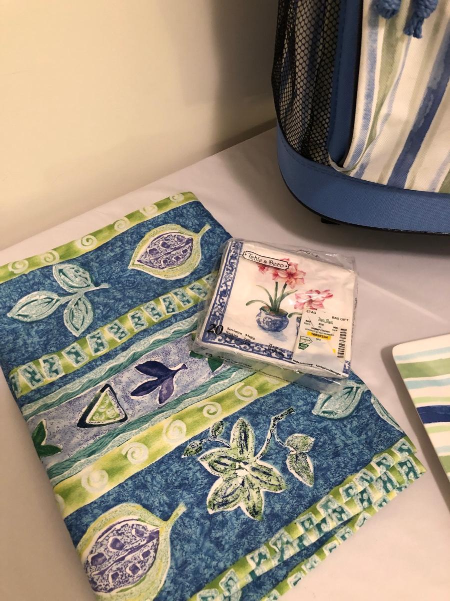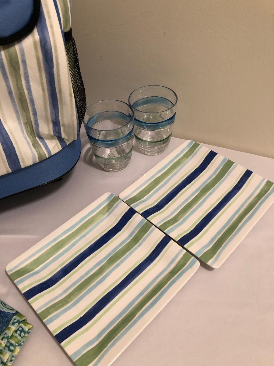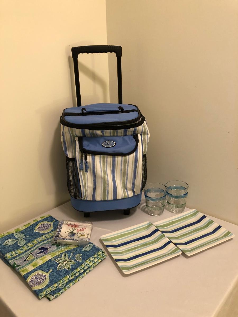 This blue, green, and white striped insulated cooler includes a picnic set for 2 with 2 square shaped plates, 2 cups, many napkins, and a tablecloth. The cooler has a pullout handle and the rolling wheels move easily. With the handle down, the cooler measures 14" x 18.5" x 10". Shipping available.