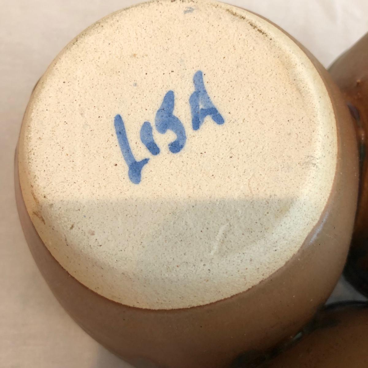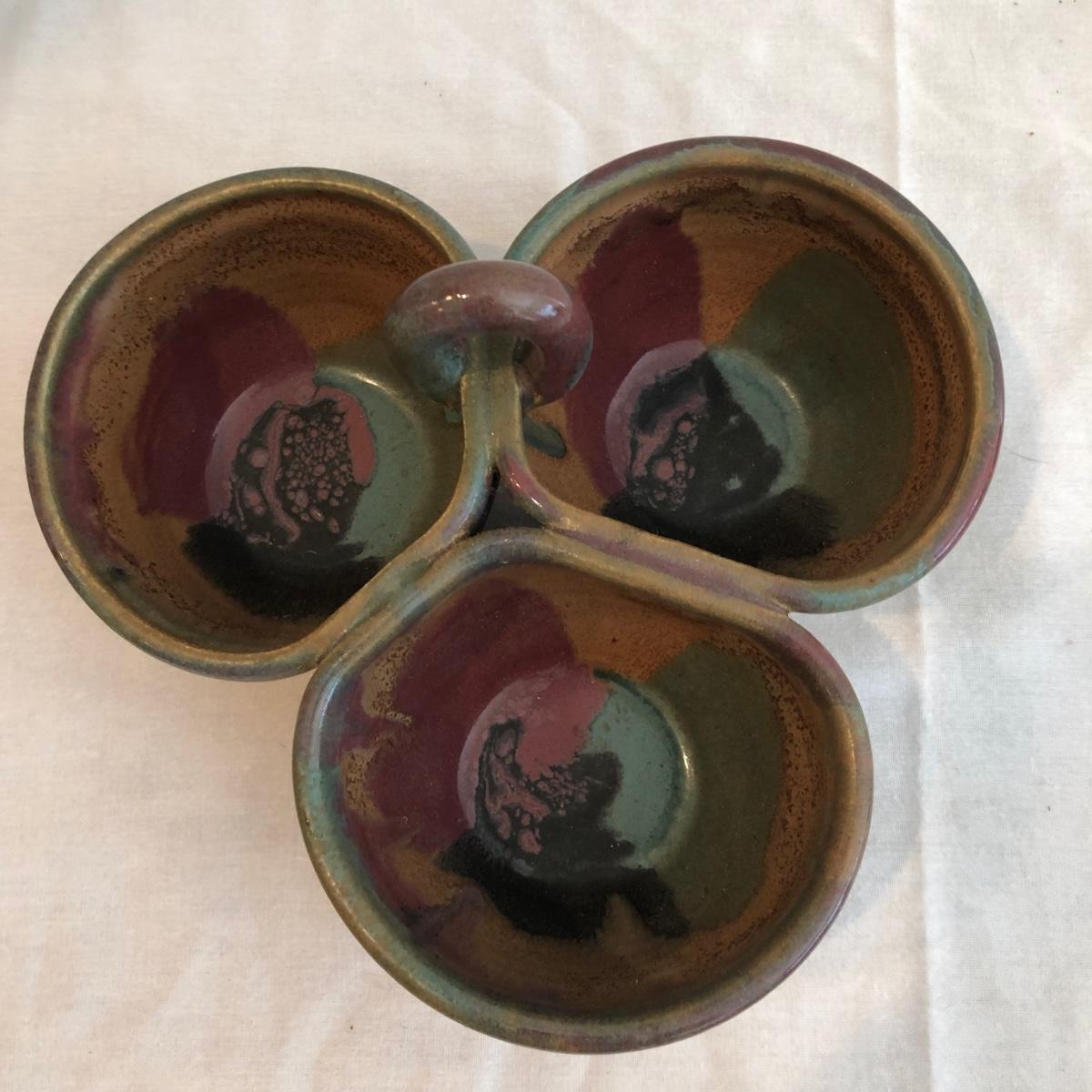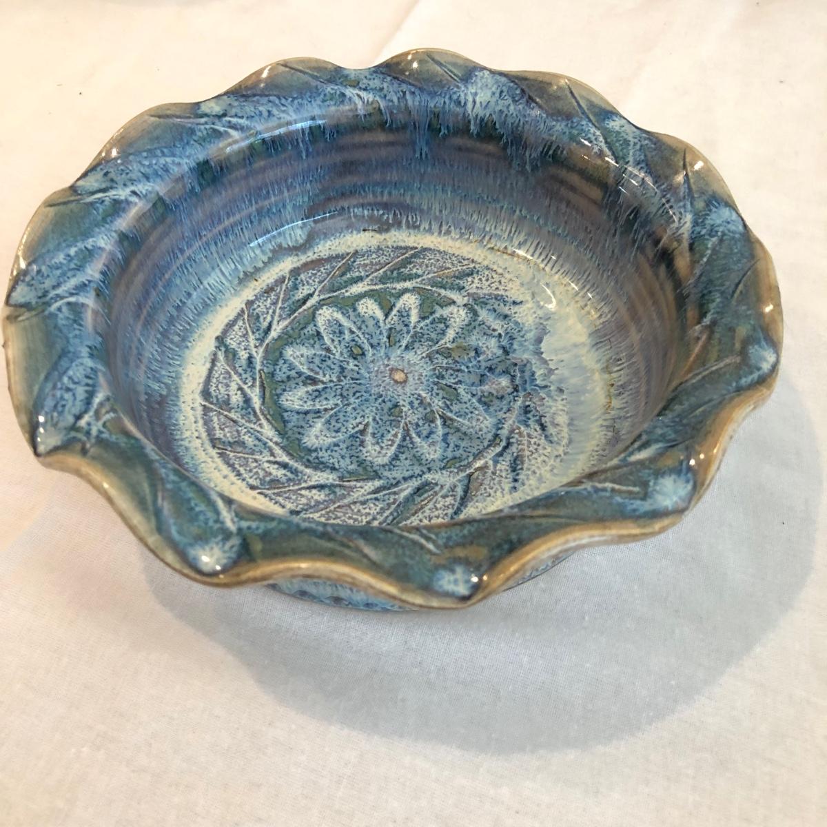 This collection of handmade pottery is glazed in blue, green, brown, and cream. Each of the 10 unique pieces is signed. This collection includes a Down Home Pottery Seagrove NC blue platter with handles that measures 11” x 9.5” x 2.5”. There is another platter, bowls, an oil lamp, and more. The small green bowl does have a surface crack from clay firing the thick base as pictured that is not very noticeable. Shipping available.