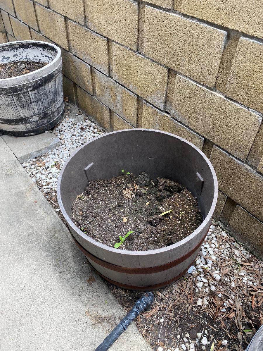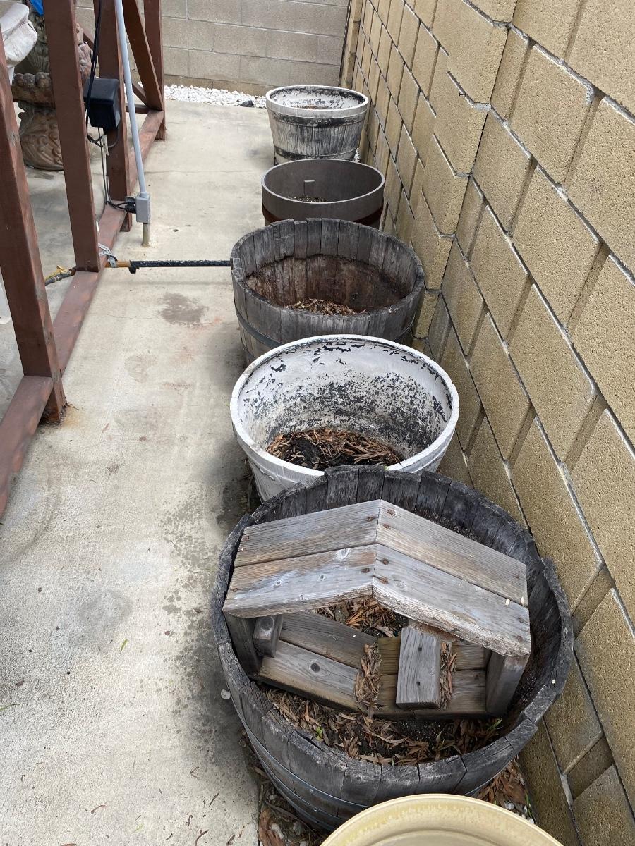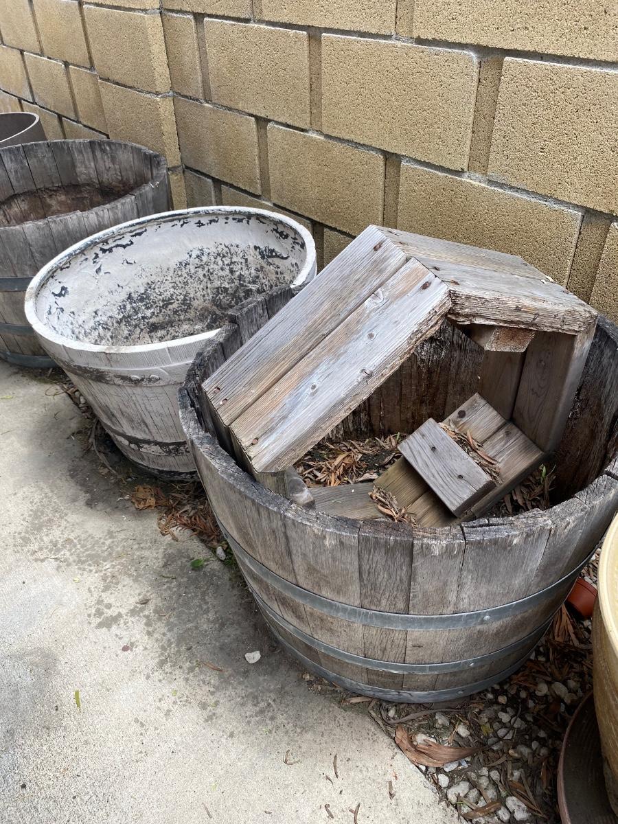 Lot of Wood and Faux Wood Whiskey Half Barrel Planters. 5 total. PICK UP CYPRESS 6/3.