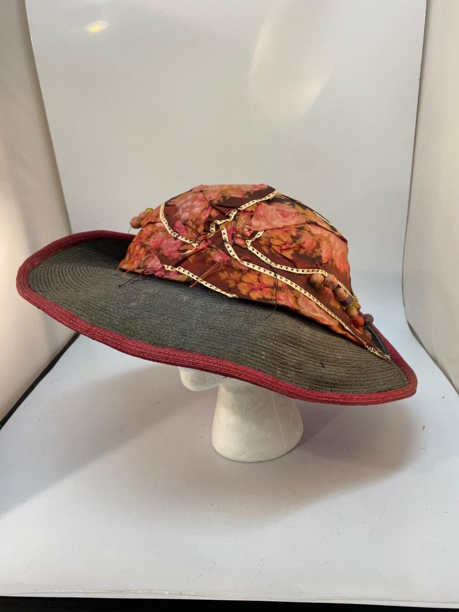 Vintage Burgundy Red & Black Wide Brim Straw Hat with Floral Details