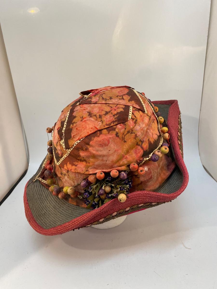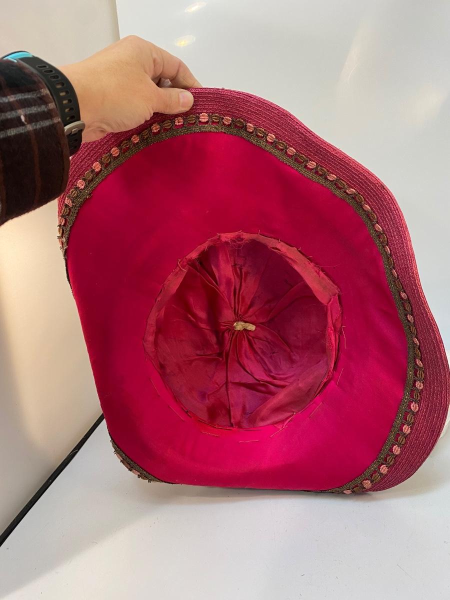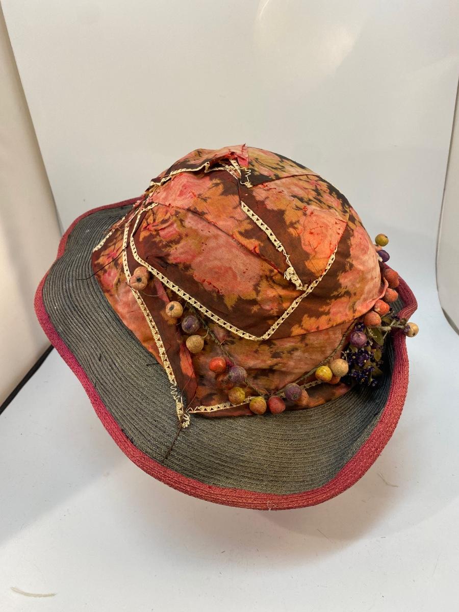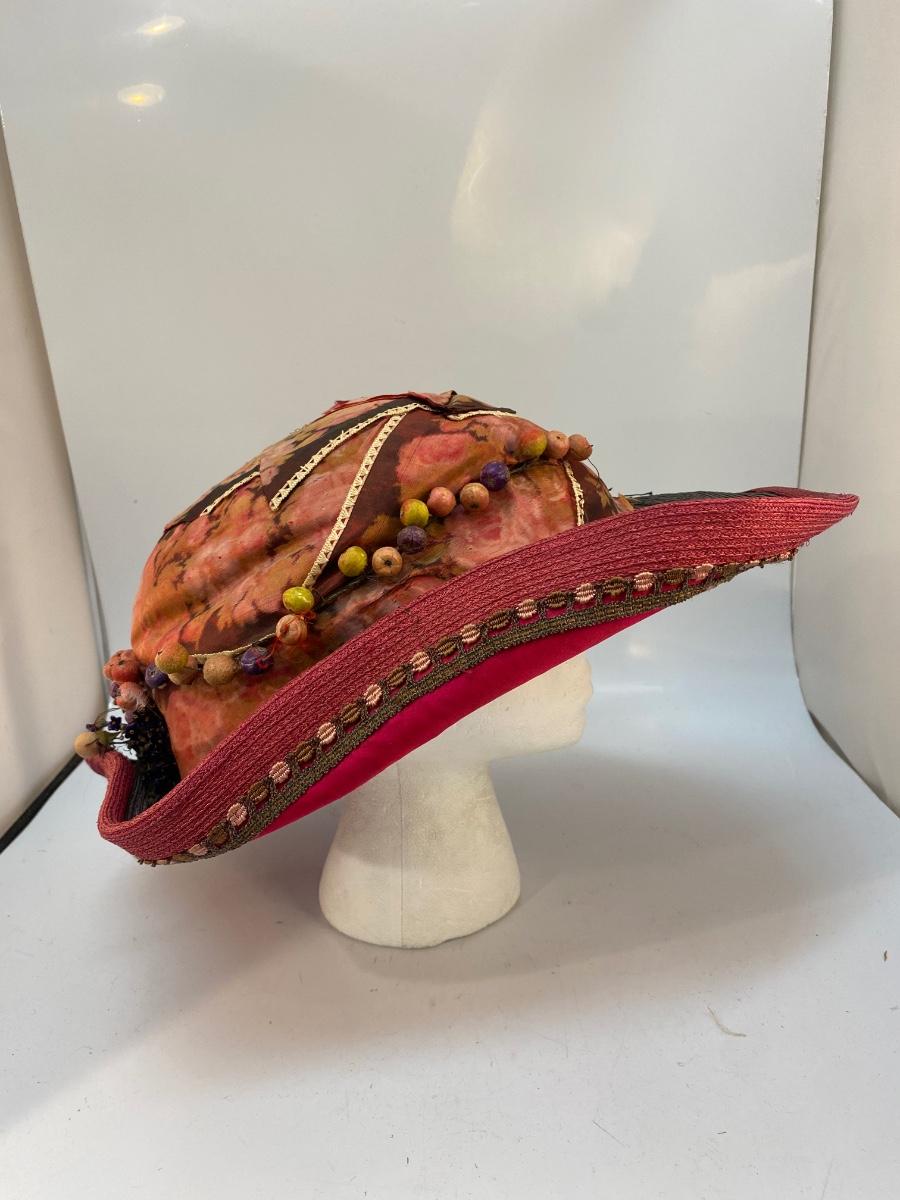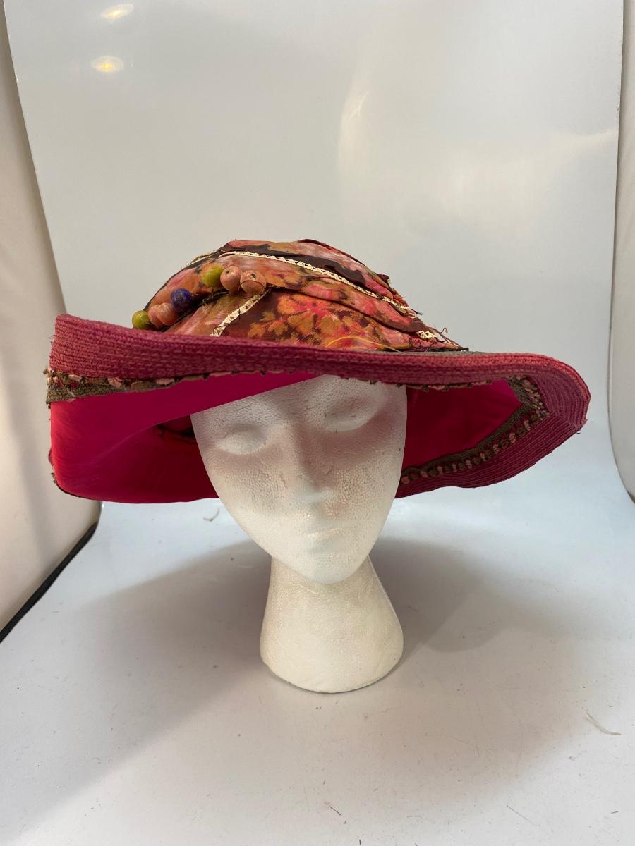 Vintage Burgundy Red & Black Wide Brim Straw Hat with Floral Details. In good vintage condition. May be discolored from age and storage. The floral applique on top may need to be reglued in places. No maker label.