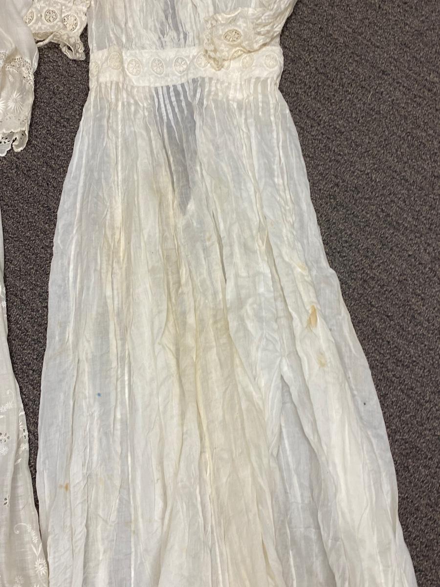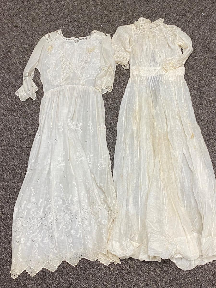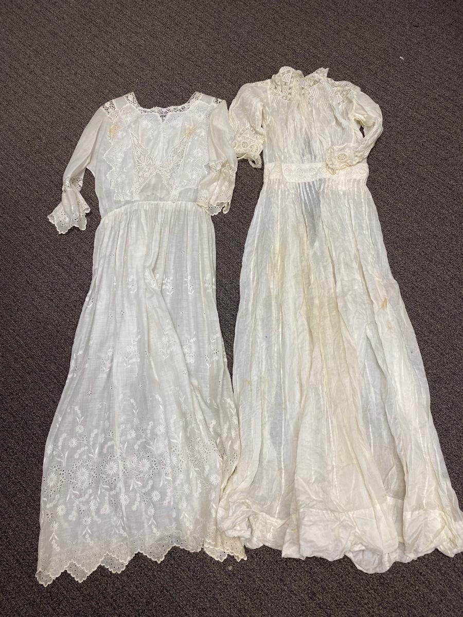 Pair of Vintage Antique Victorian White Cotton Gibson Girl Dresses Boho Romantic. Both have some discoloration and spots. The one on the right has some sleeve damage that needs to be repaired.