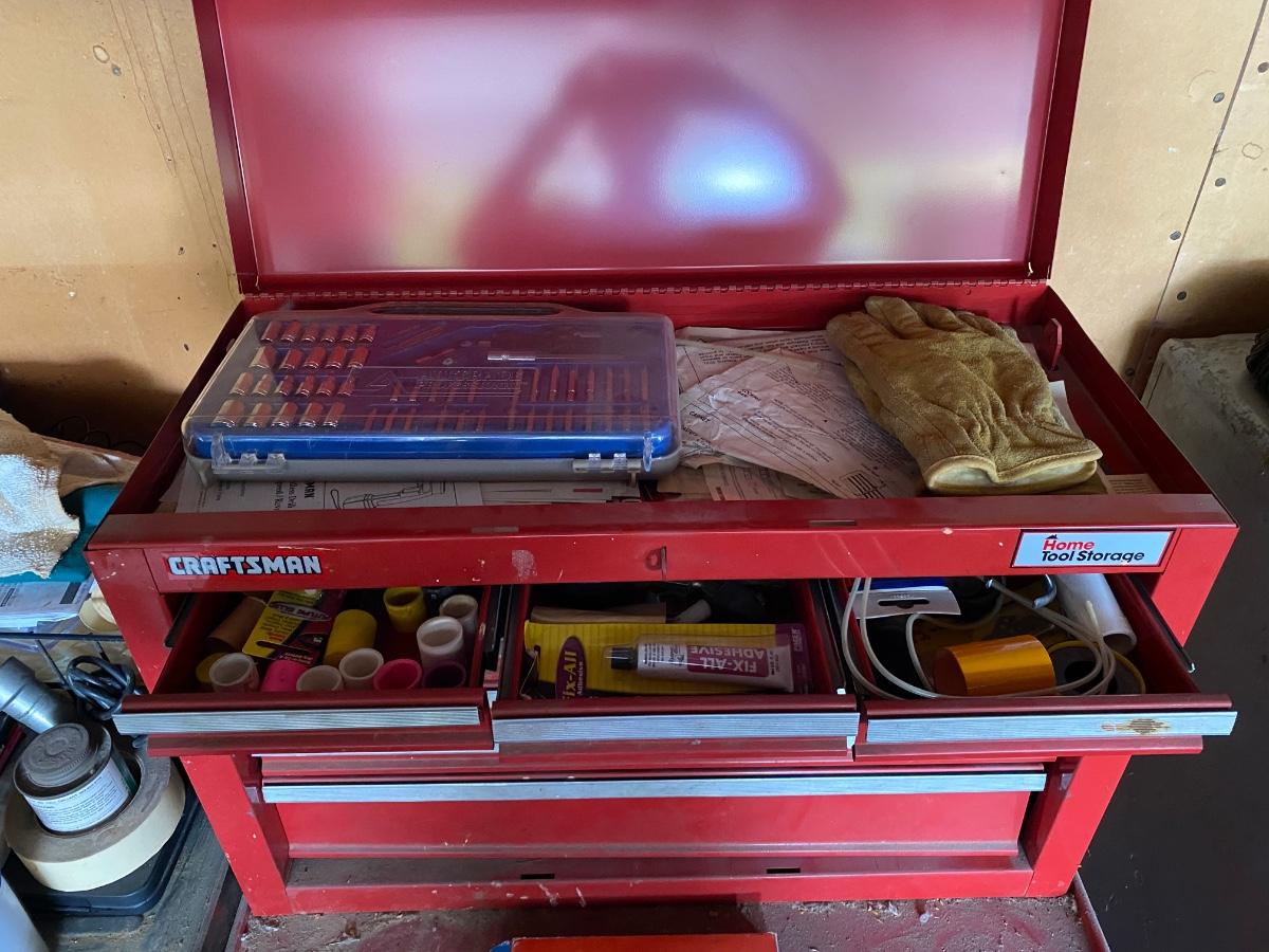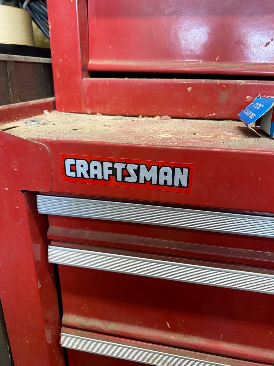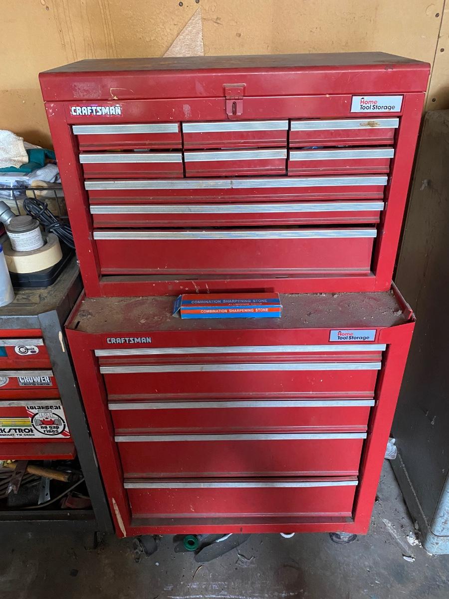 Craftsman Red Two-Piece Toolbox Roll Away Cabinet with All Tools & Hardware Included. In good used condition. Comes with all tools and hardware inside. PICK UP IN CYPRESS 6/3.