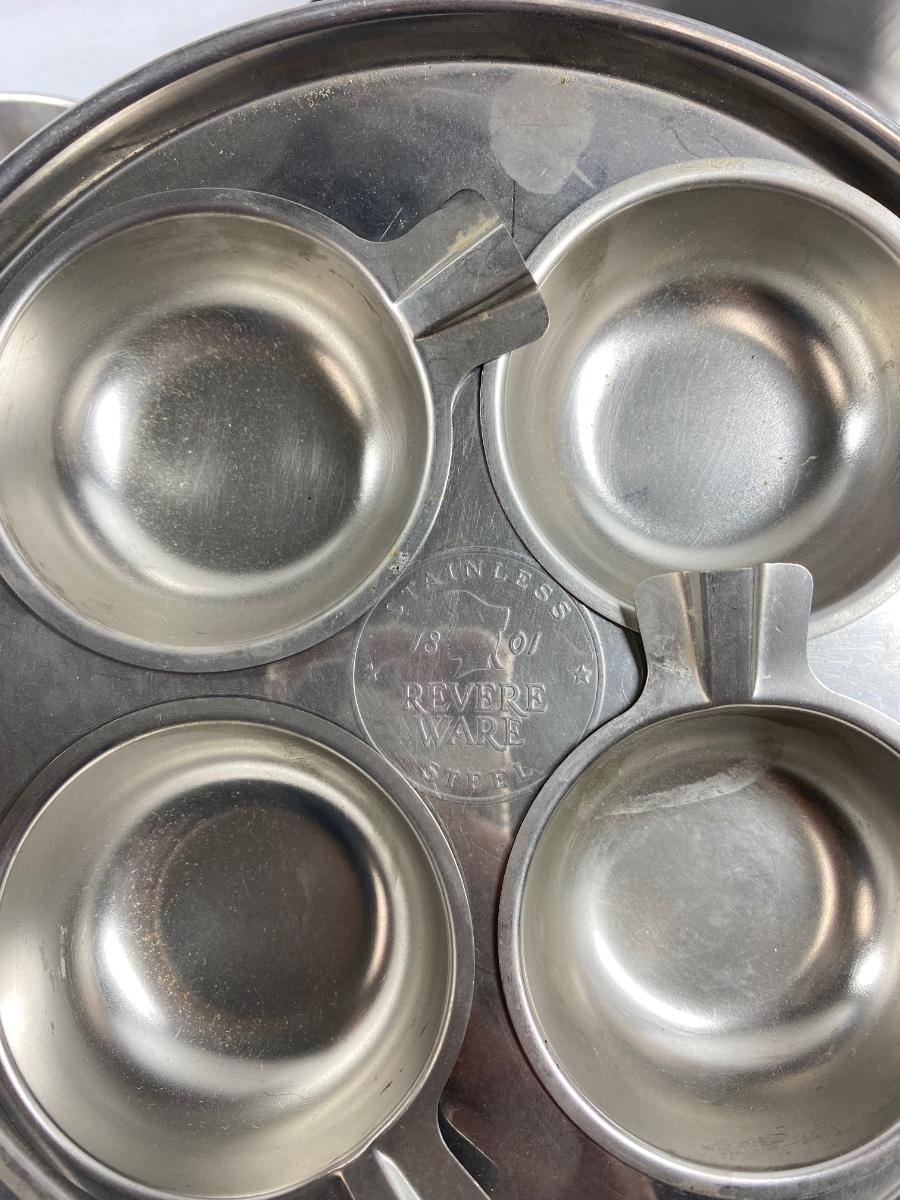Pair of Revere Ware Stainless Steel Fry Pan Pouched Egg with Lid. Both in good used condition, light signs of use.
