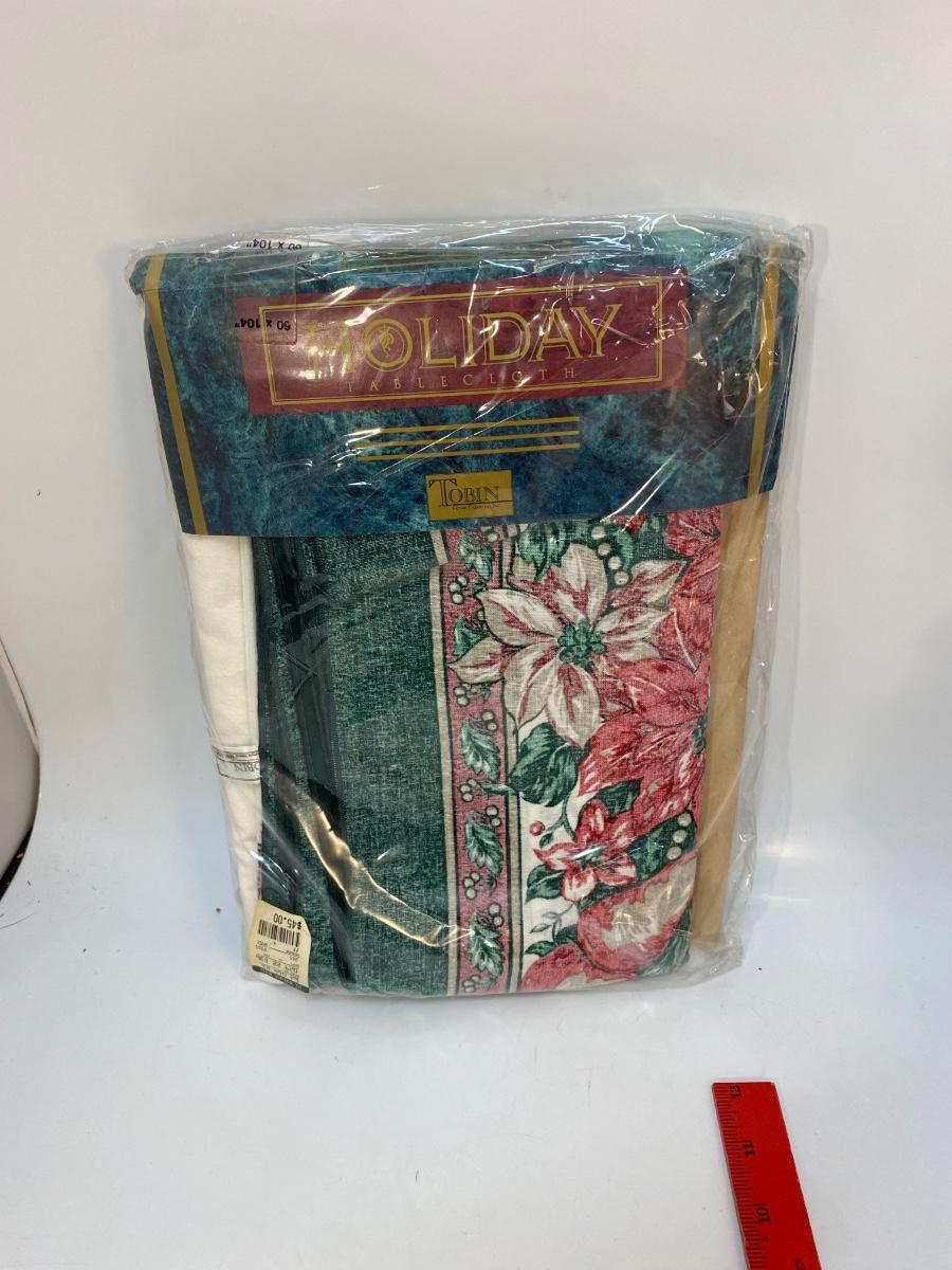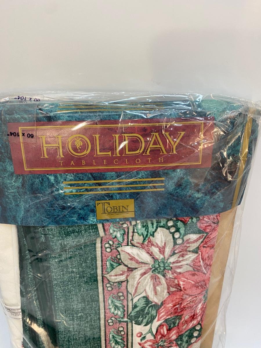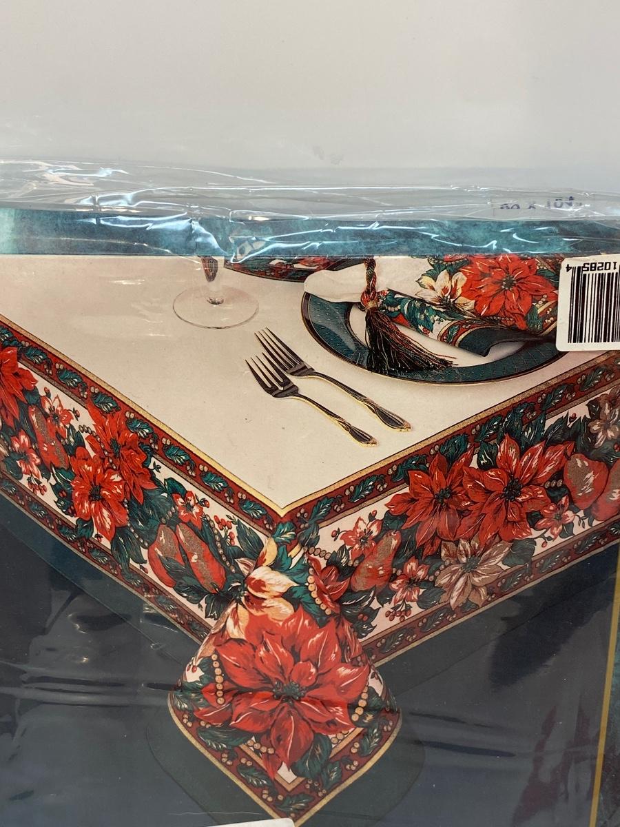 Festive Red Poinsettia Christmas Holiday Tablecloth Tobin by Mikasa. In original package but has been removed previously. 50"x104" size.