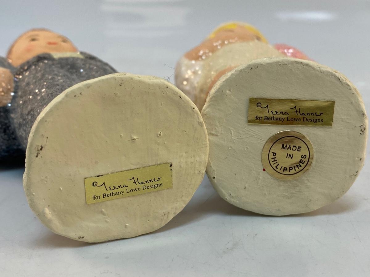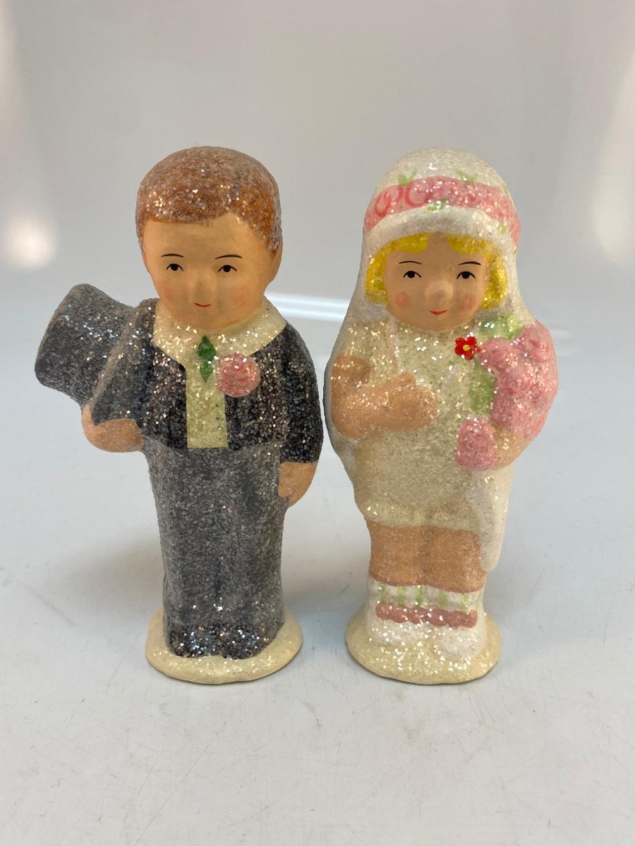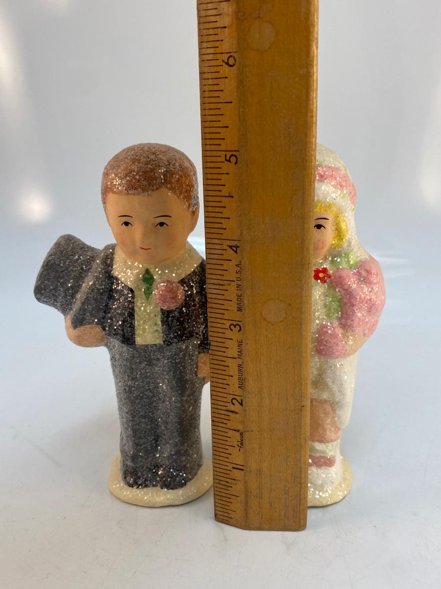 Vintage Glitter Covered Lightweight Plaster Composite Bride & Groom Figurines. Cute bride and groom, in good condition. Maker stickers on the bottom. 5" size.