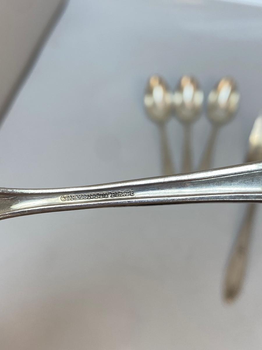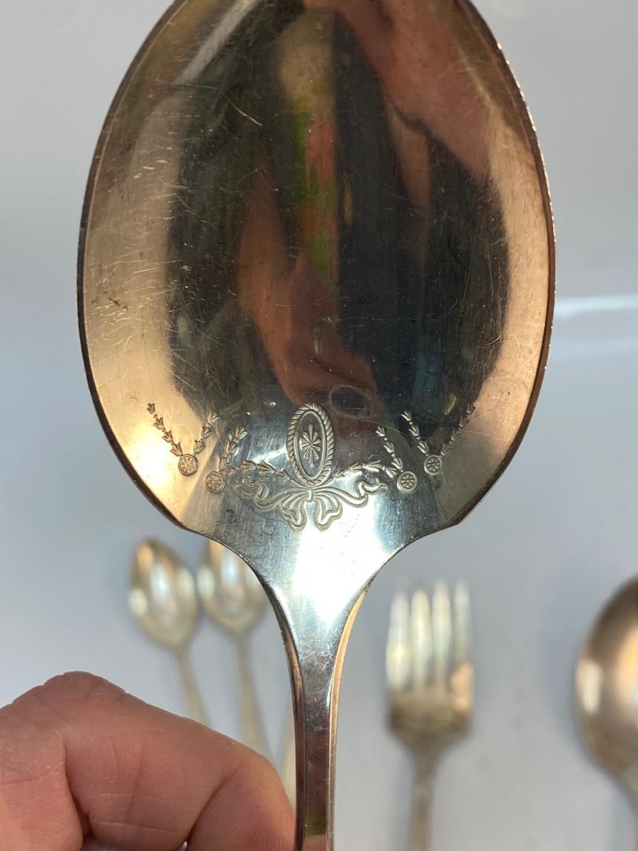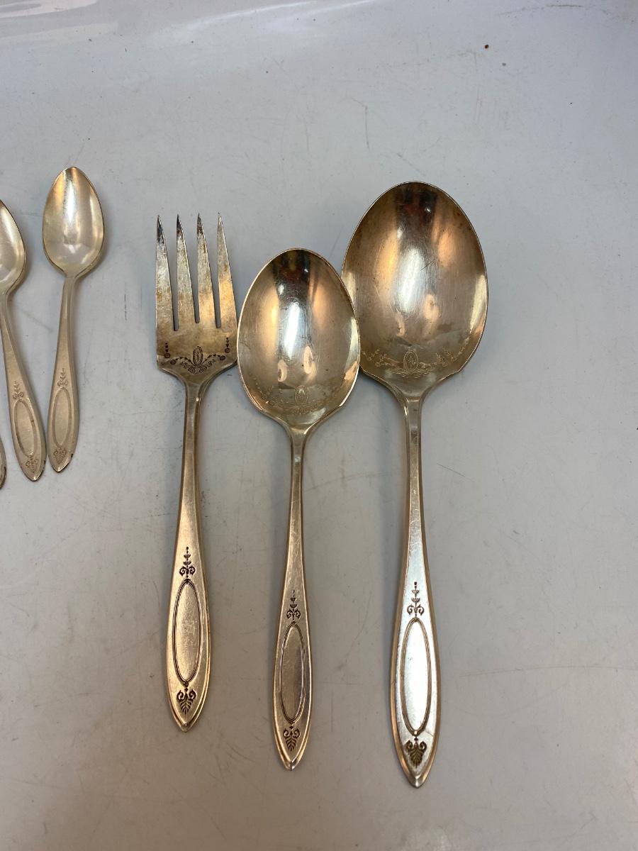 Vintage Silver Plate Hostess Serving Flatware Silverware Meat Fork Spoons. Two large serving spoons, meat fork, and 3 small teaspoons