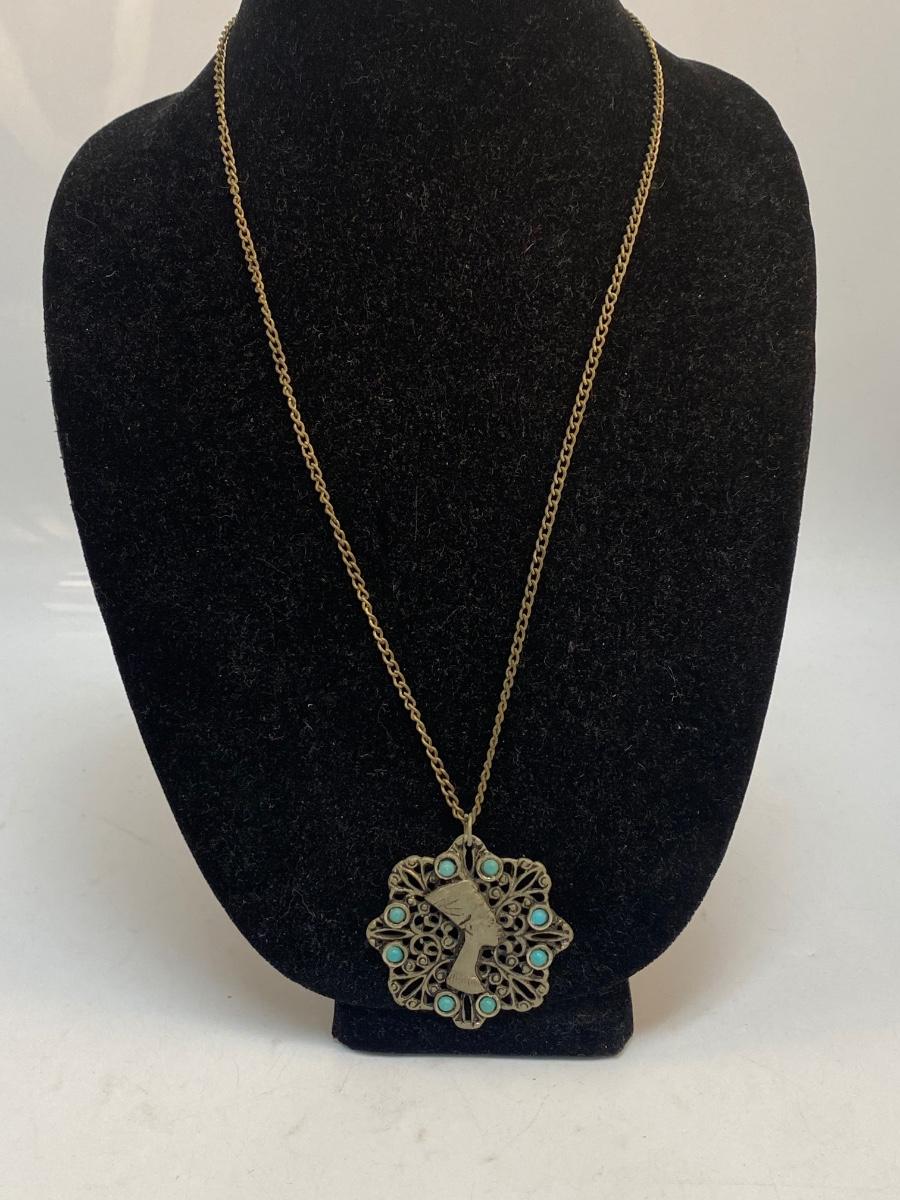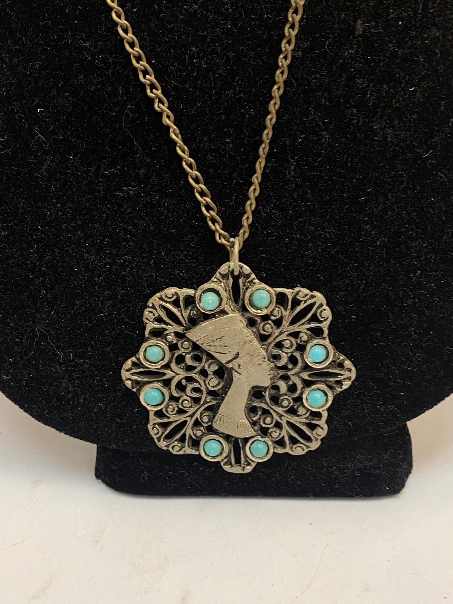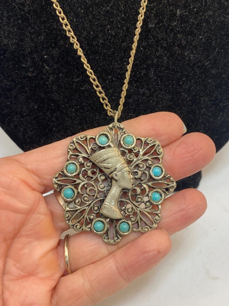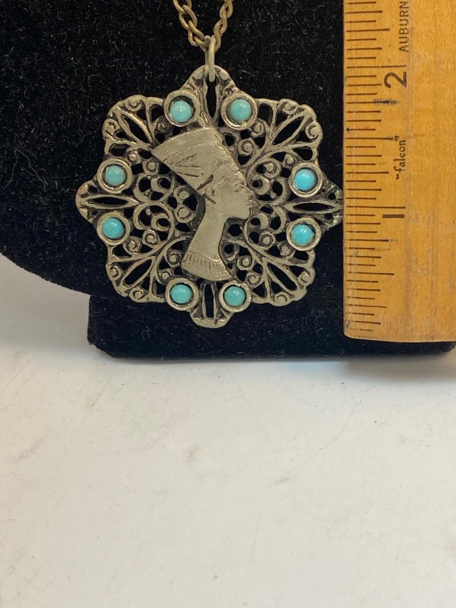 Vintage Silver Tone Egyptian Revival Nefertiti Faux Turquoise Cabochon Pendant Medallion Necklace