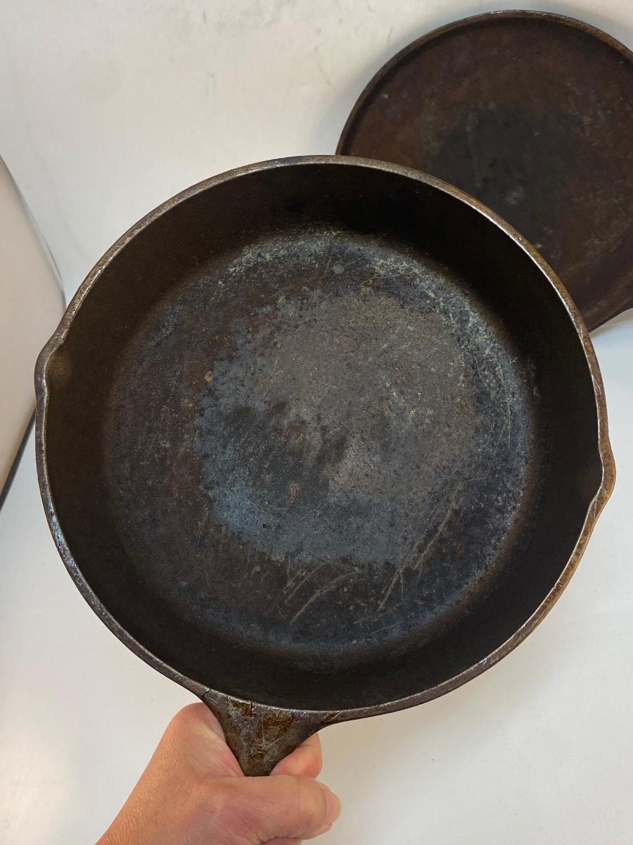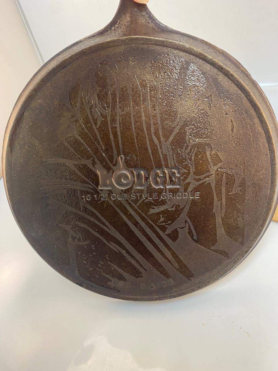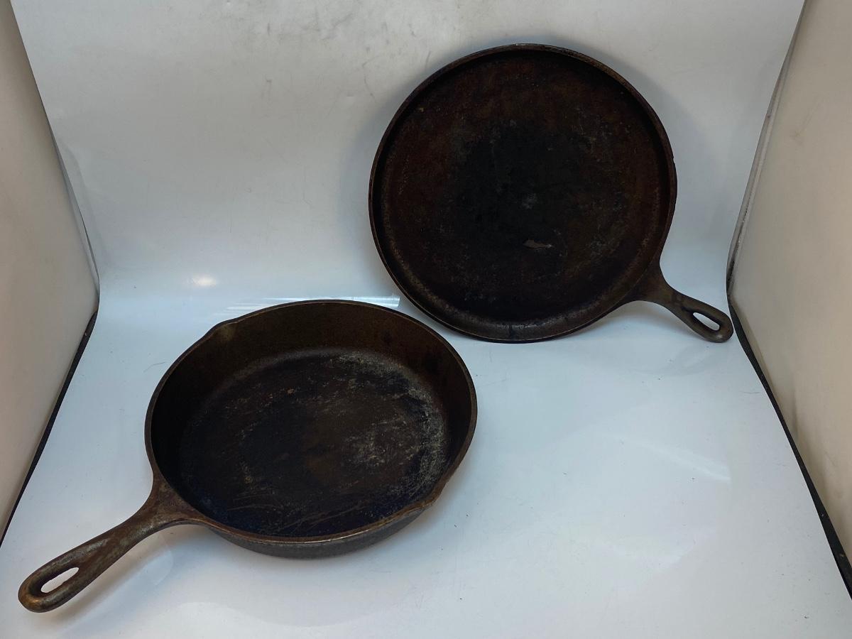 Pair of Lodge Brand Cast Iron Skillet Frying Pan Flat Griddle. In fair used condition. Could use a cleaning and reseasoning.