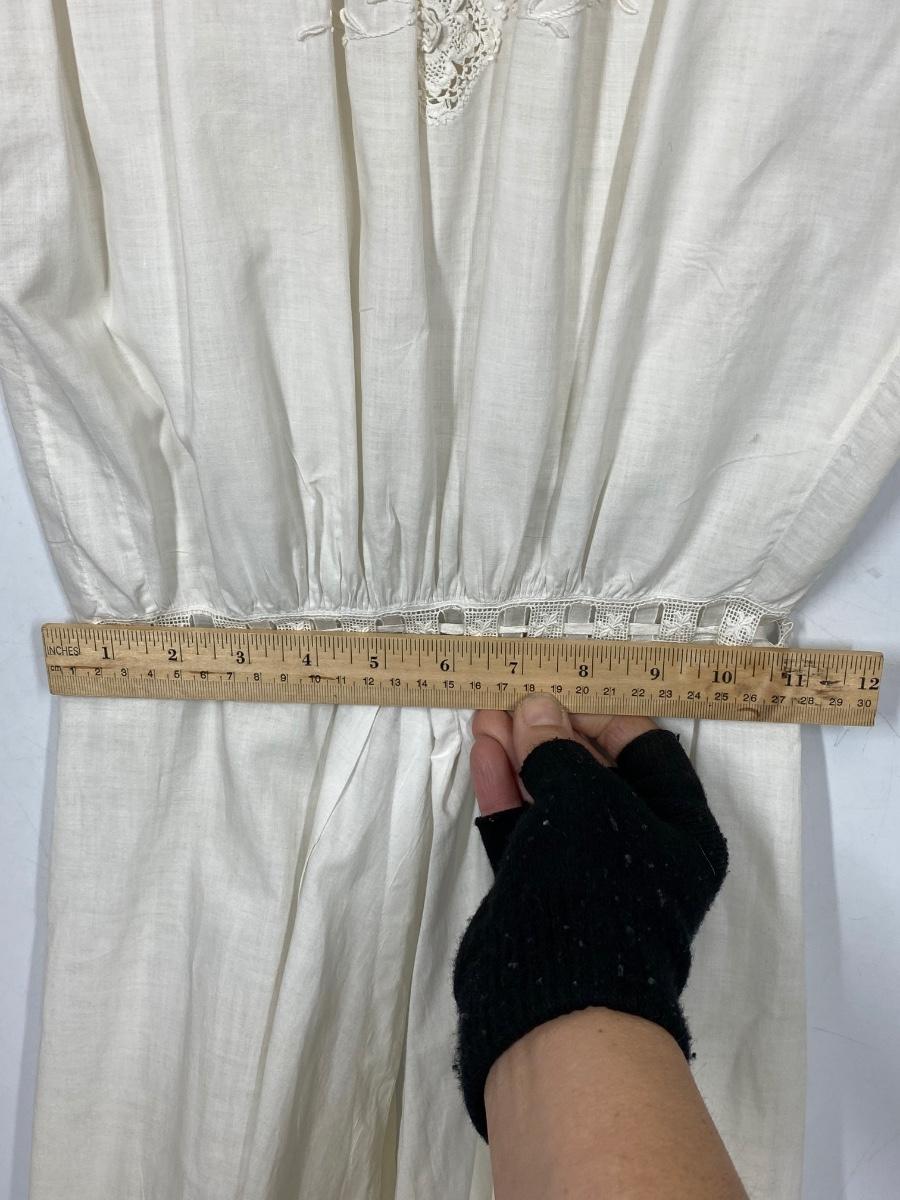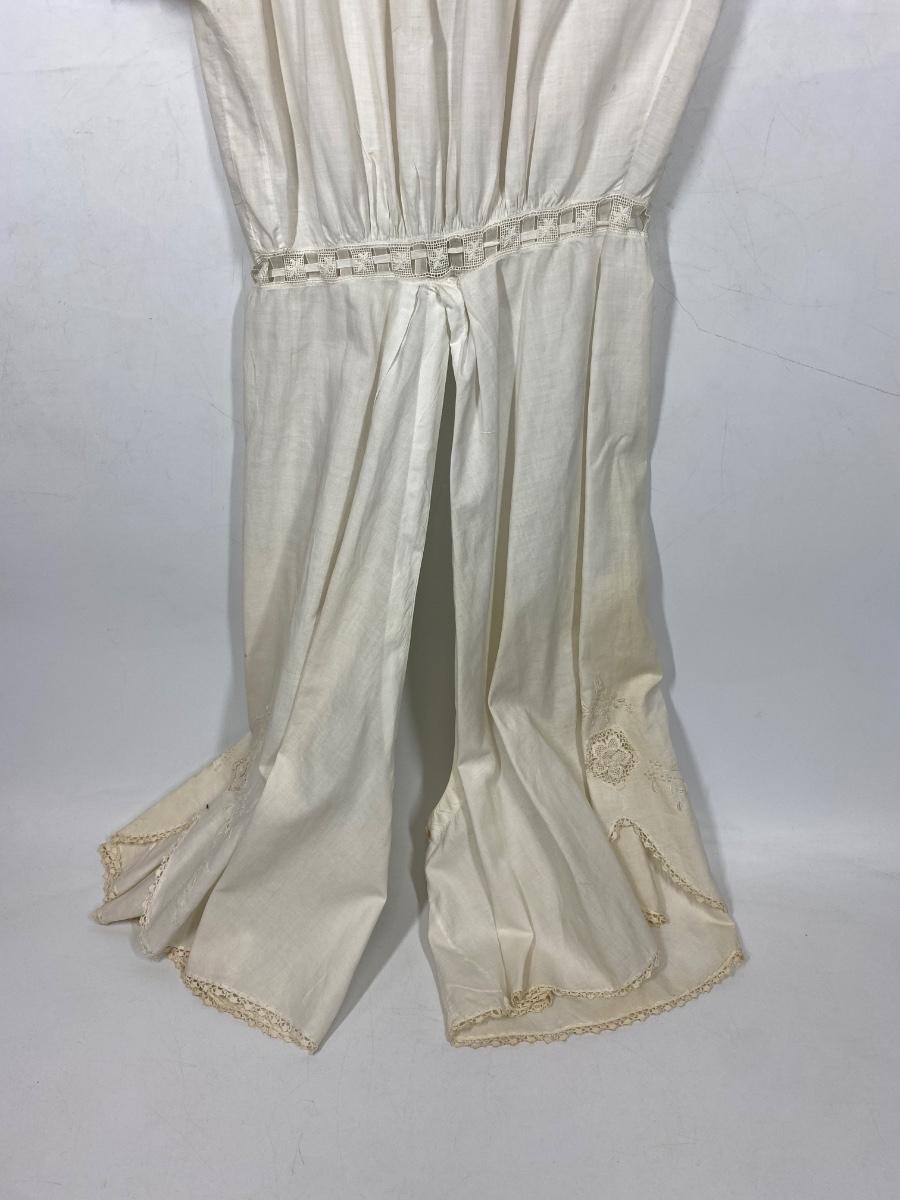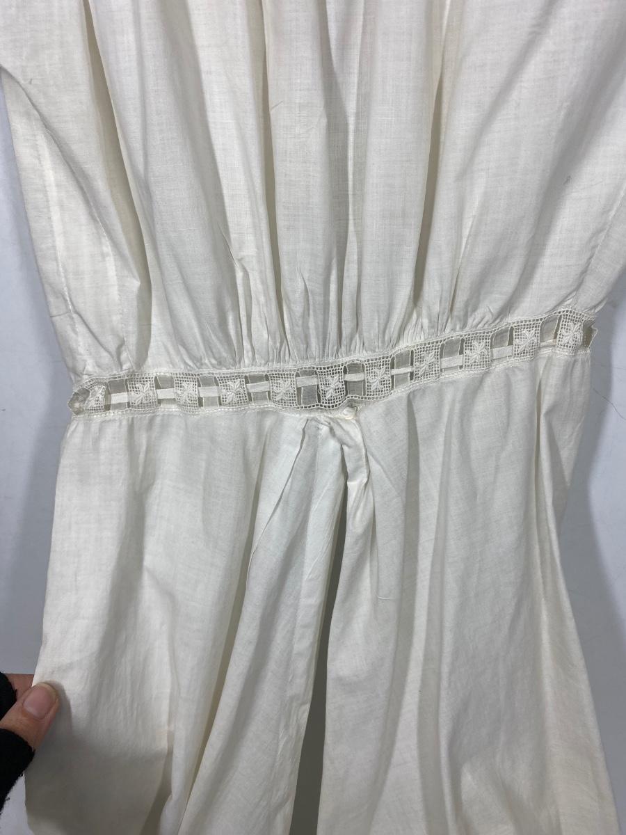 Vintage Victorian Gibson Girl White Cotton Romper Undergarment. In good condition. Cap sleeve, knee length leg. Open inner thigh and crotch. May have light discolor but no holes or stains. Cute lace embroidery details. Maybe a size 8 or so.