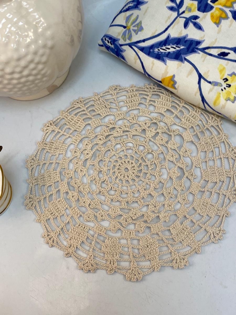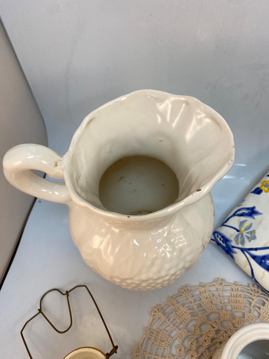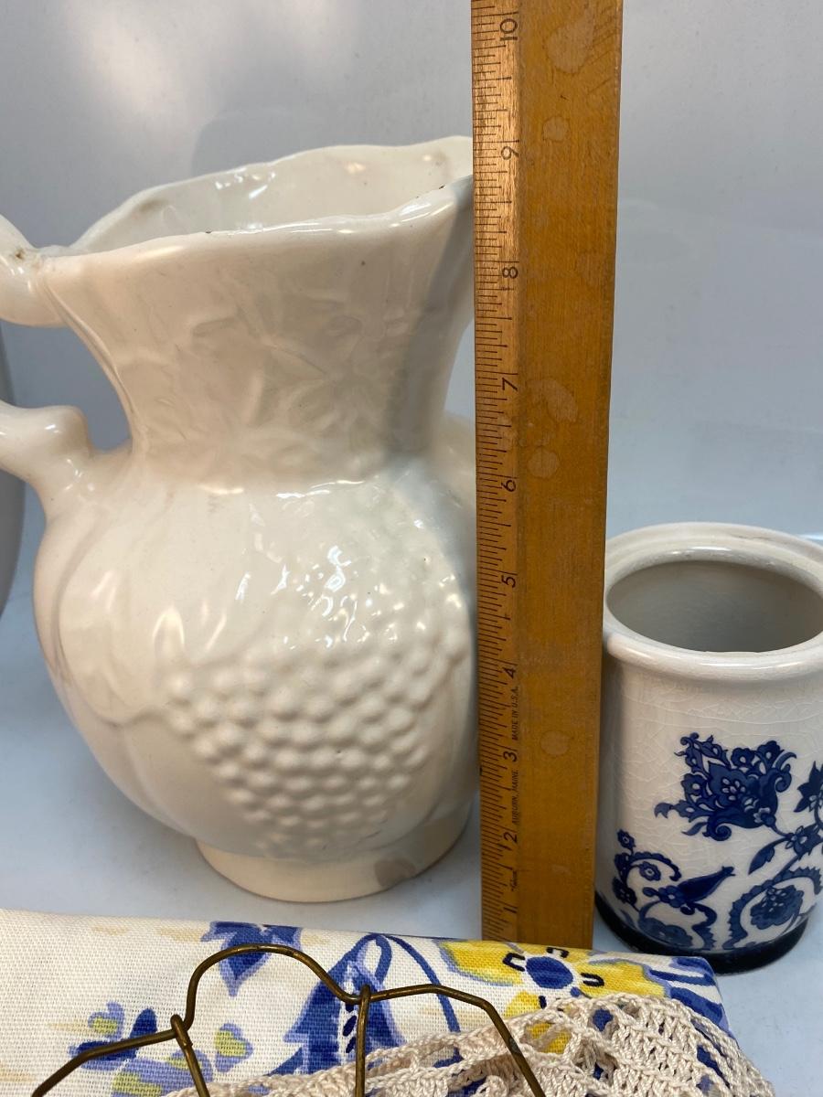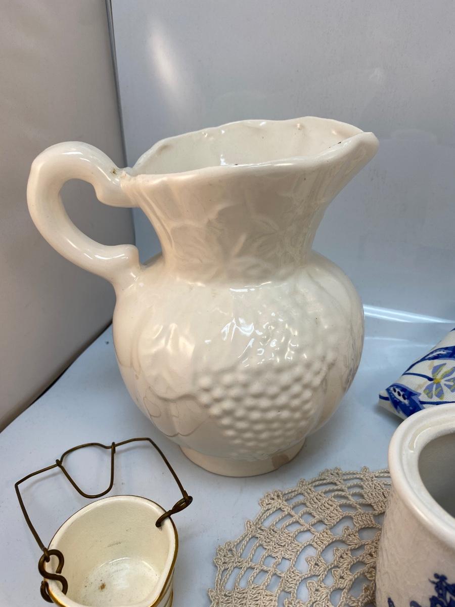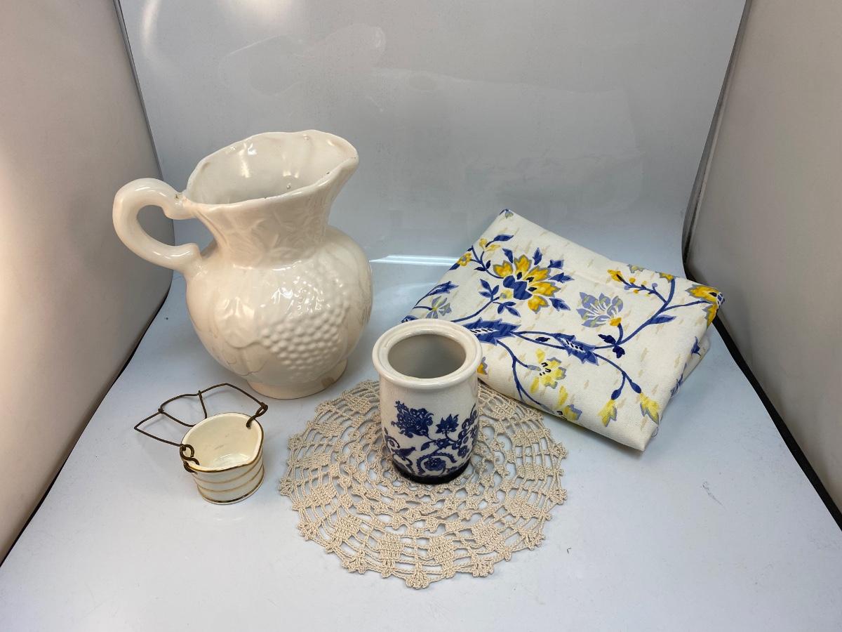 Vintage Decor Lot White Yellow and Blue. Various ceramic pieces, a doily, and fabric. Ceramic may have crazing and the pitcher does have a couple chips in the bottom. Fabric is about 3'x5'.