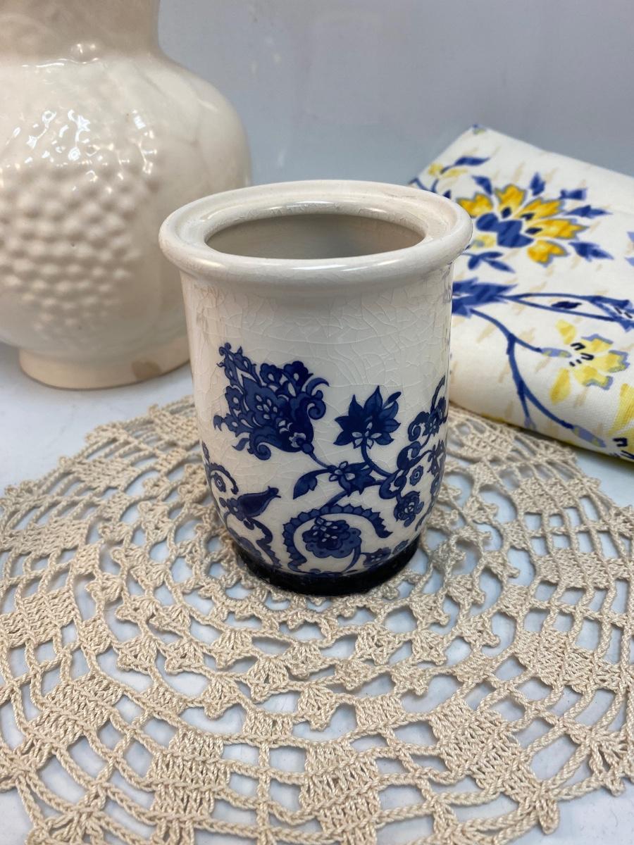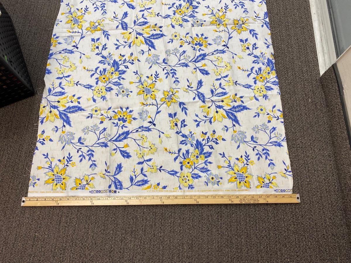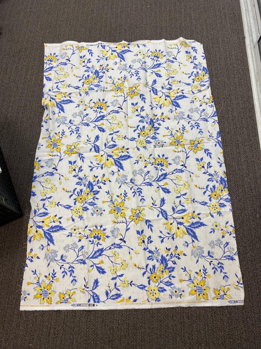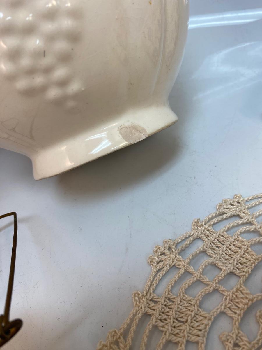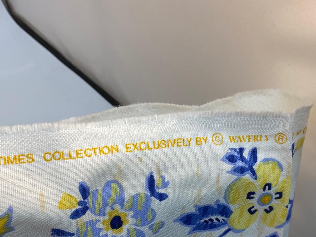 Vintage Decor Lot White Yellow and Blue. Various ceramic pieces, a doily, and fabric. Ceramic may have crazing and the pitcher does have a couple chips in the bottom. Fabric is about 3'x5'.
