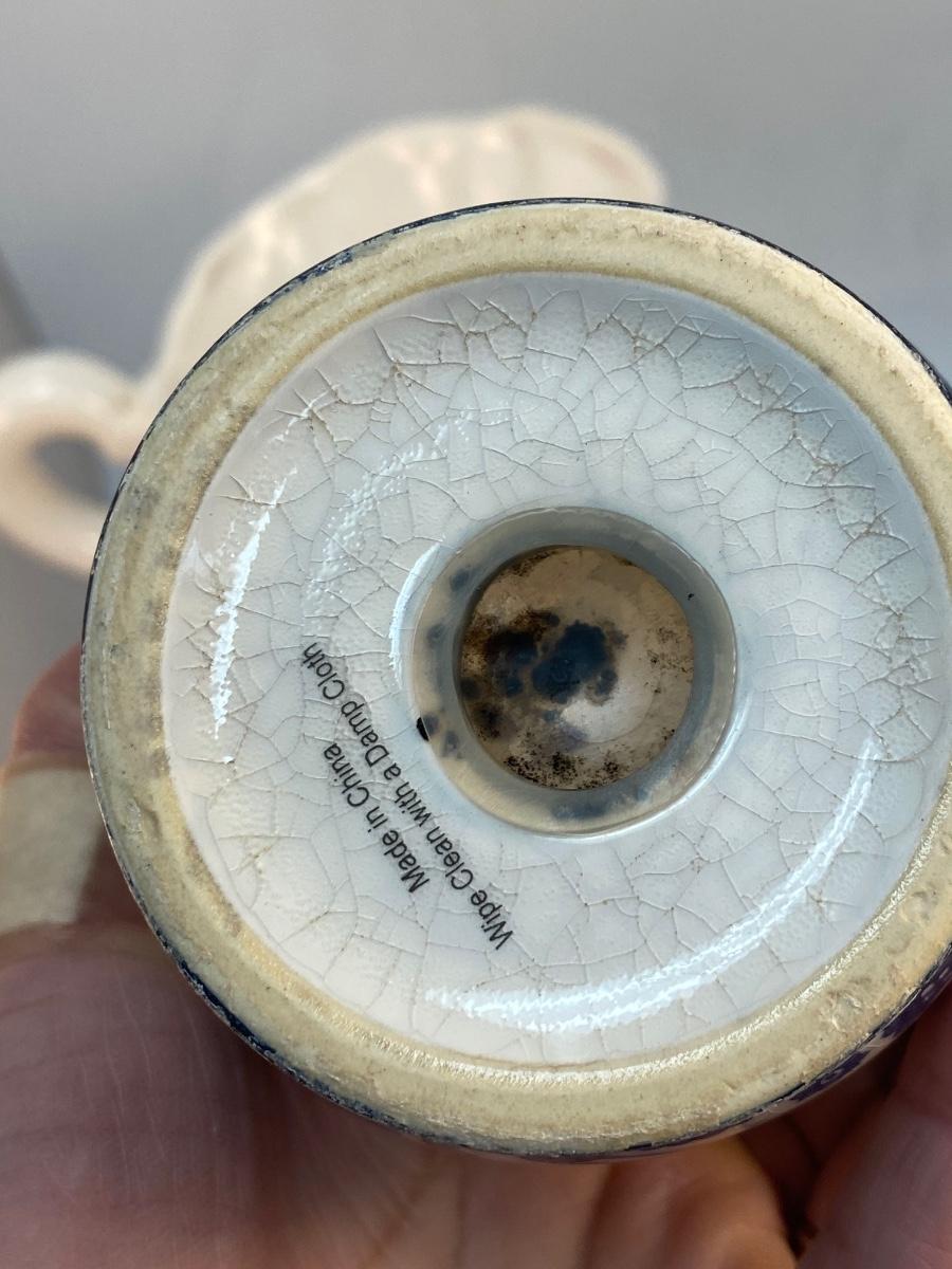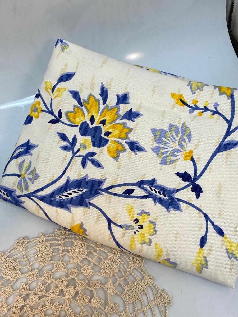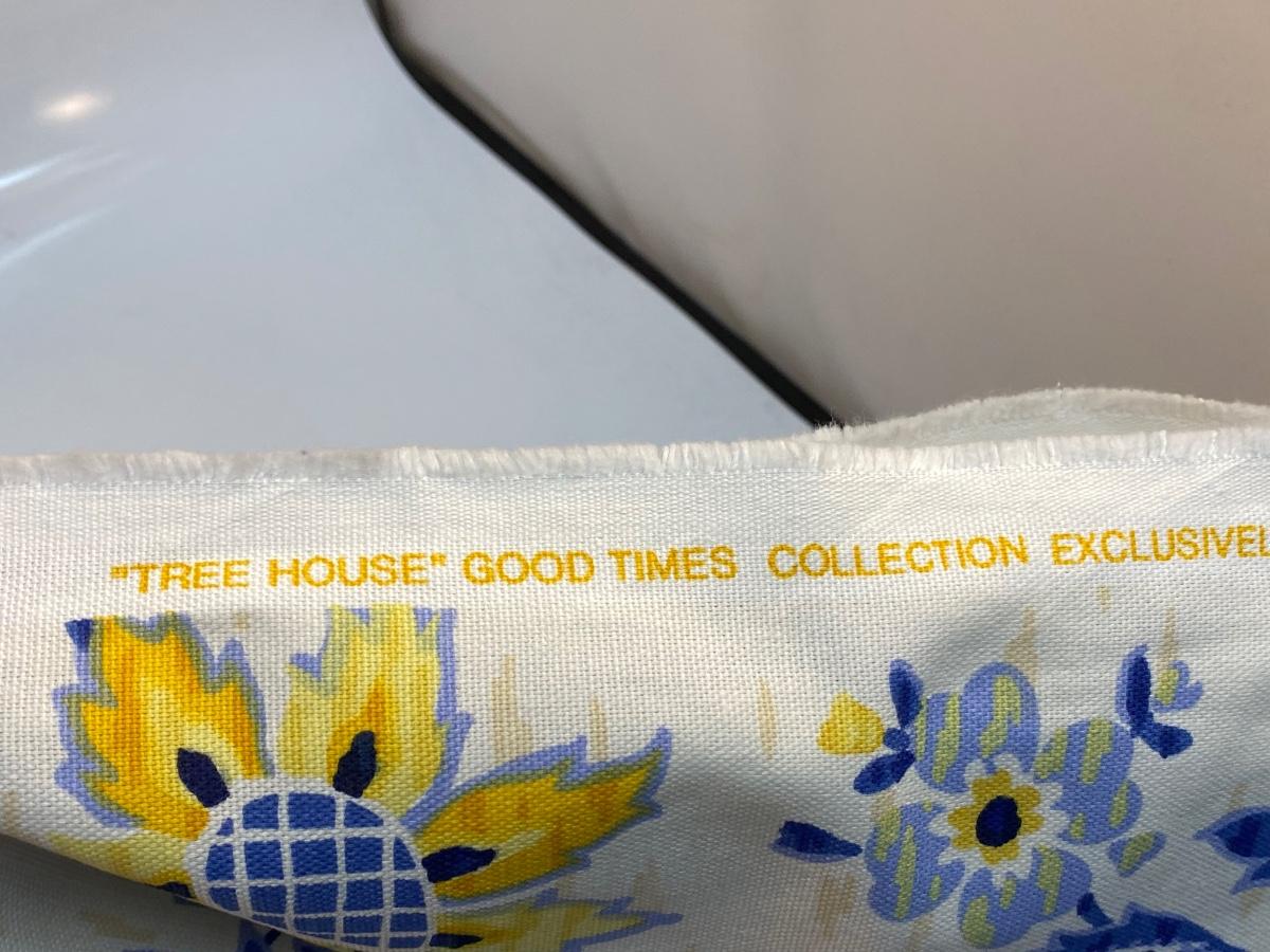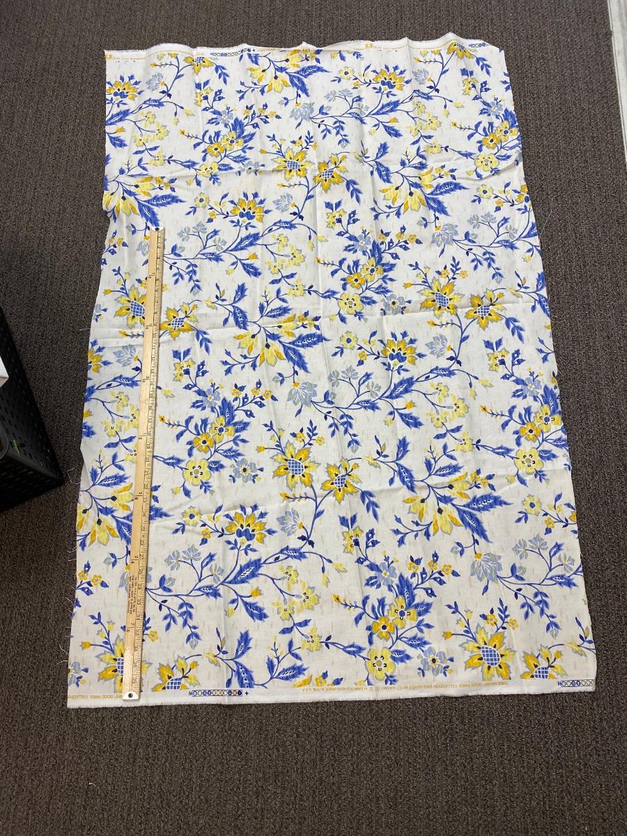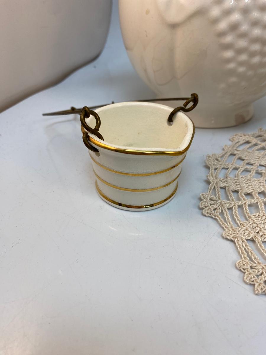 Vintage Decor Lot White Yellow and Blue. Various ceramic pieces, a doily, and fabric. Ceramic may have crazing and the pitcher does have a couple chips in the bottom. Fabric is about 3'x5'.