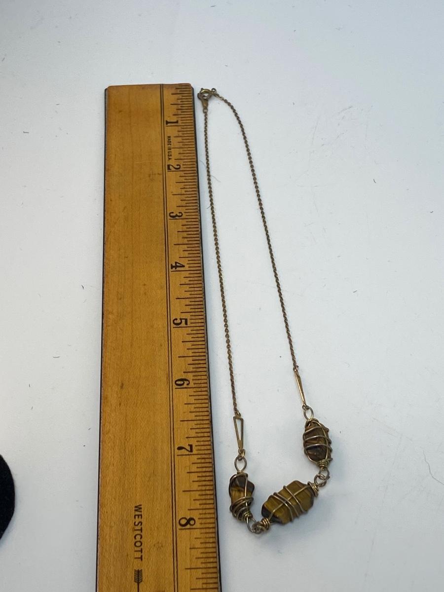 Gold Tone Wrapped Tigers Eye Three Stone Necklace Choker. Gold tone metal. In good condition. About 8" length.