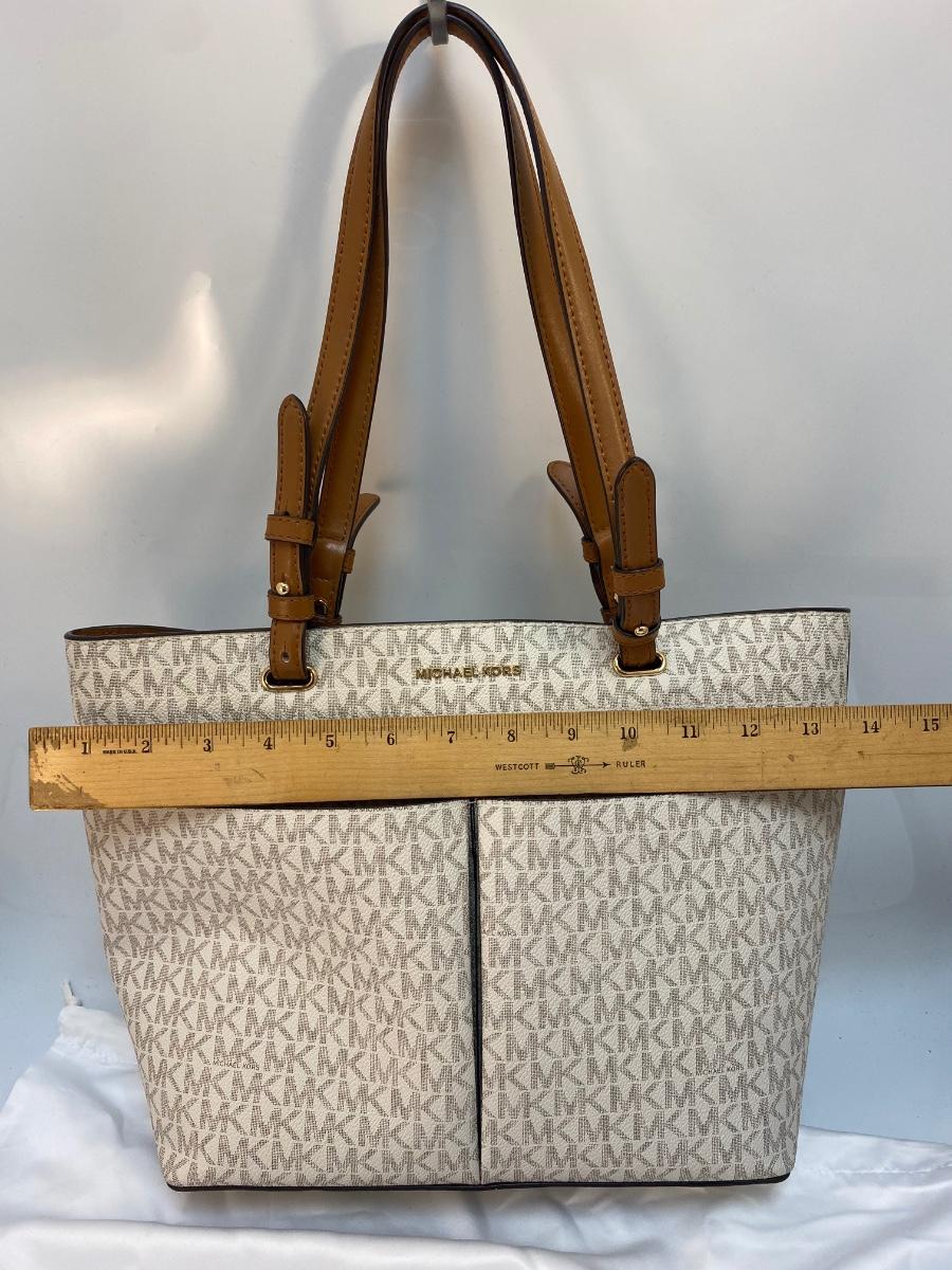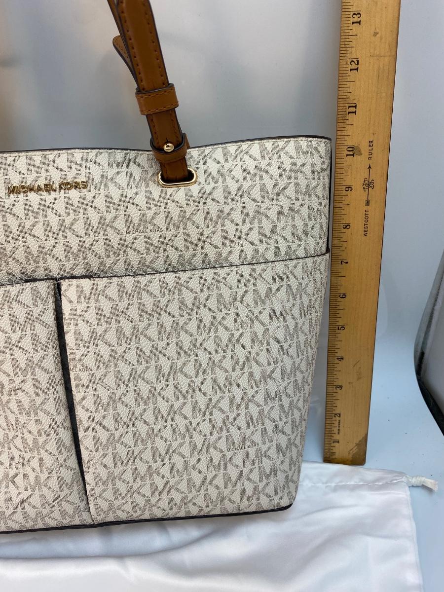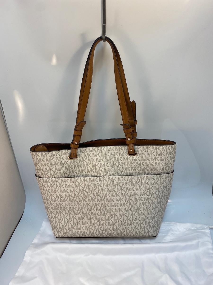 Michael Kors Signature MK Pattern White & Beige Handbag Purse. In good previously used condition. Still has original sales tag attached but it has been used. Comes with dust protection storage bag.