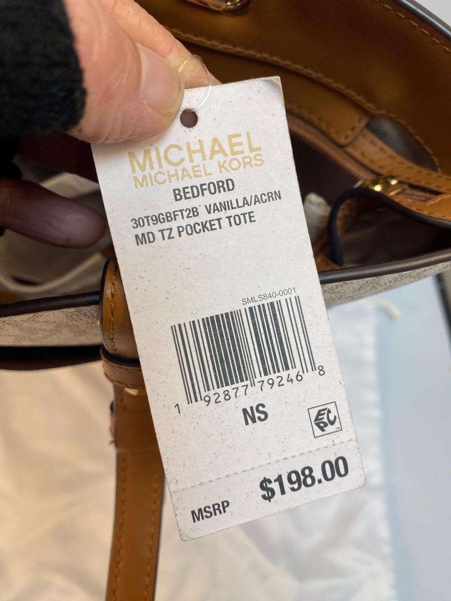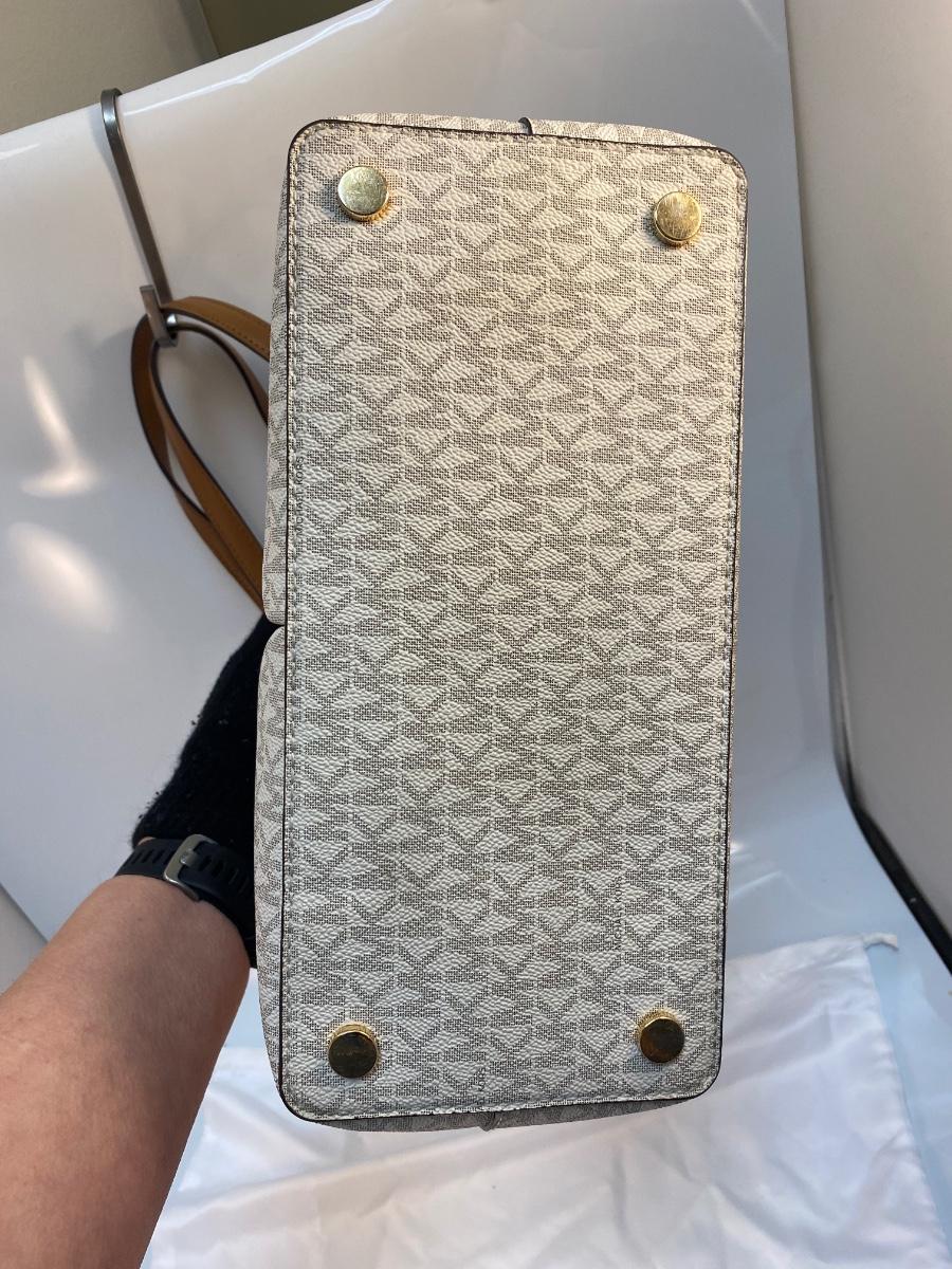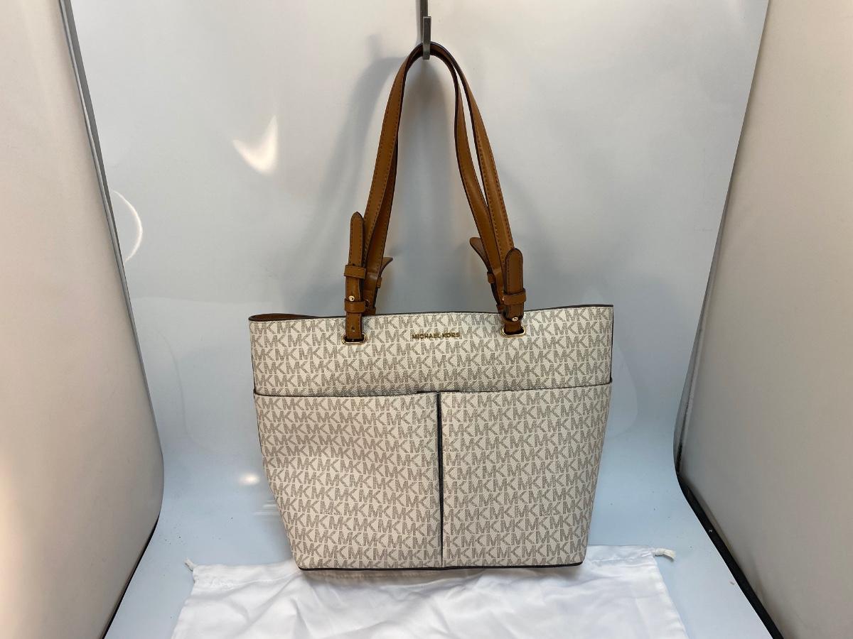 Michael Kors Signature MK Pattern White & Beige Handbag Purse. In good previously used condition. Still has original sales tag attached but it has been used. Comes with dust protection storage bag.