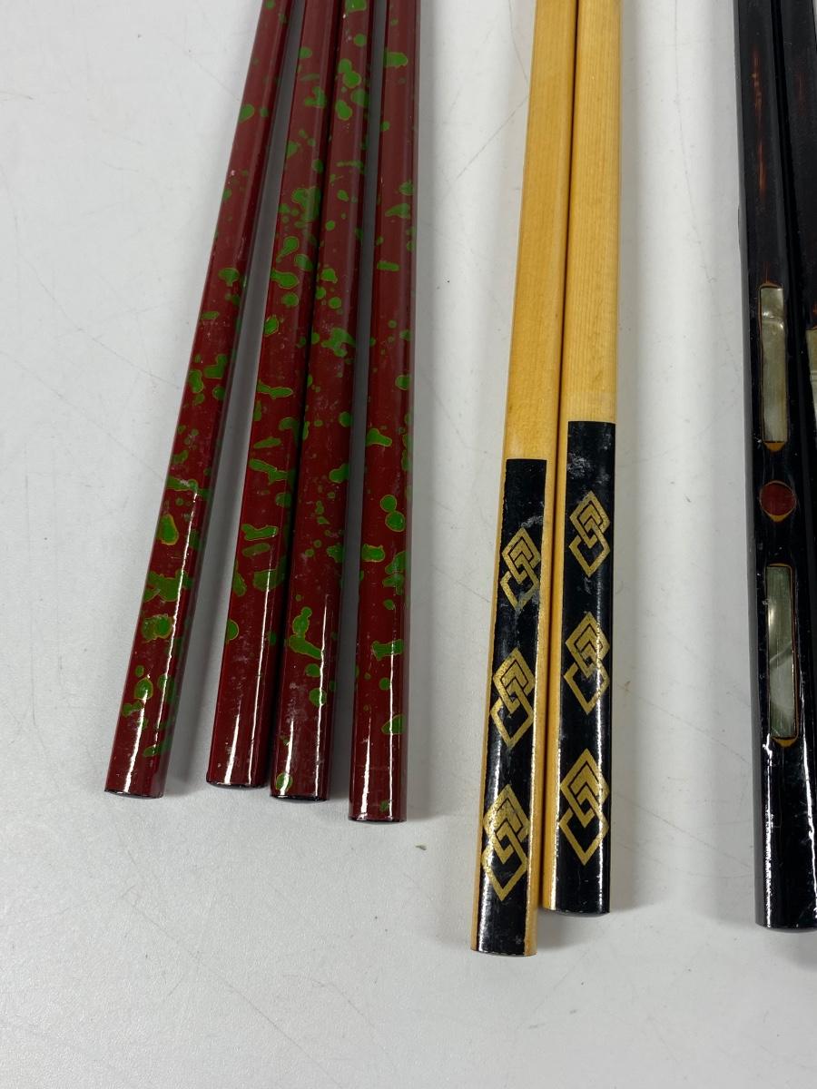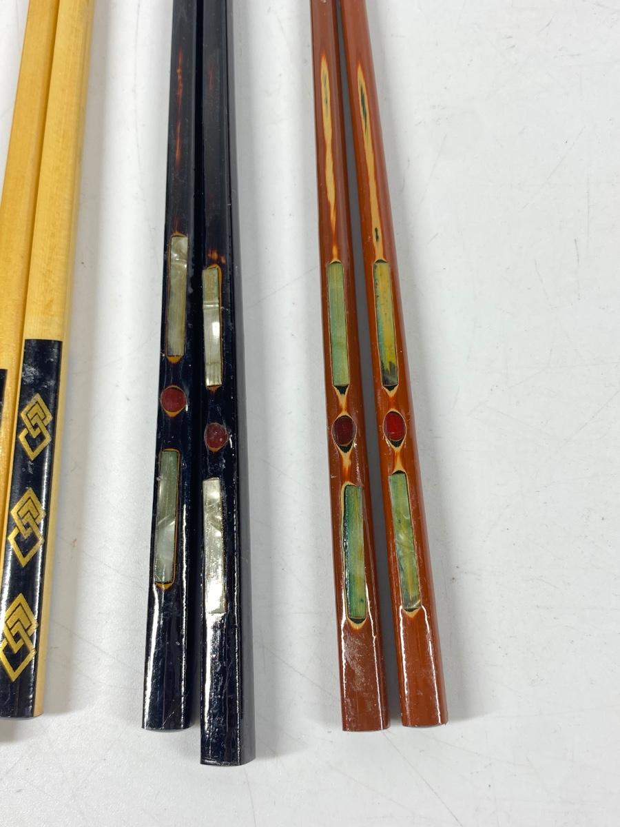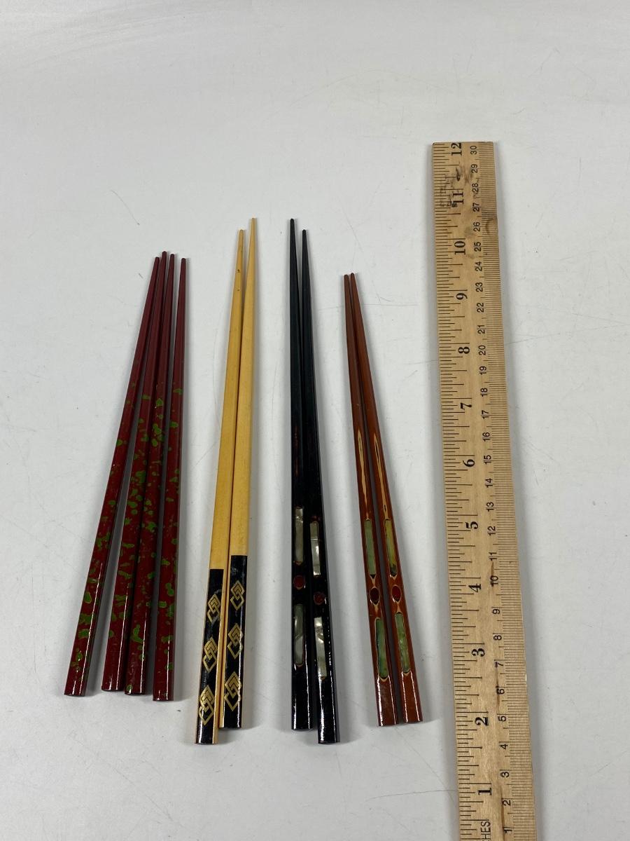 Set of 5 Pairs of Wood Chopsticks Mother of Pearl Inlaid. Two pairs have inlaid shell. All are in good condition.