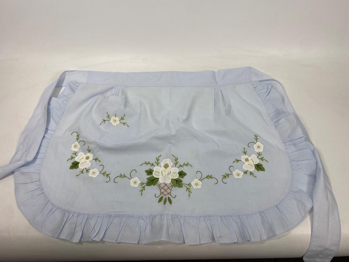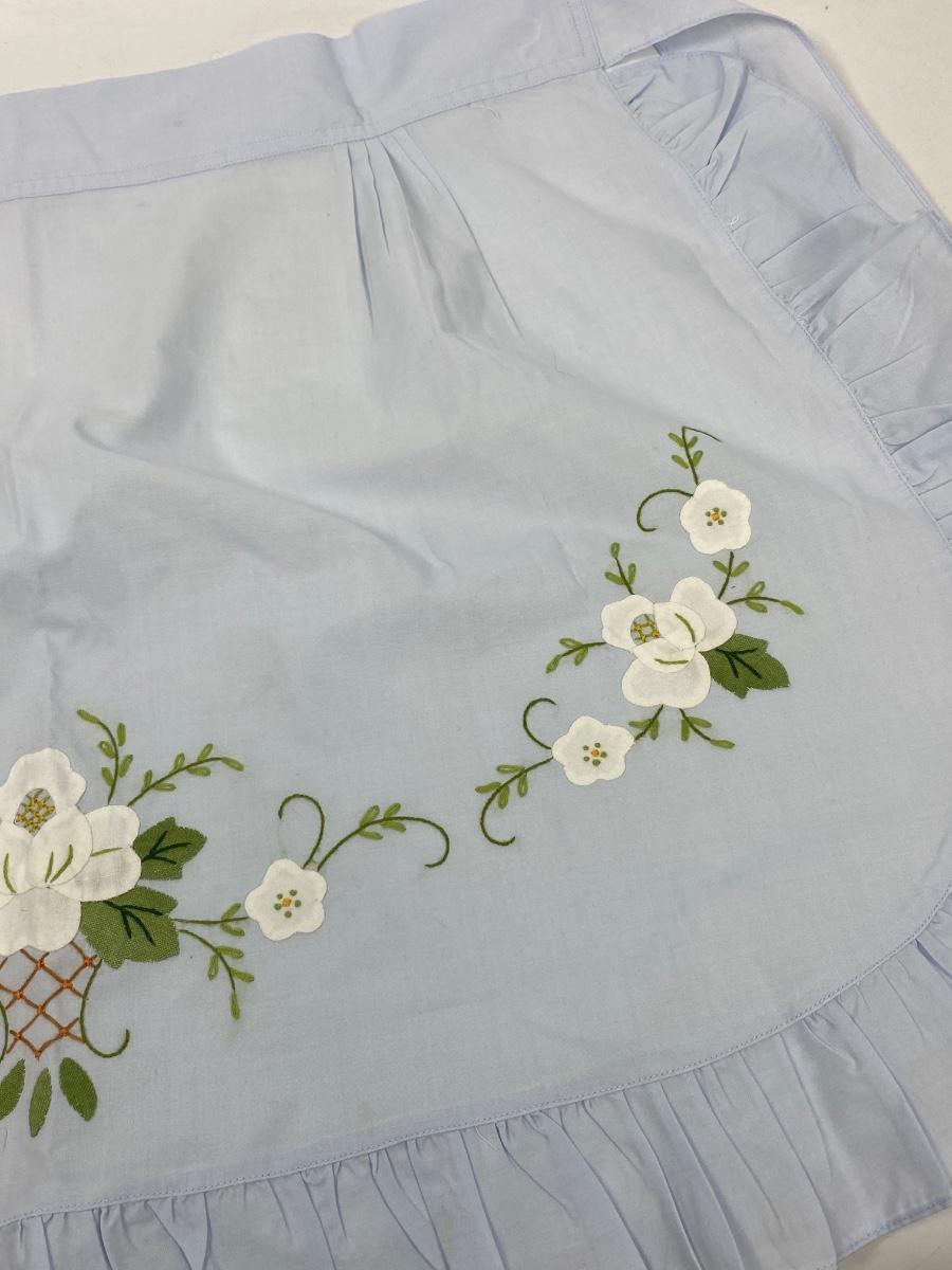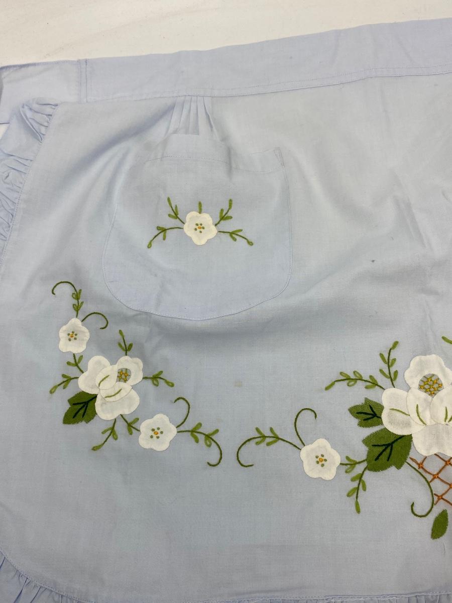 Vintage Pale Blue White Flower Applique Single Pocket Half Apron. In good condition, looks unused. Front panel is about 18" plus ties.