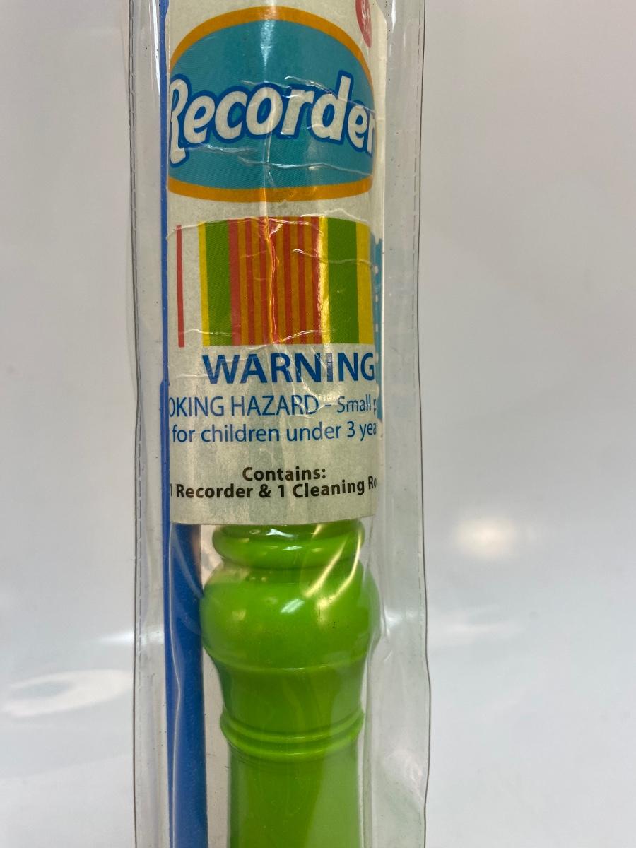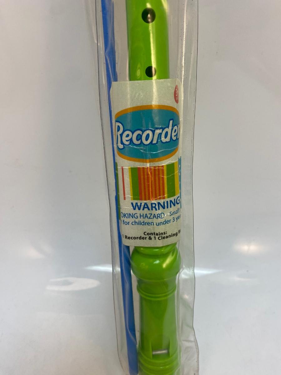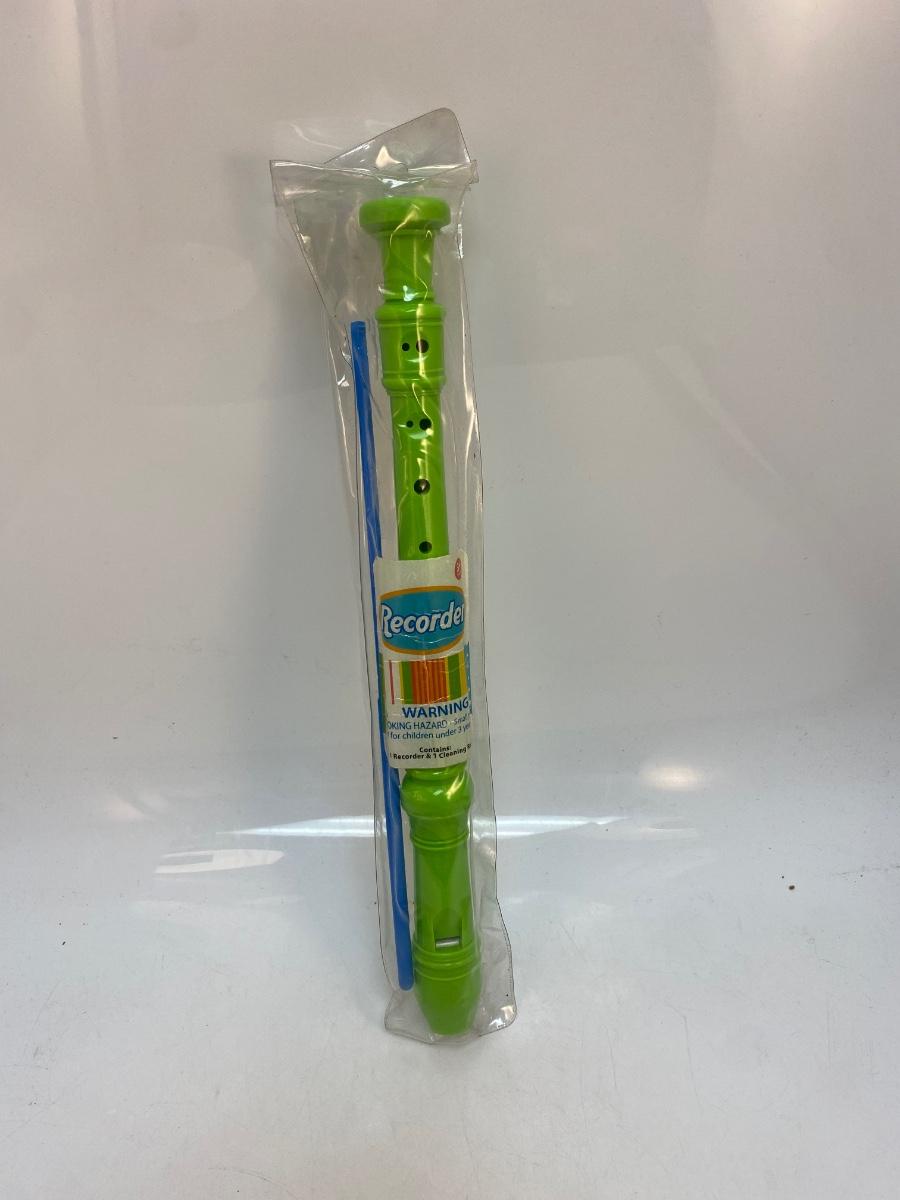 Lime Green Plastic Recorder Musical Instrument in Package. Complete with cleaning stick. Not sure if it has been previously used.