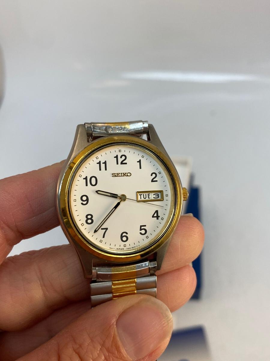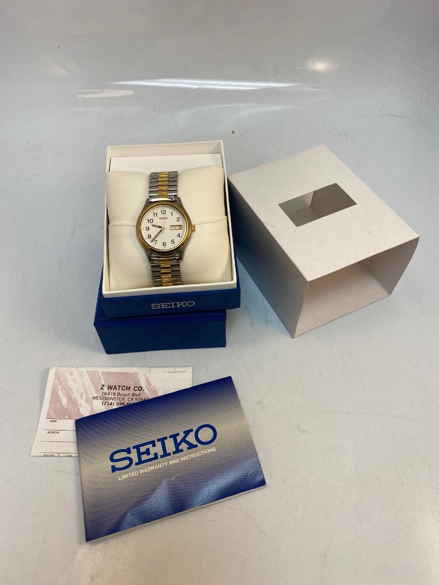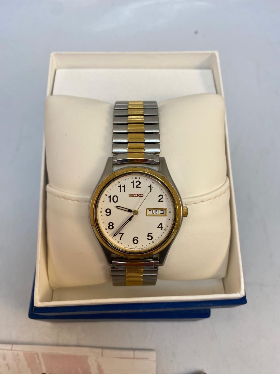 Men's Stainless Steel & Gold Tone Seiko Watch Wristwatch in Original Package Works. Needs the date set but watch is running. In good condition, no signs of use to face or band.