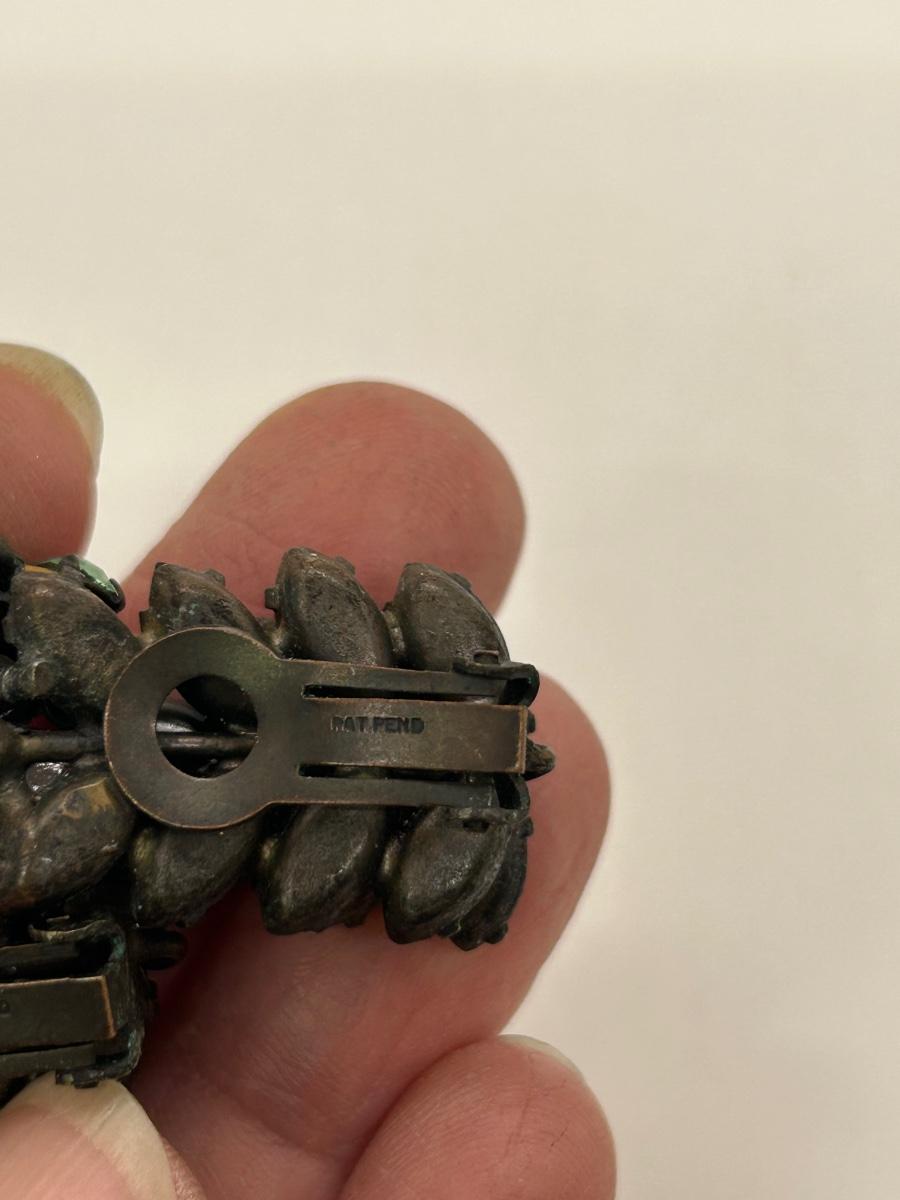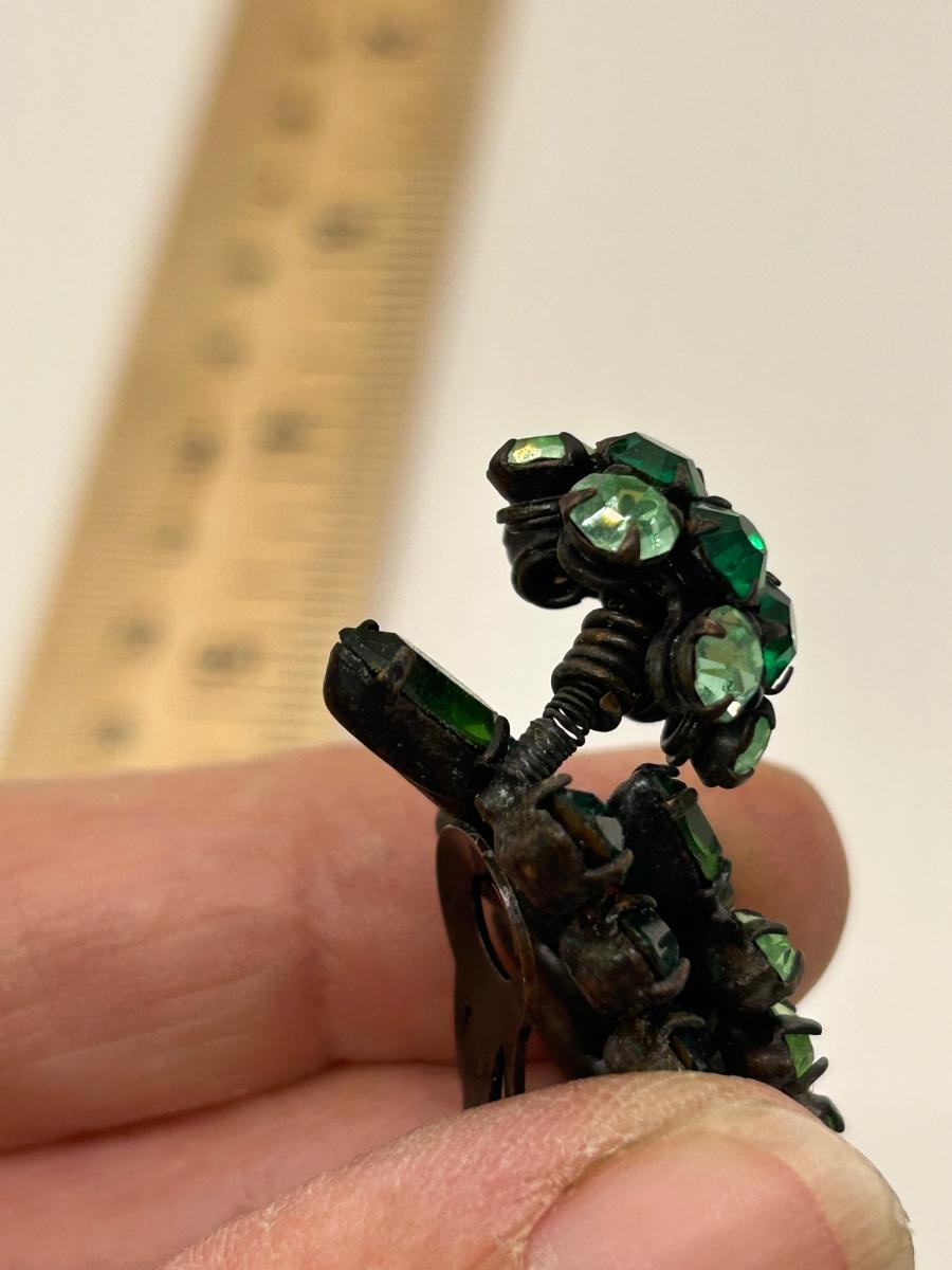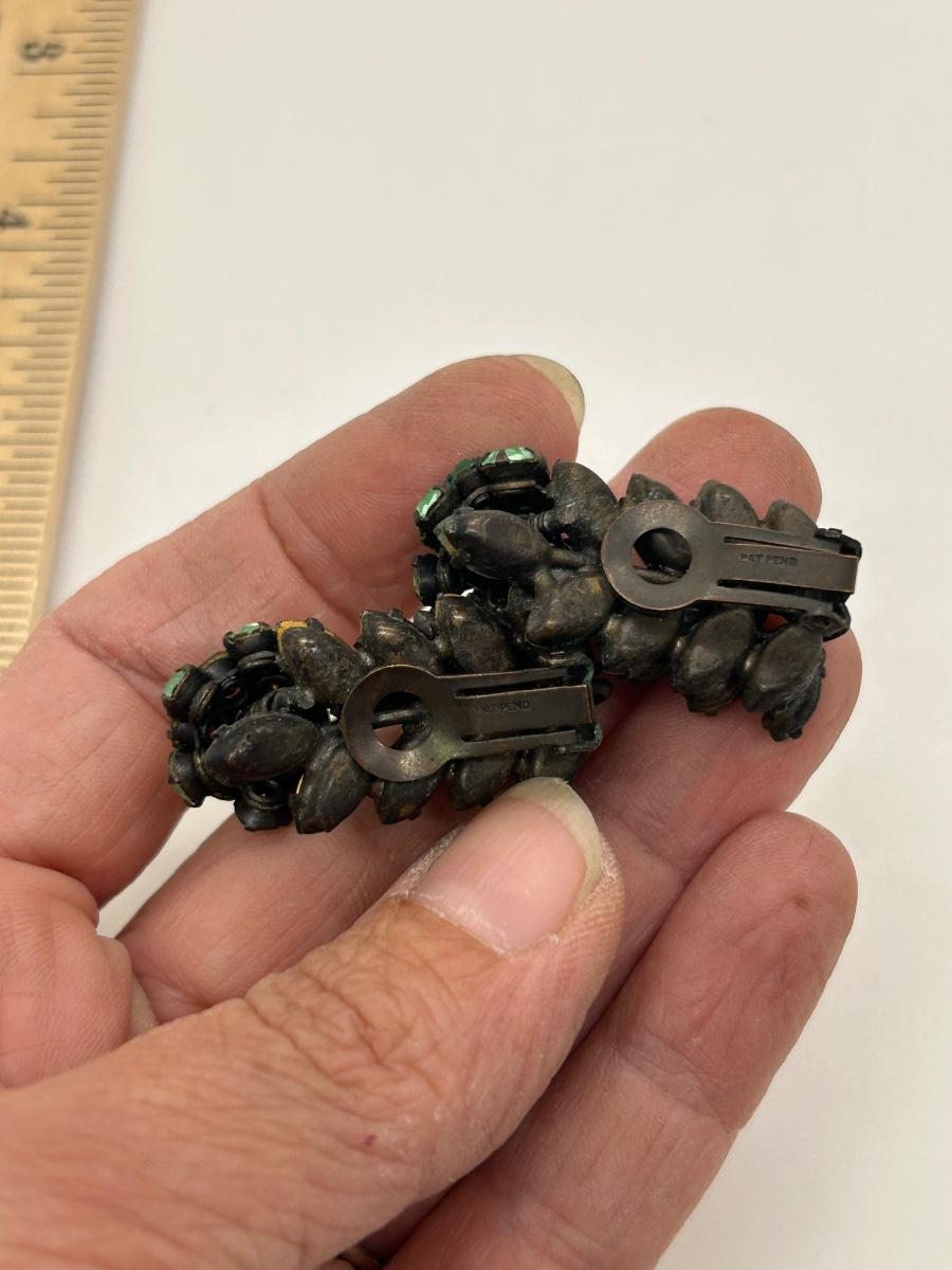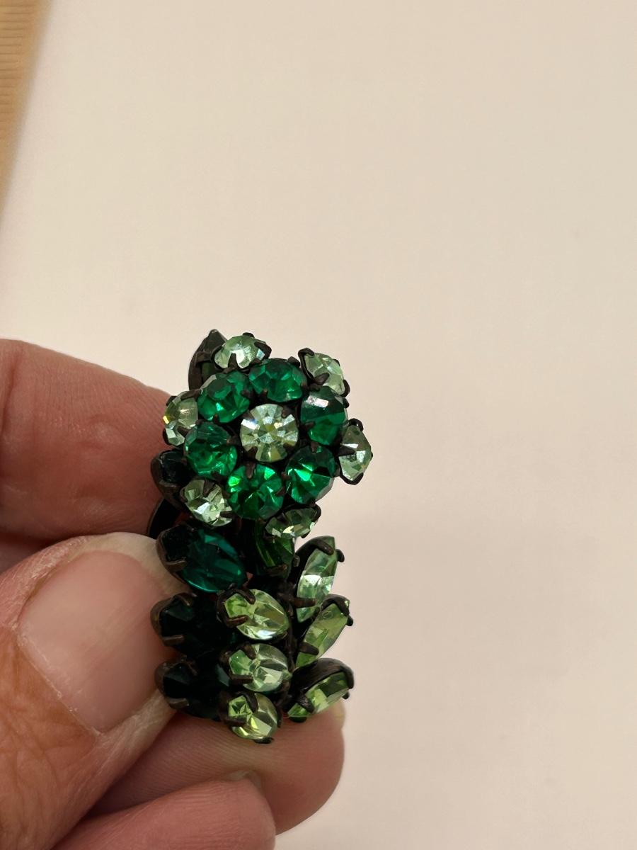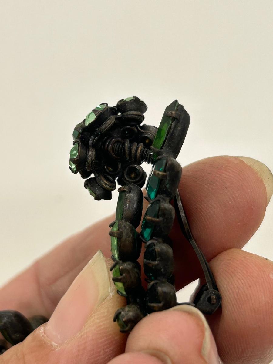 Vintage Green and Gold Rhinestone Choker Necklace and Clip Style Earrings. Beautiful dark green rhinestone necklace with gold tone setting. Unfortunately, it is missing a stone. Clip style earrings are flower like with the flower being on a spring. In good vintage condition.