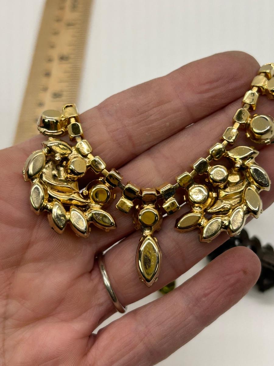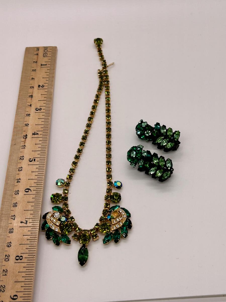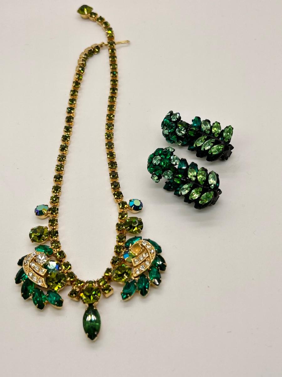 Vintage Green and Gold Rhinestone Choker Necklace and Clip Style Earrings
