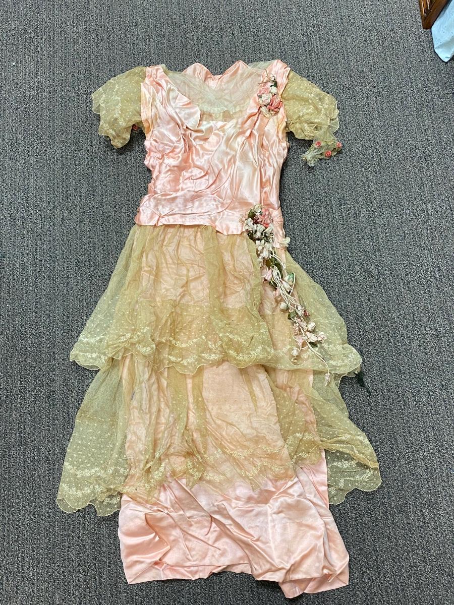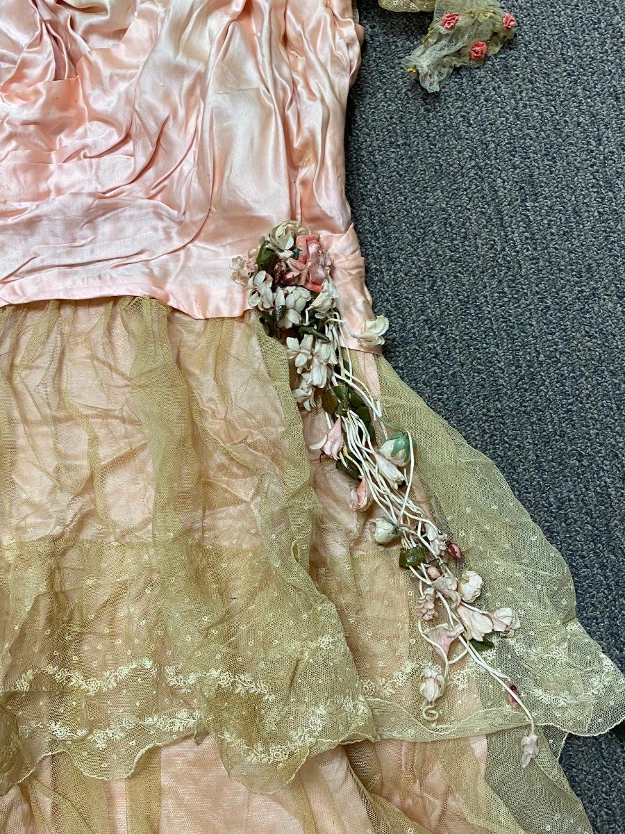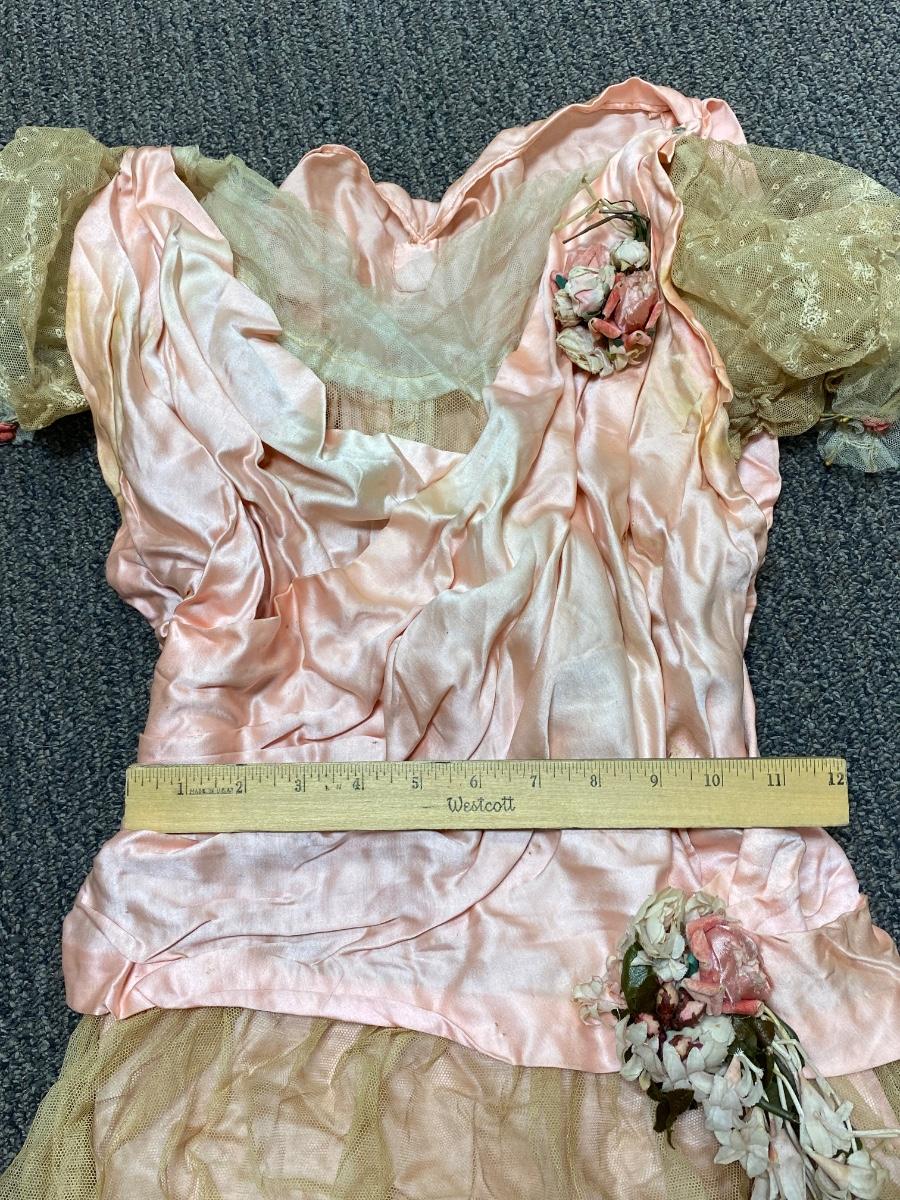 Vintage Antique Pink Satin & Lace Prom Bridesmaid Party Dress. Signs of age and discoloration. Very wrinkled from storage. No major damage noticed.