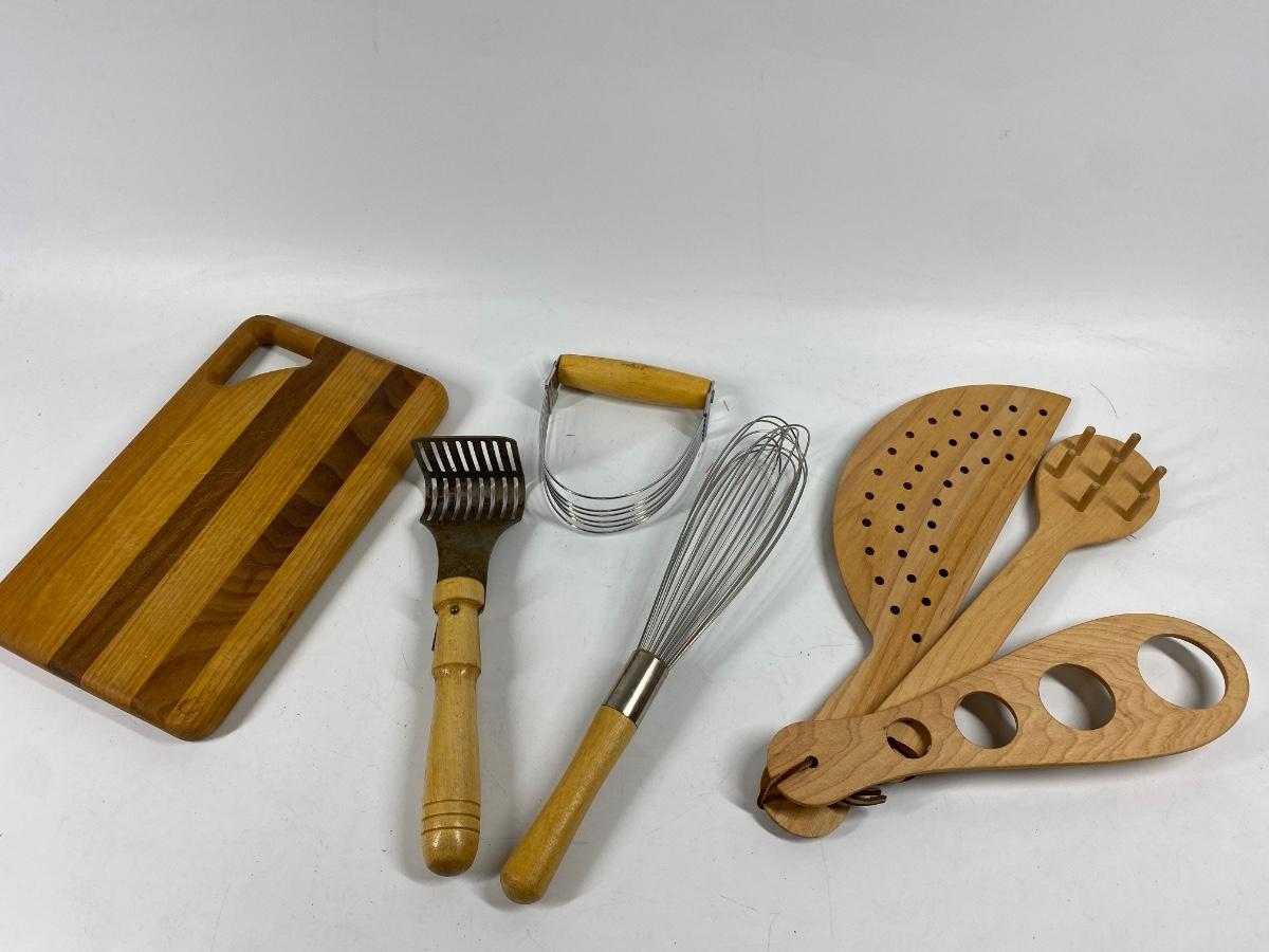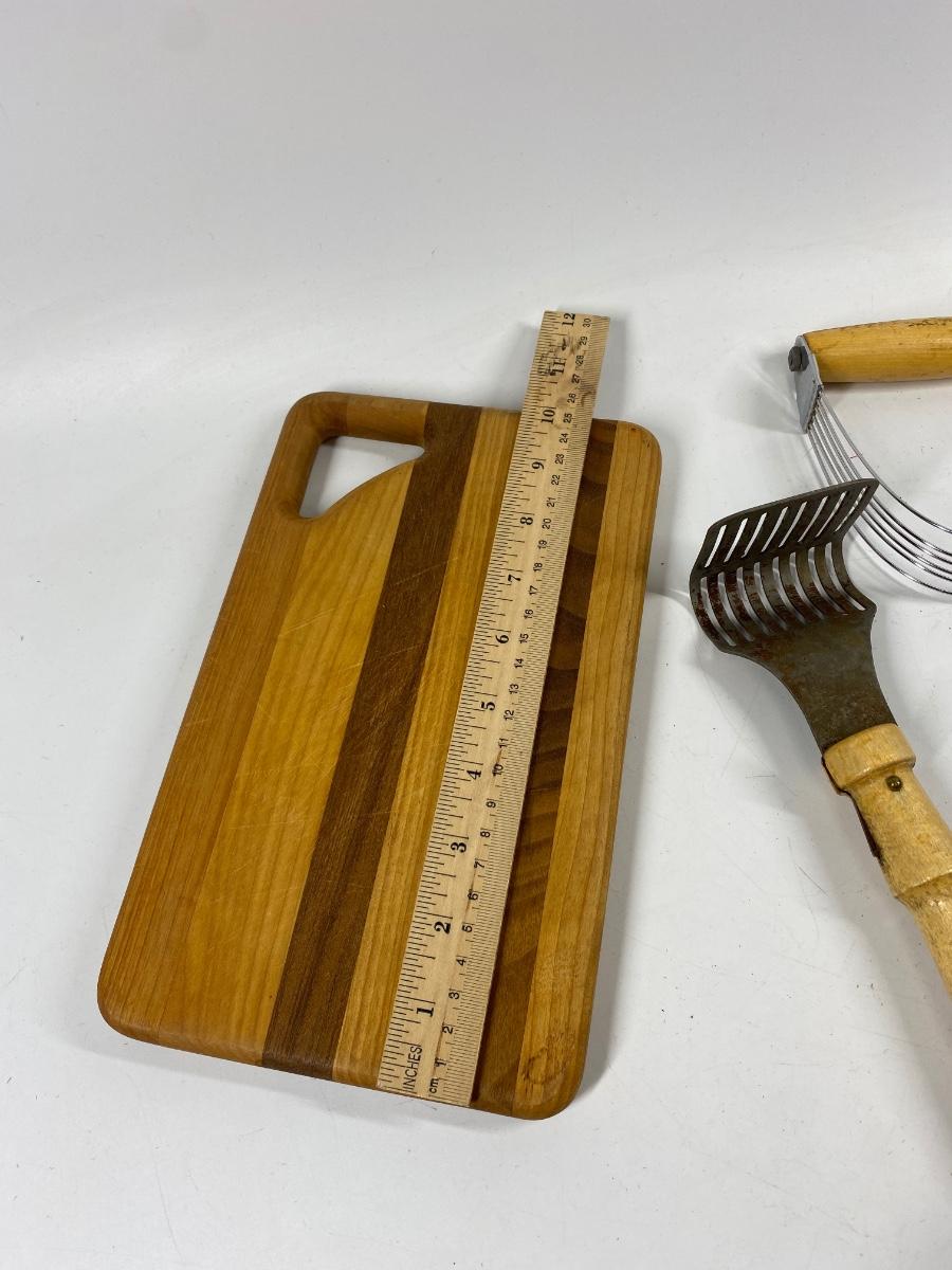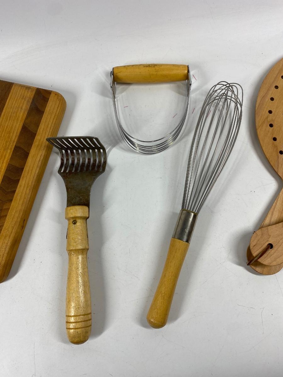 Wood Kitchen Utensil Lot Vintage & Modern Cutting Board Masher Pastry Cutter