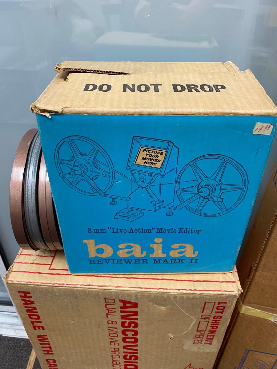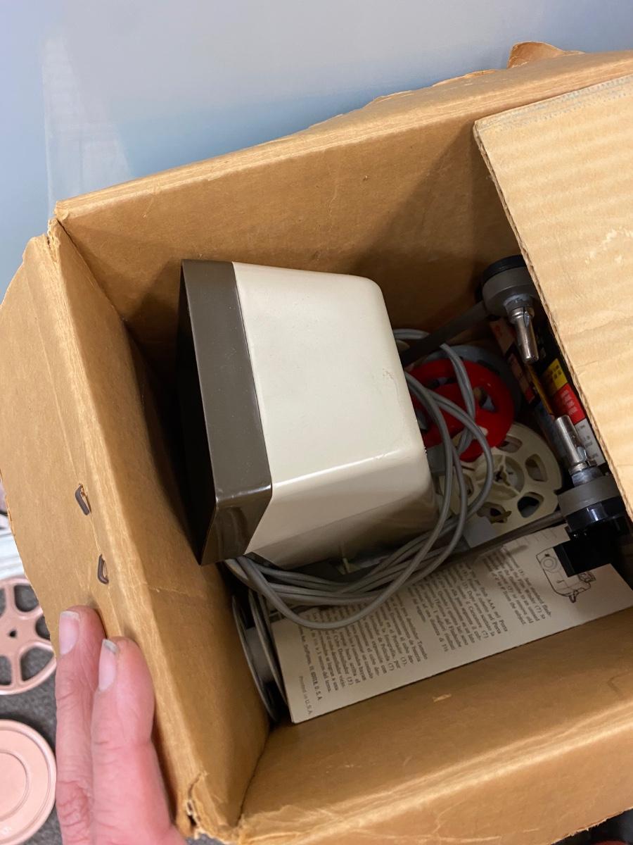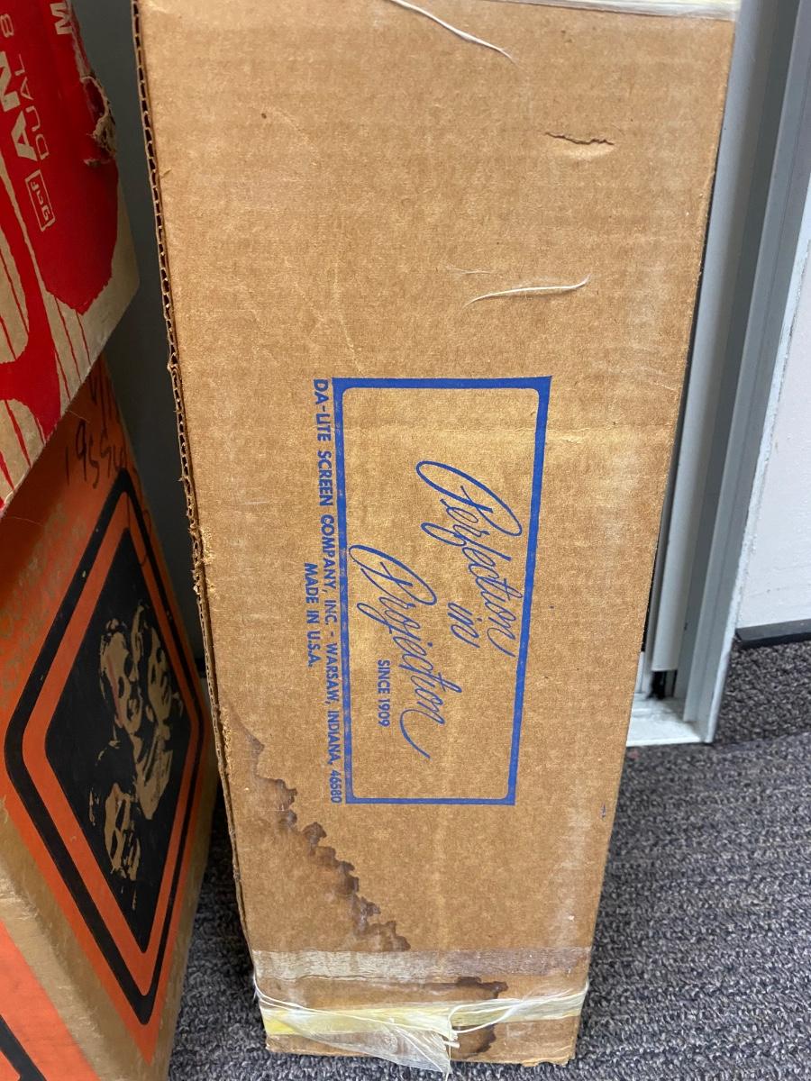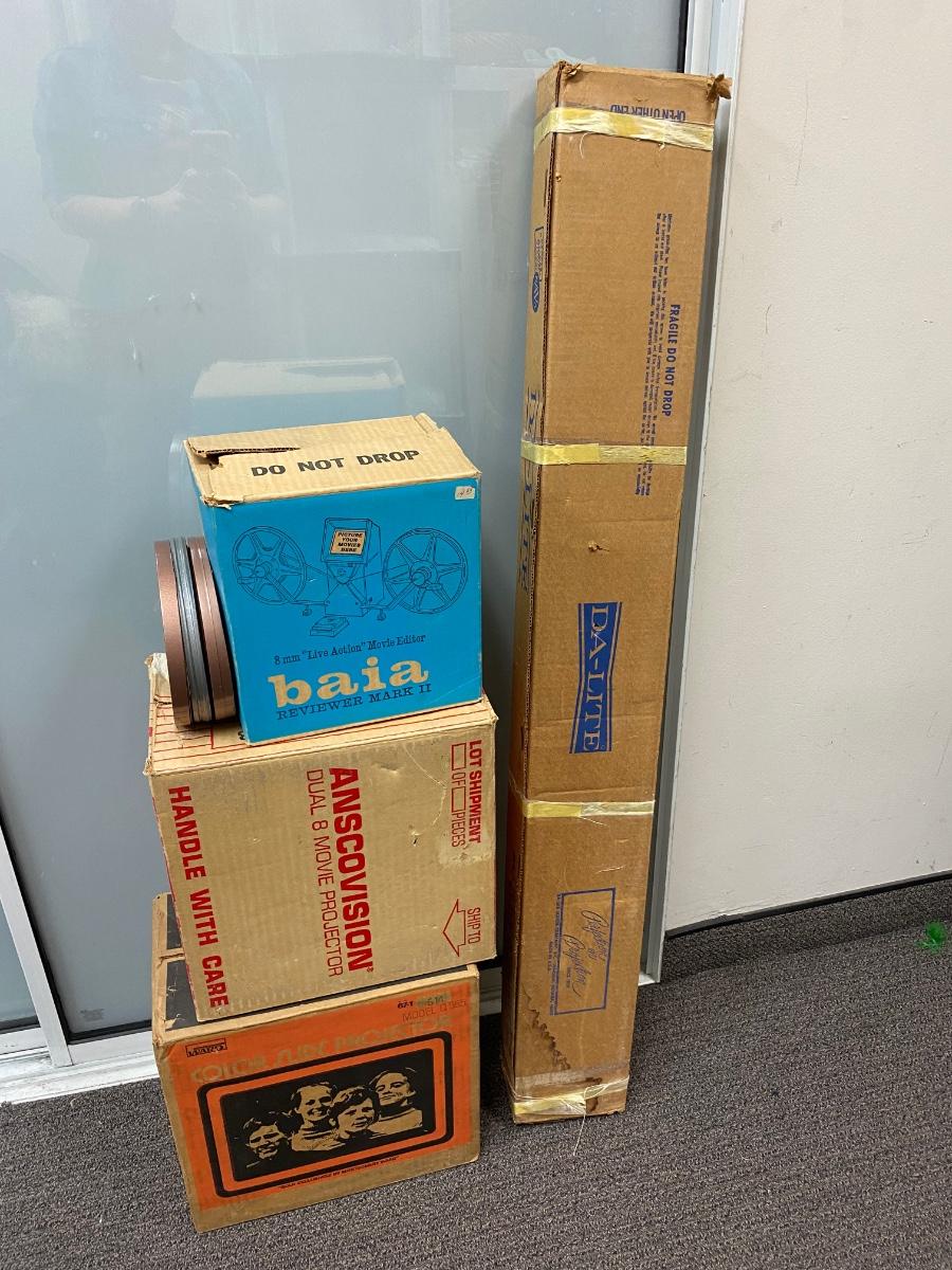 Vintage Retro Movie Slide Projection Lot. Includes a Da-Lite 40x40 collapsible screen, a Baia Reviewer Mark II 8mm movie editor, Montgomery Ward Color Slide Projector, Anscovision Dual 8 Movie Projector, and some empty metal movie reels with cases. Everyhting comes in original box. Untested, unsure if they are complete, as is condition but they look well kept.