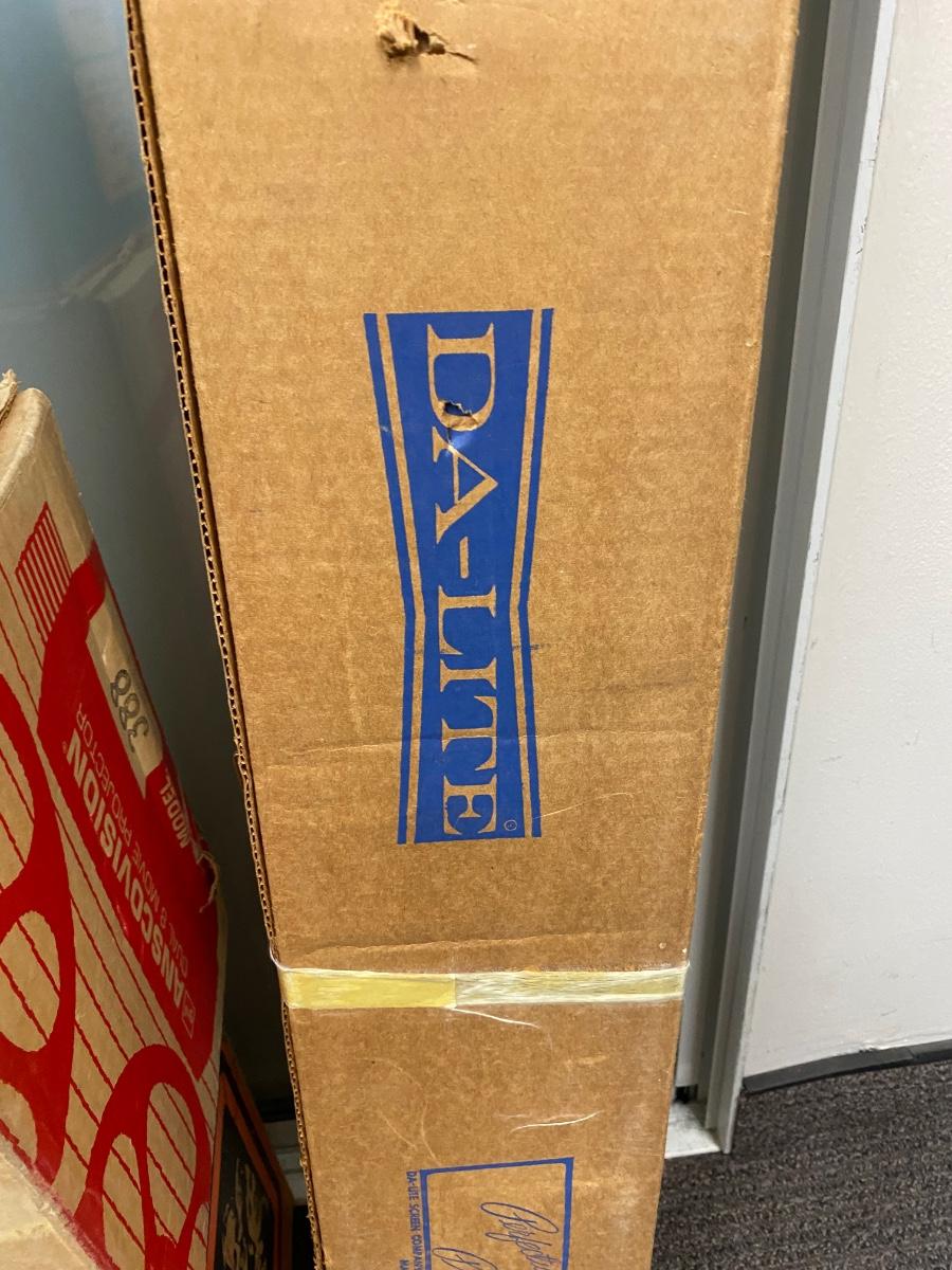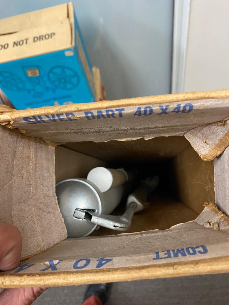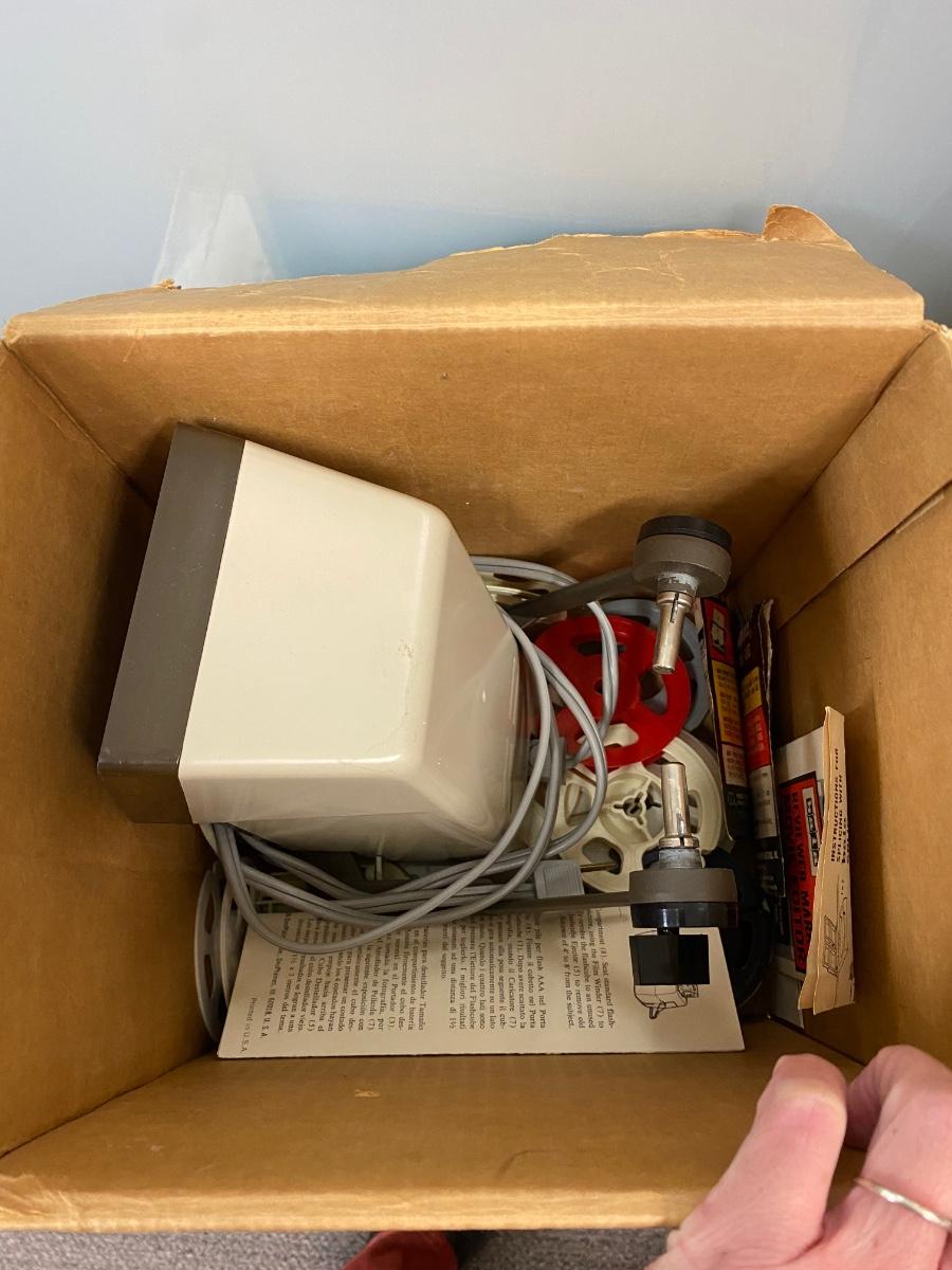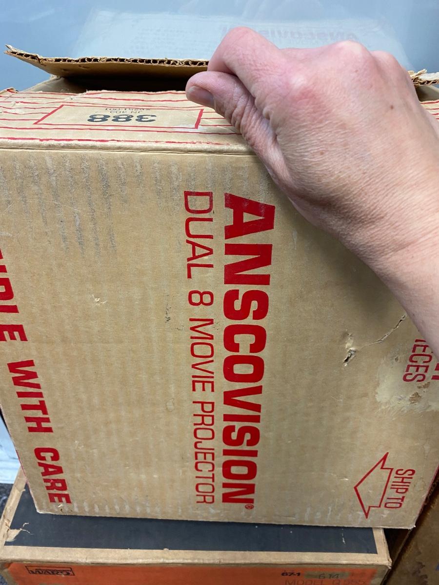 Vintage Retro Movie Slide Projection Lot. Includes a Da-Lite 40x40 collapsible screen, a Baia Reviewer Mark II 8mm movie editor, Montgomery Ward Color Slide Projector, Anscovision Dual 8 Movie Projector, and some empty metal movie reels with cases. Everyhting comes in original box. Untested, unsure if they are complete, as is condition but they look well kept.