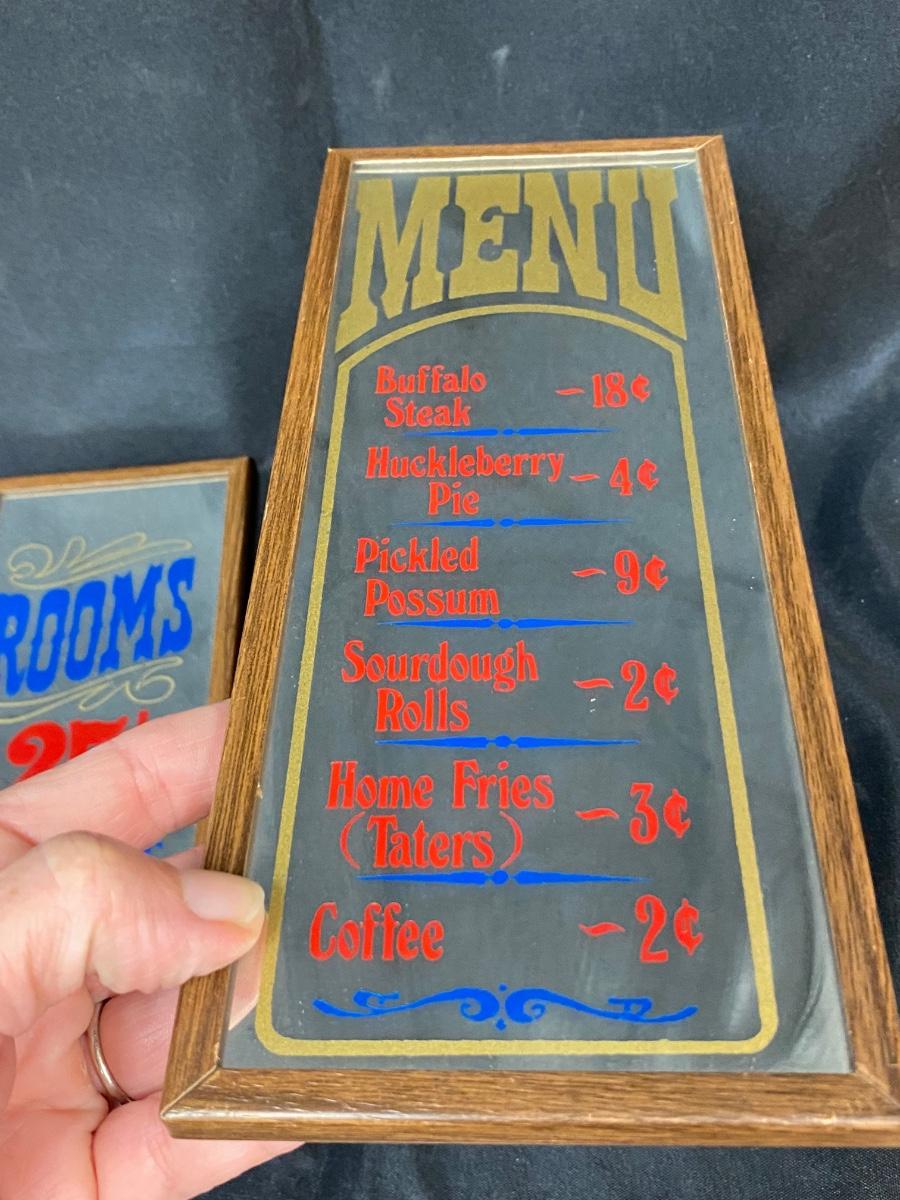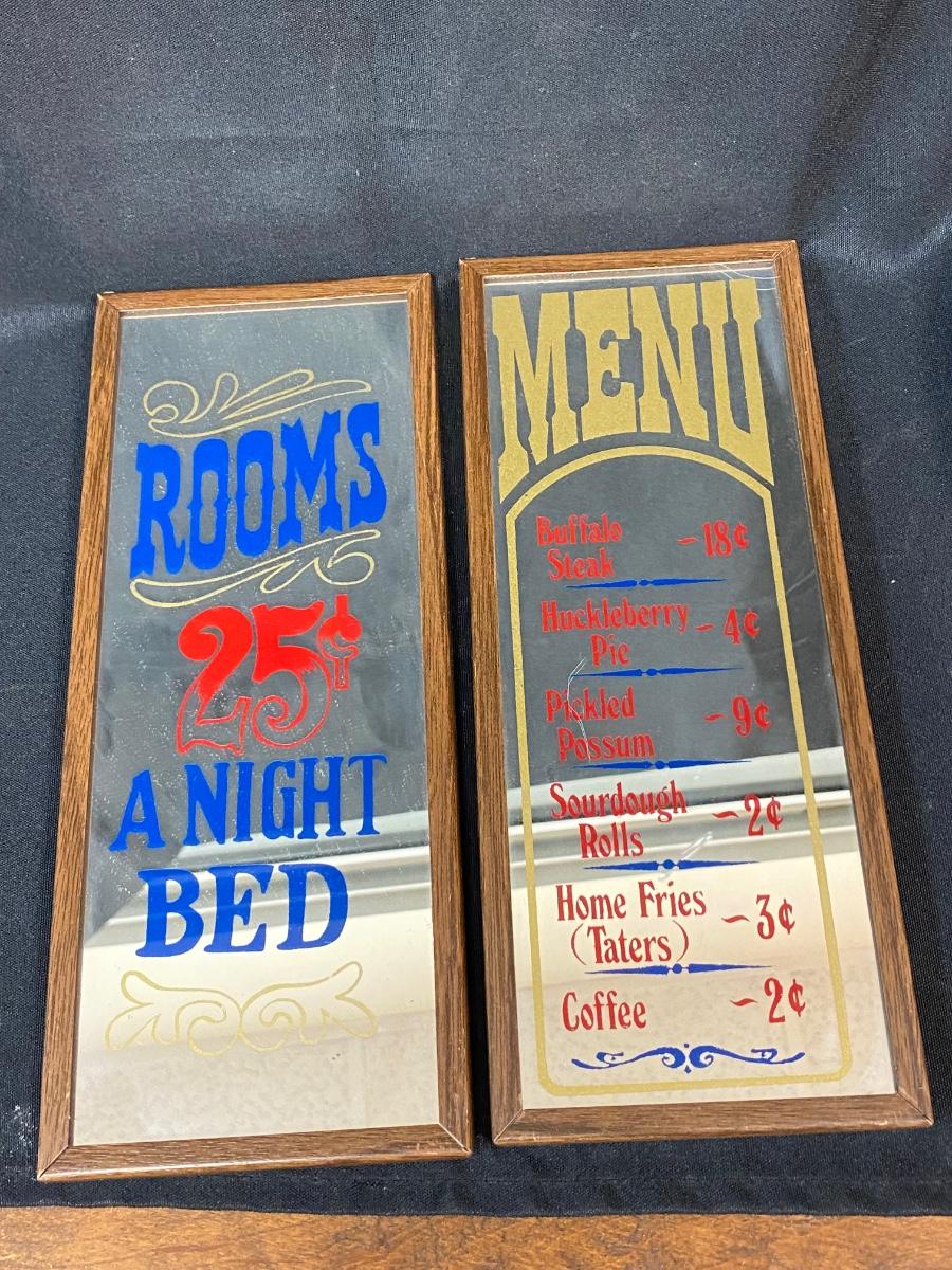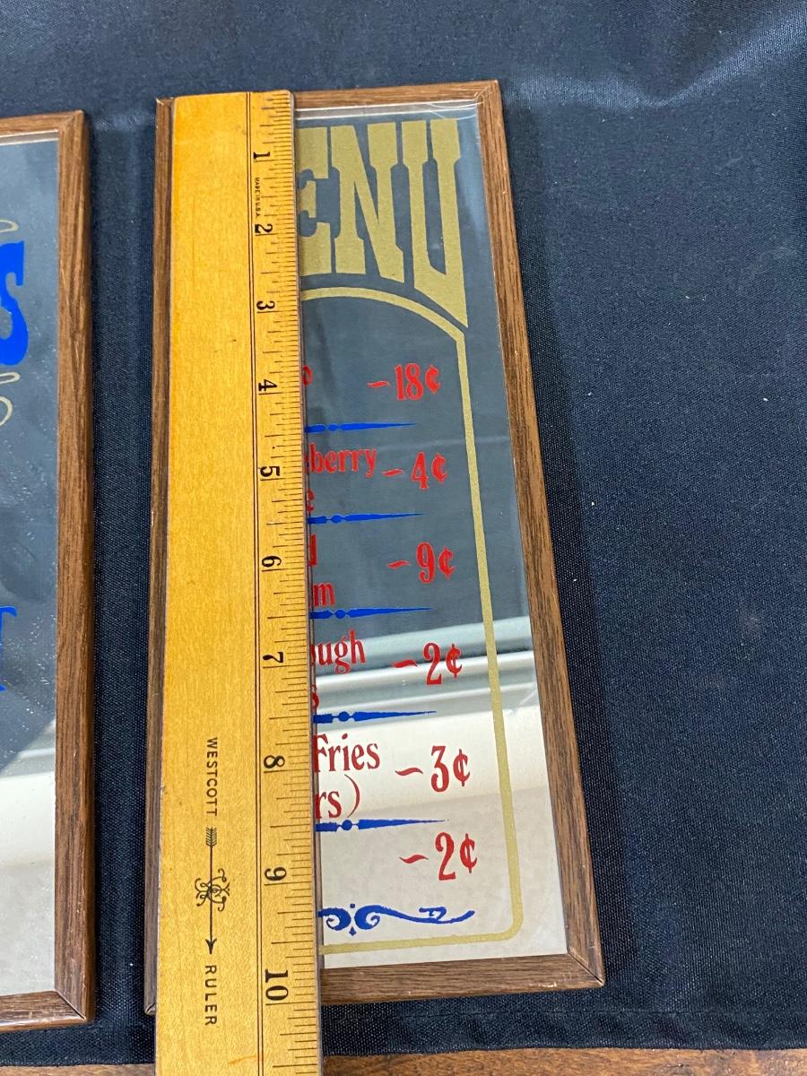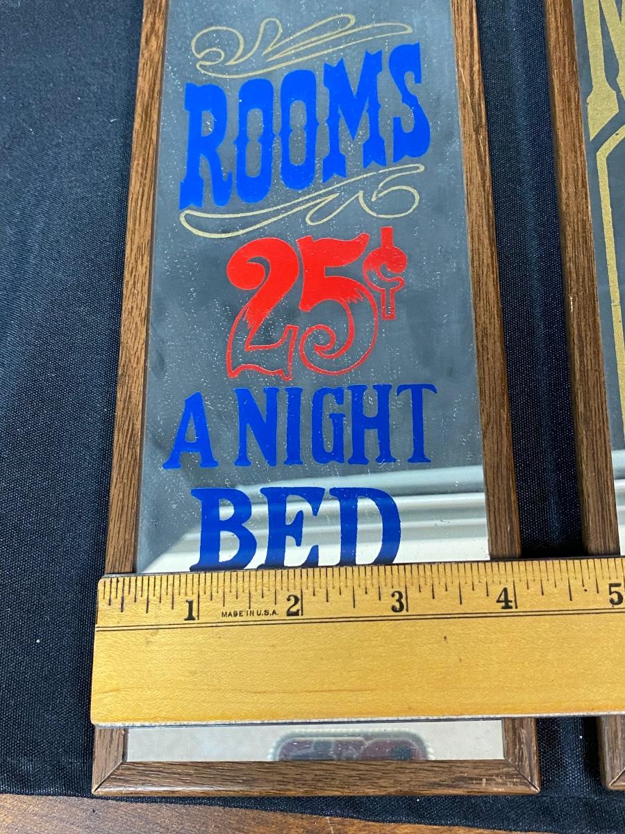 Pair of Vintage Americana Small Mirrored Novelty Bar Wall Signs. Small signs about 10"x4" size. A little dusty but in good condition.