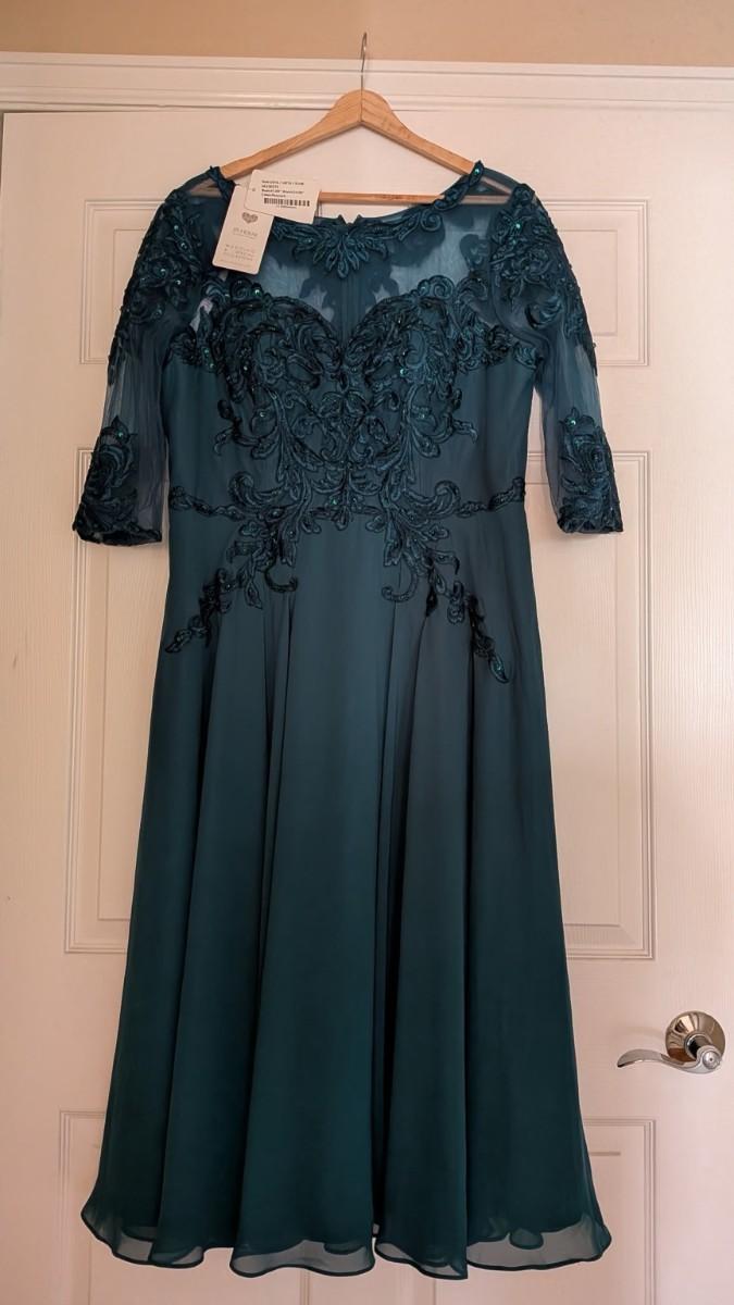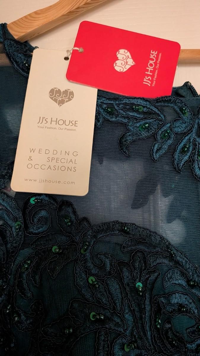 Elegant JJ’s House Wedding & Special Occasions dress in deep teal chiffon with intricate beaded lace applique and sheer three-quarter sleeves. Features a sweetheart-lined bodice with illusion neckline and flowing A-line skirt. Size: 14 (per tag). Brand new with original tags attached. Perfect for formal events, weddings, or evening wear.