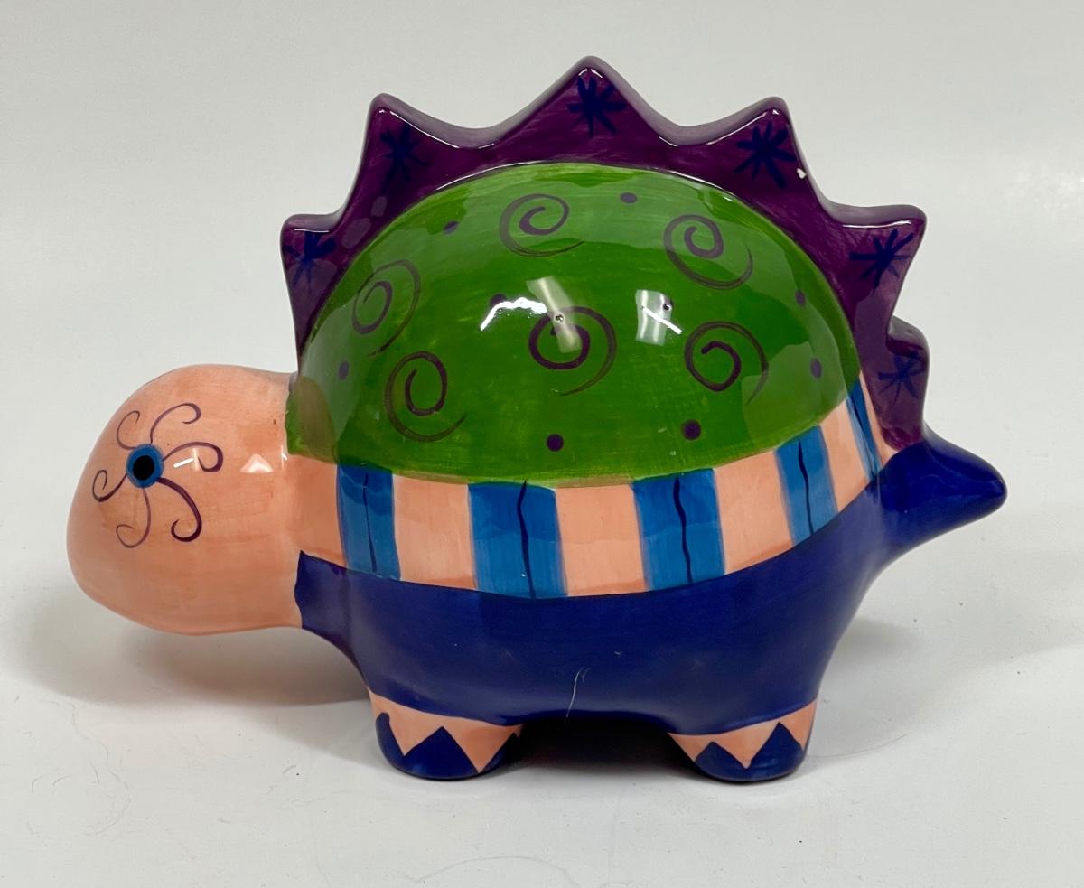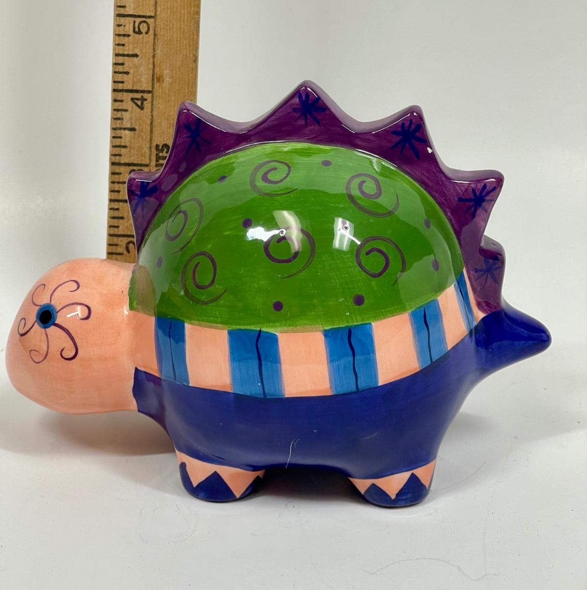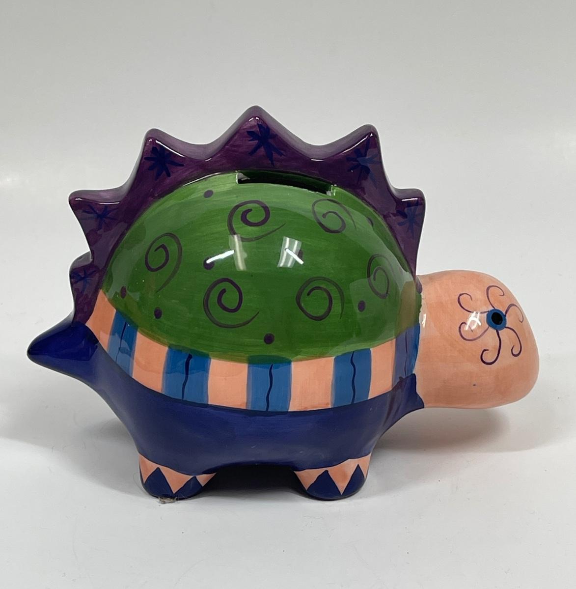 Whimsical design and colors, glazed ceramic. Approx. 4" tall, very good condition.