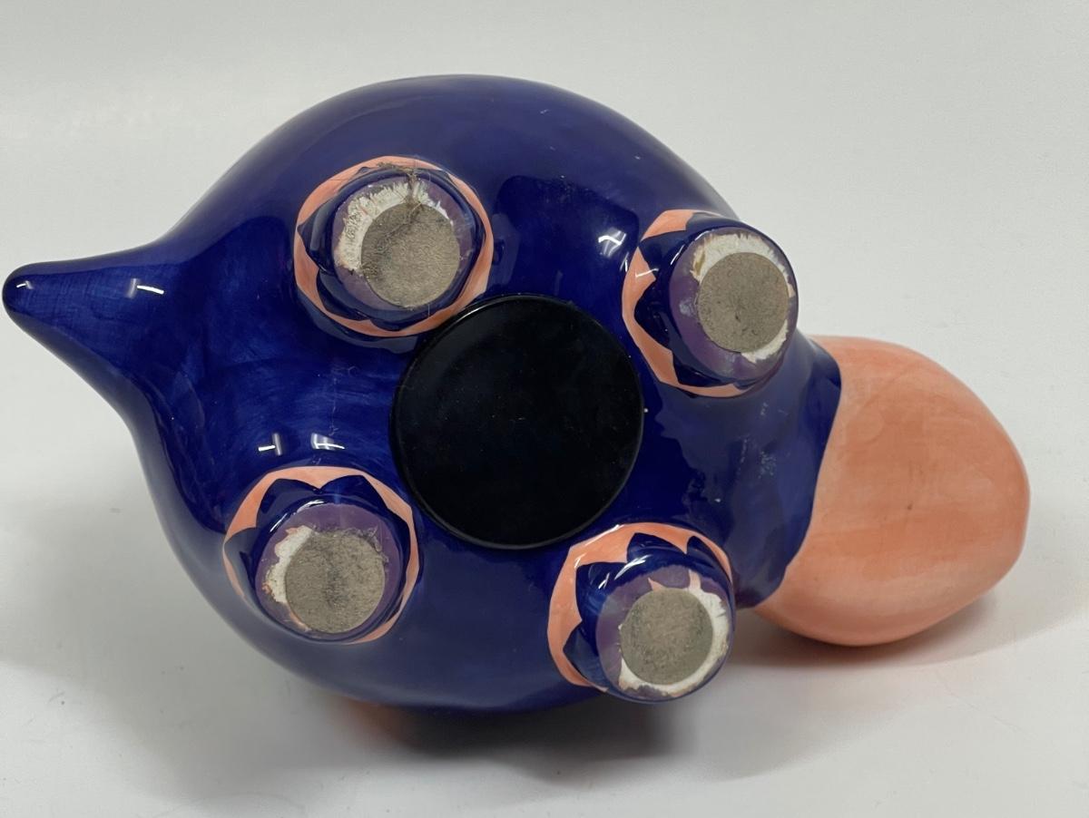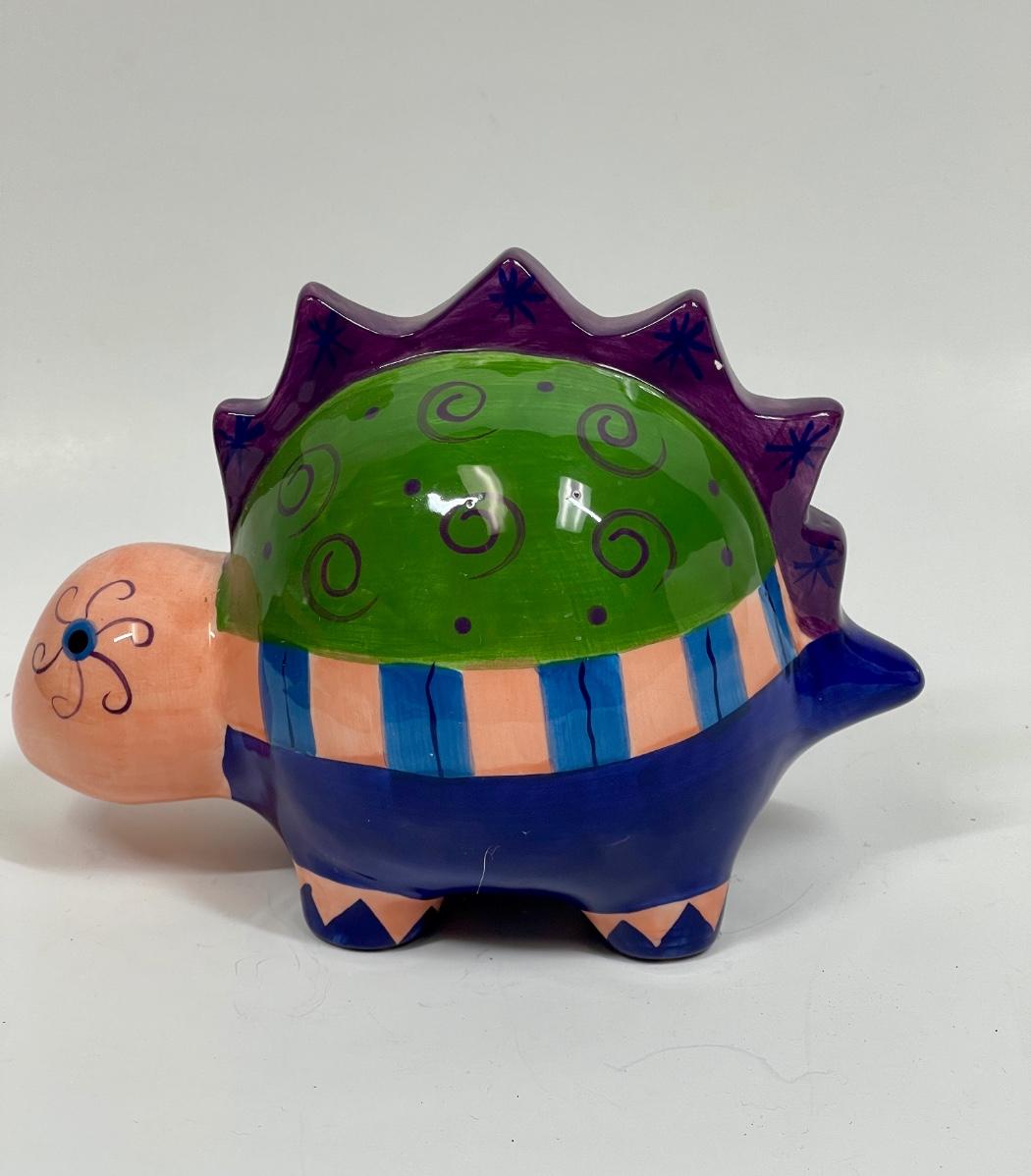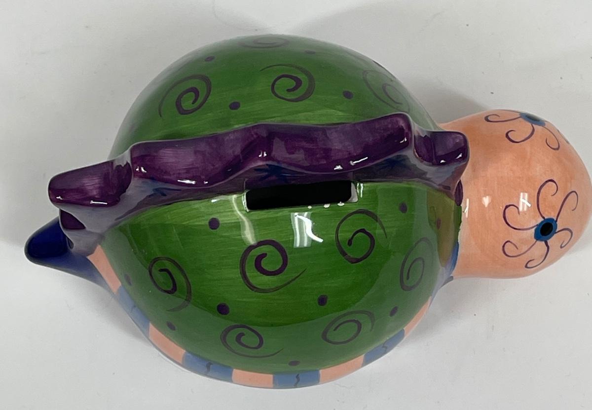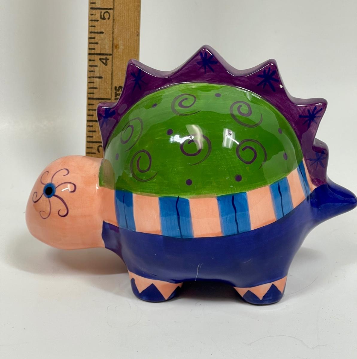 Whimsical design and colors, glazed ceramic. Approx. 4" tall, very good condition.