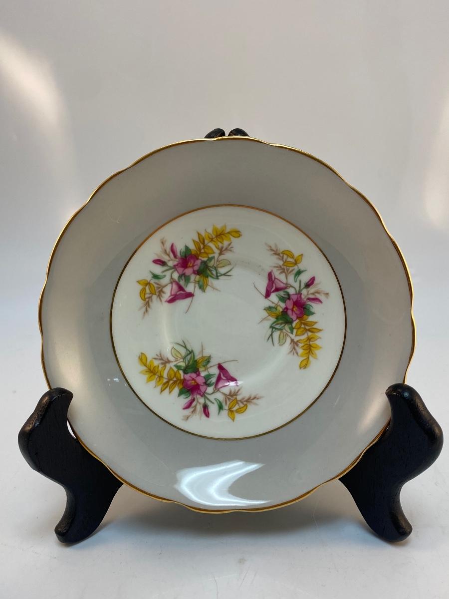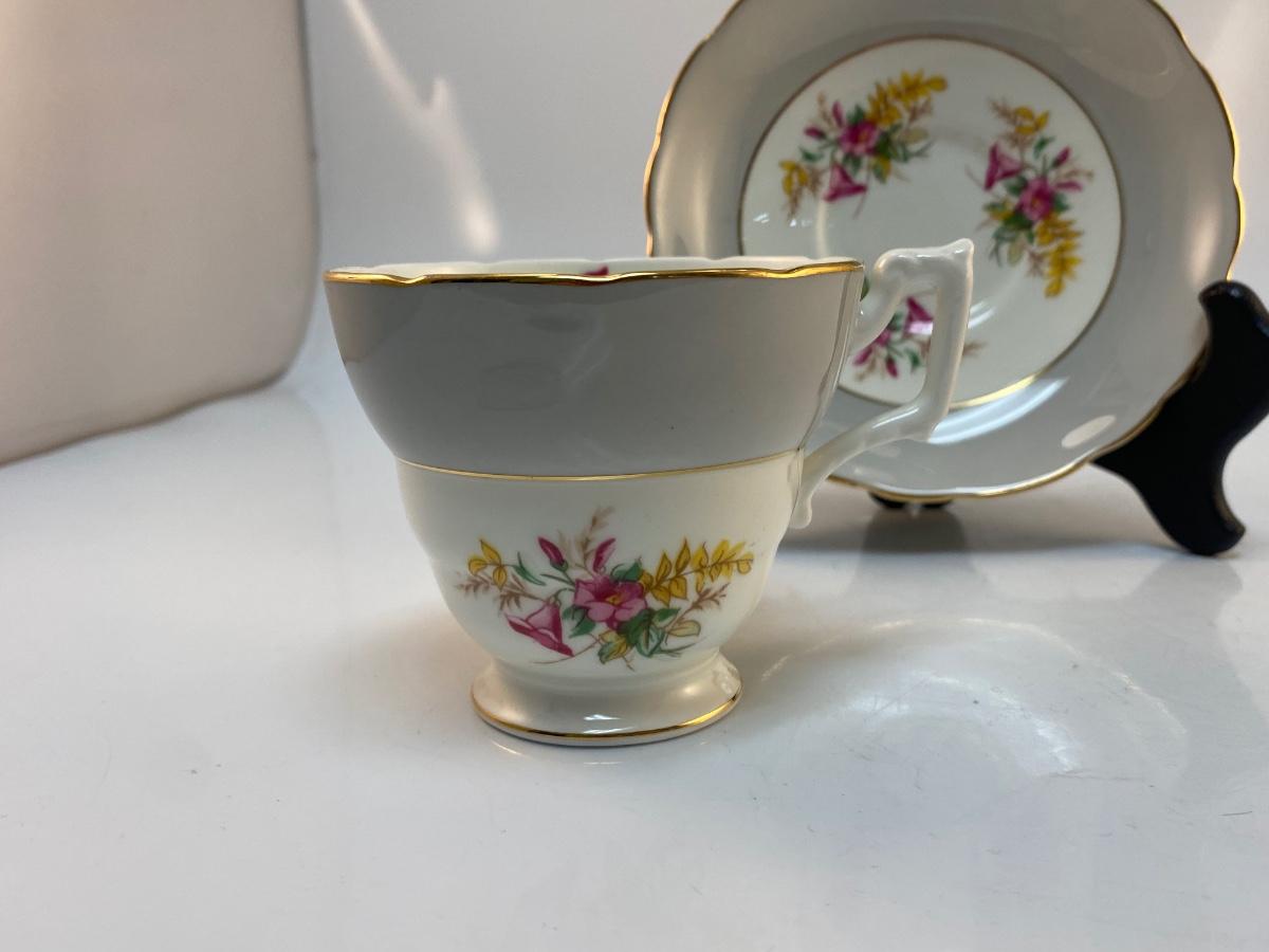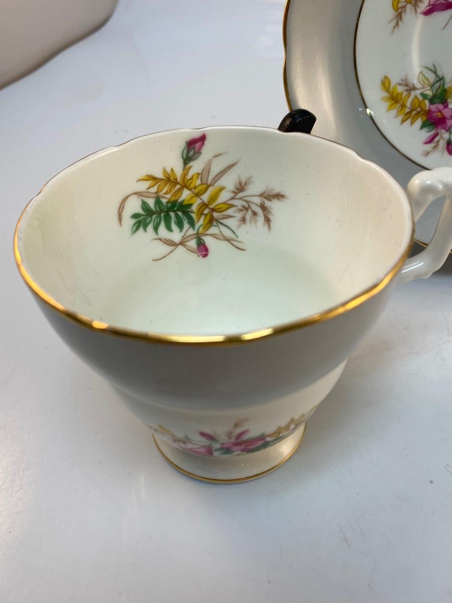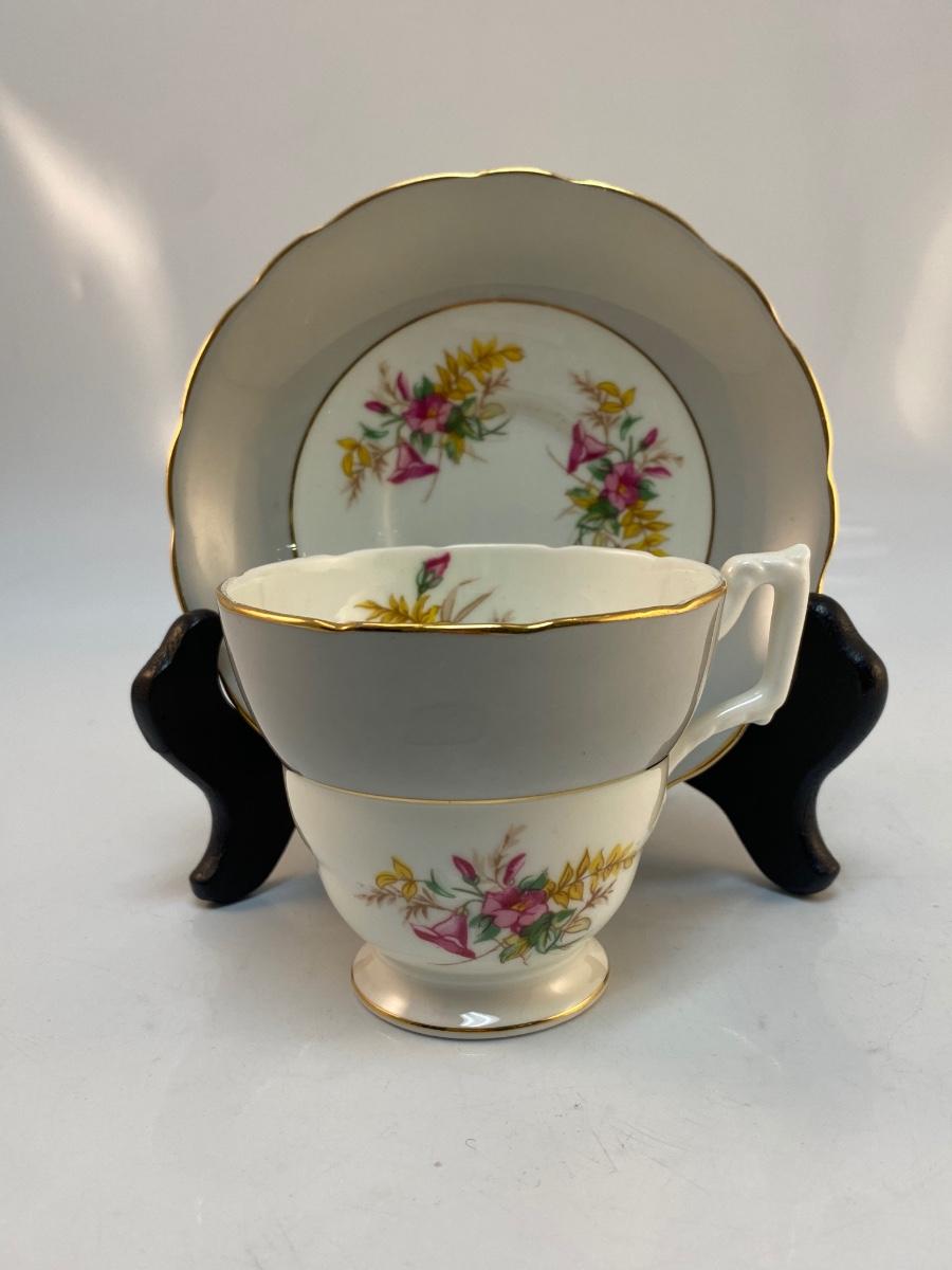 Vintage Coalport Bone China England Floral Wide Grey Edge Teacup & Saucer. Thin gold gilt edge. Good condition, no chips or crazing.