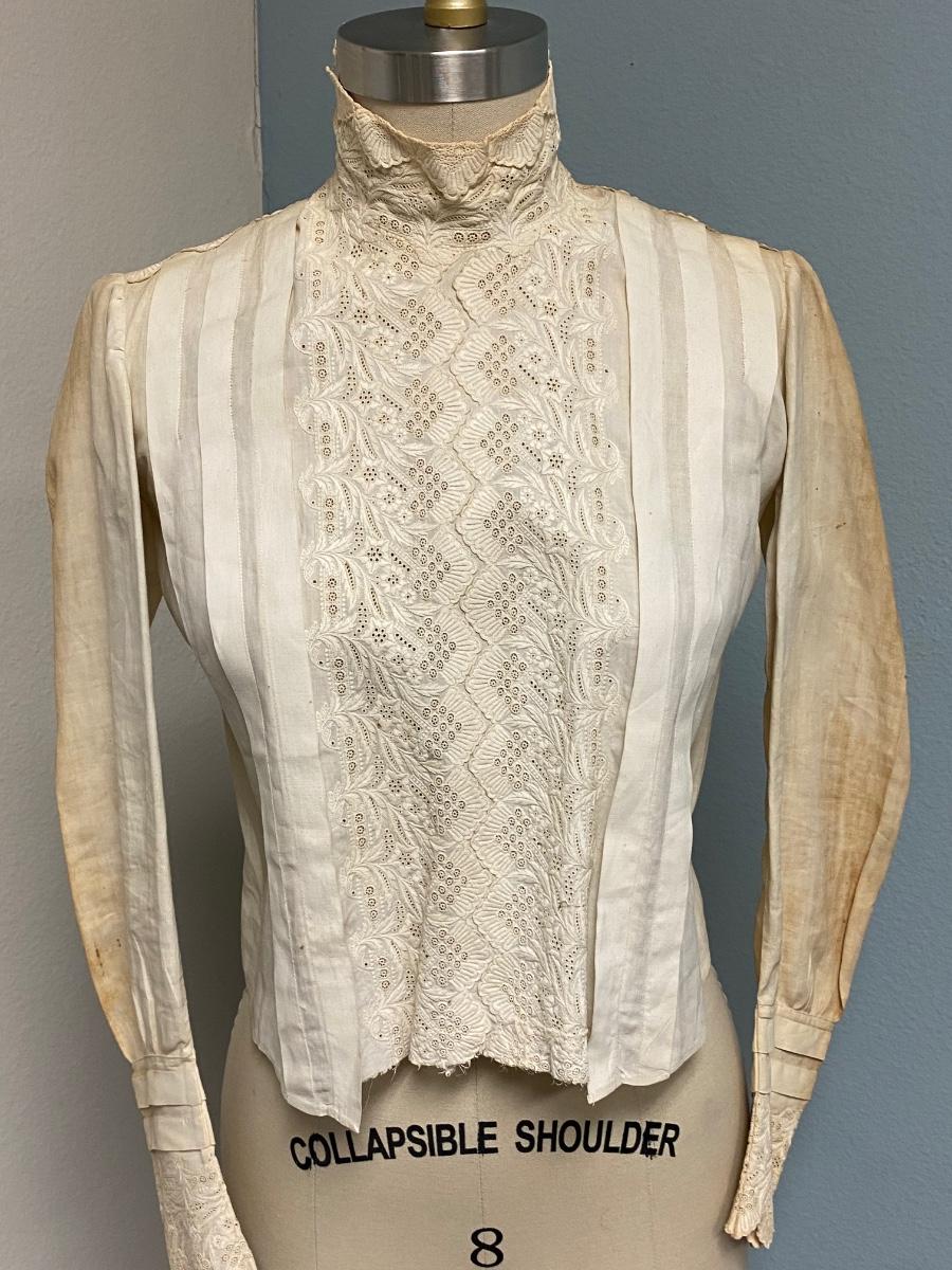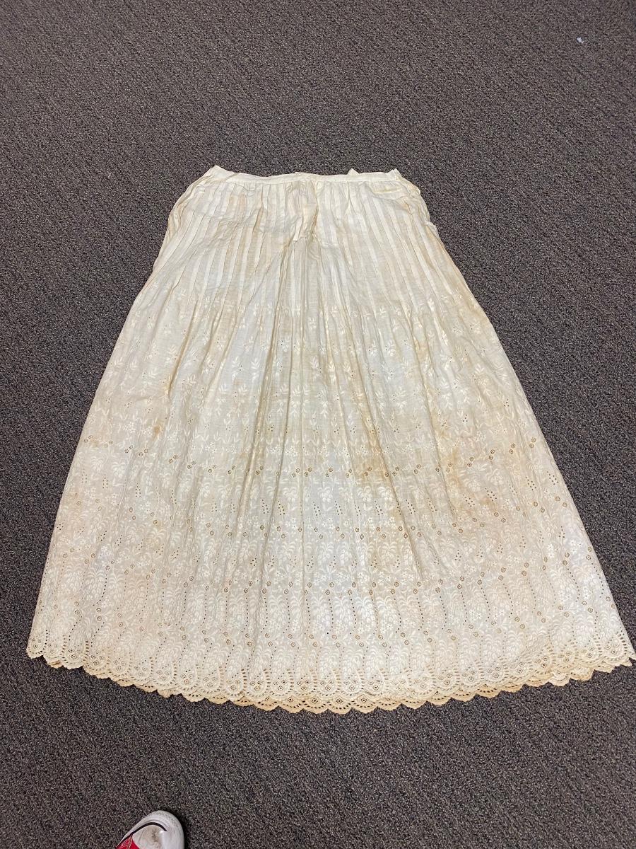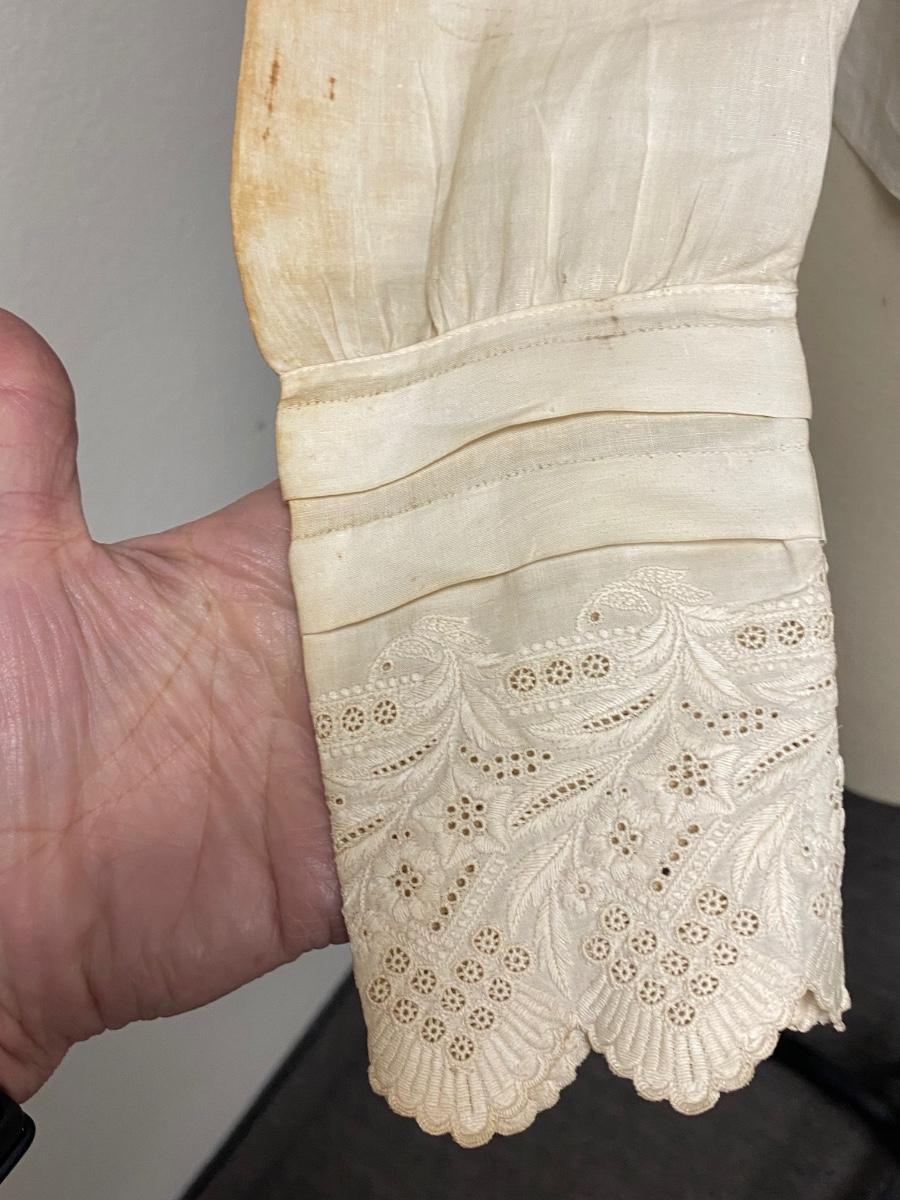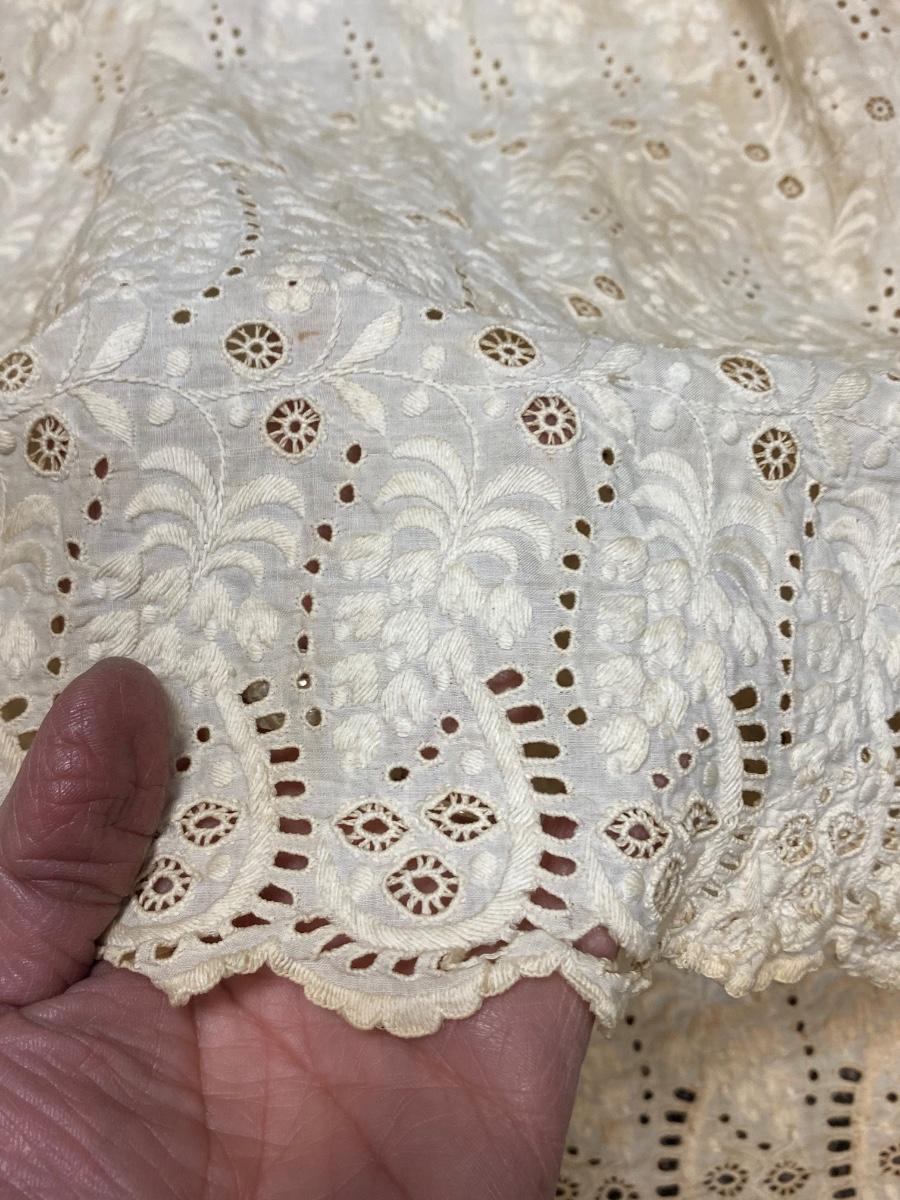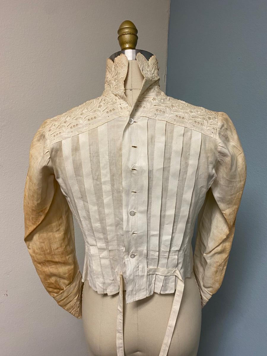 Antique Victorian Cotton Romantic Gibson Girl Two Piece Blouse & Skirt Set Floral Embroidered Lace. Matching embroidered lace on both pieces. Small note pinned to set has a date of 1876 on it. There is the obvious discolor from age but no spots, stains or holes. The blouse fit the mannequin nicely, size 8. Skirt measured about 14.5" but needs a button or hook and eye added for closure.