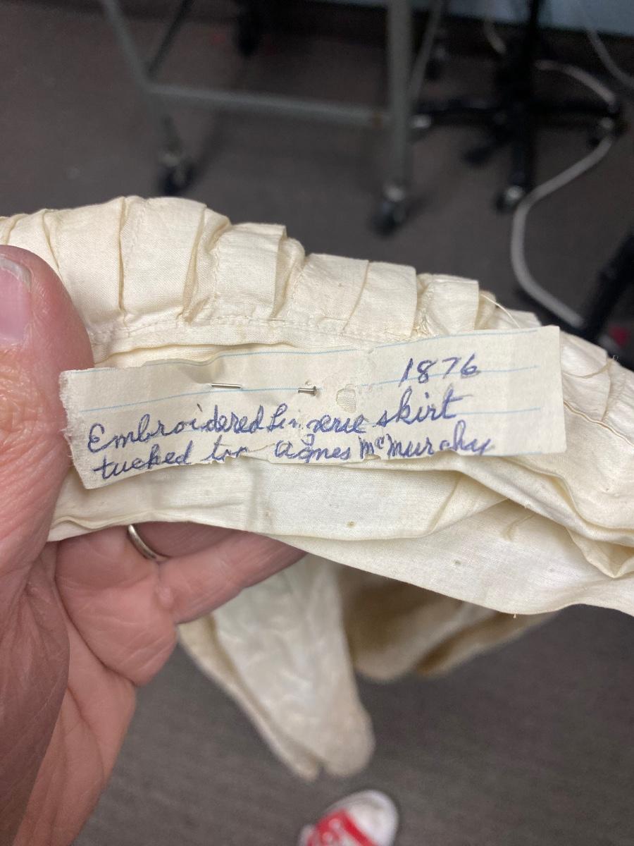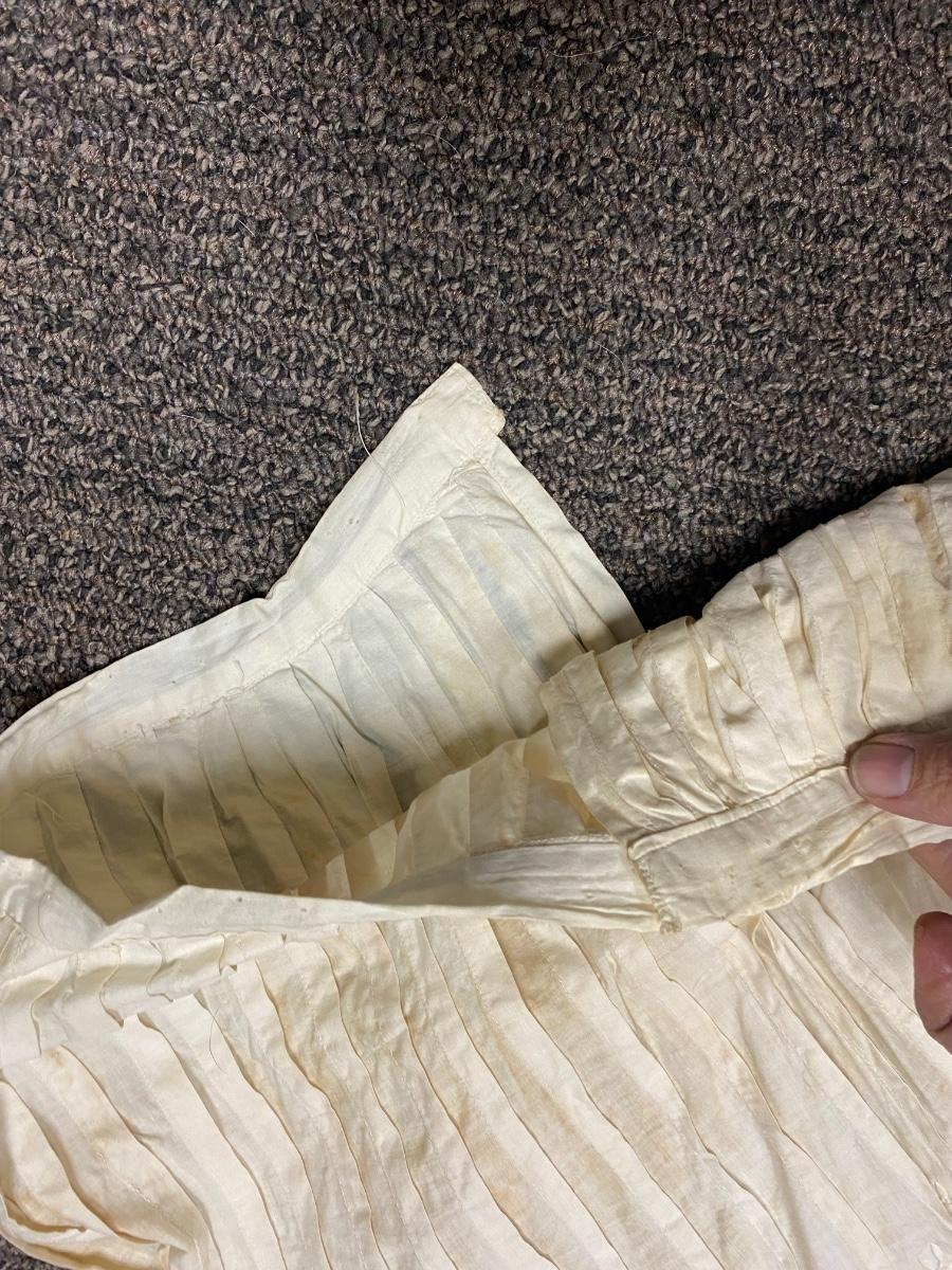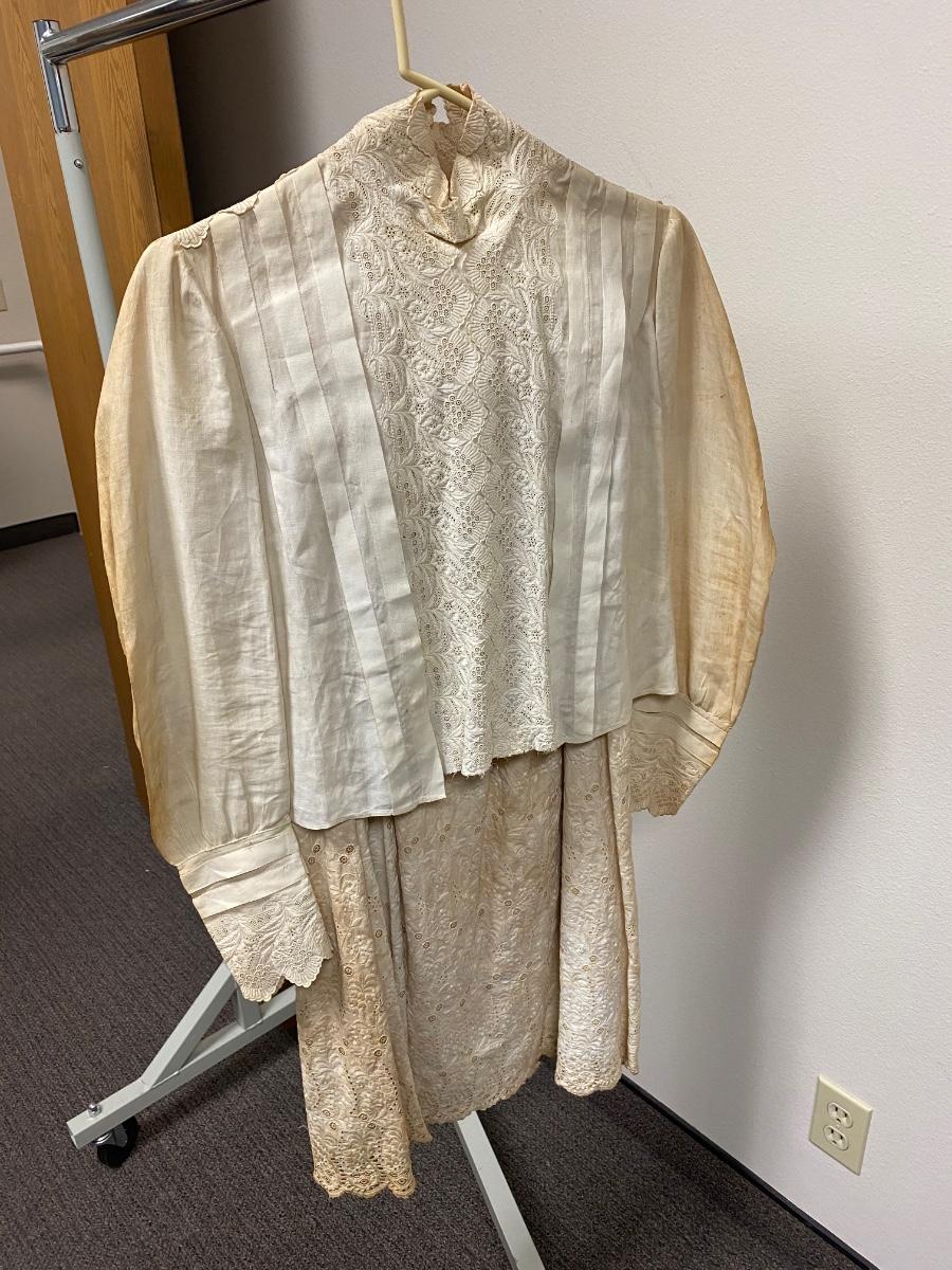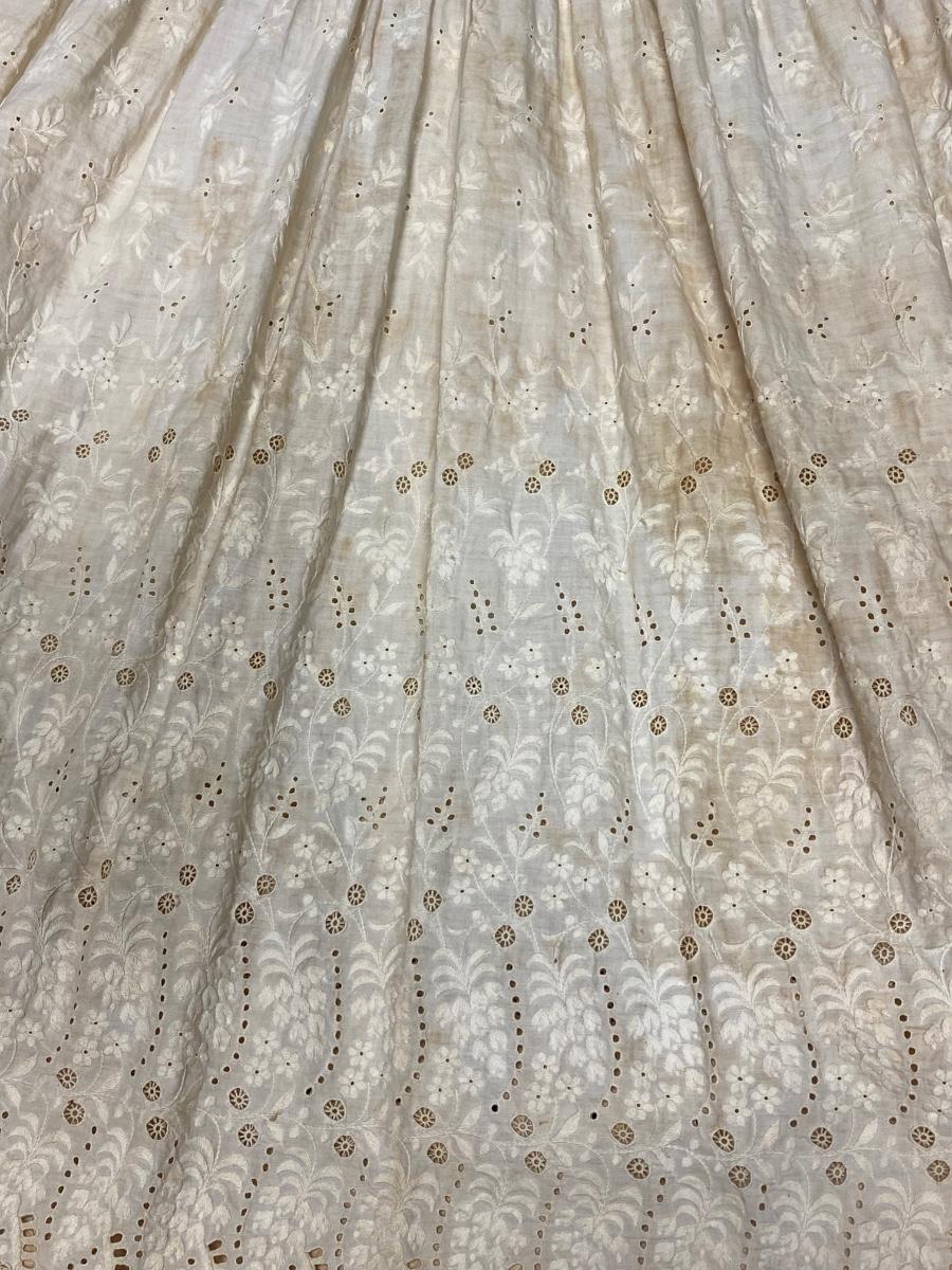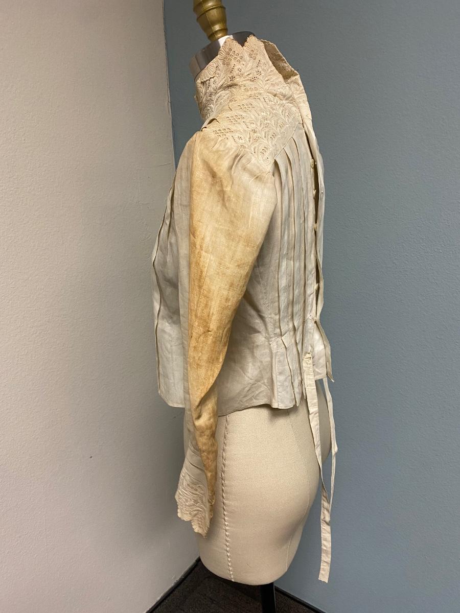 Antique Victorian Cotton Romantic Gibson Girl Two Piece Blouse & Skirt Set Floral Embroidered Lace. Matching embroidered lace on both pieces. Small note pinned to set has a date of 1876 on it. There is the obvious discolor from age but no spots, stains or holes. The blouse fit the mannequin nicely, size 8. Skirt measured about 14.5" but needs a button or hook and eye added for closure.