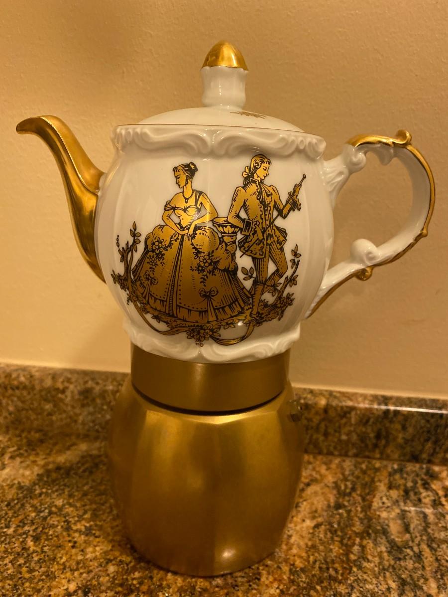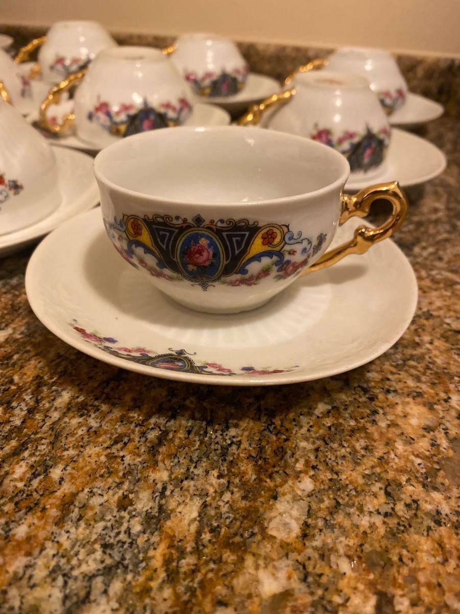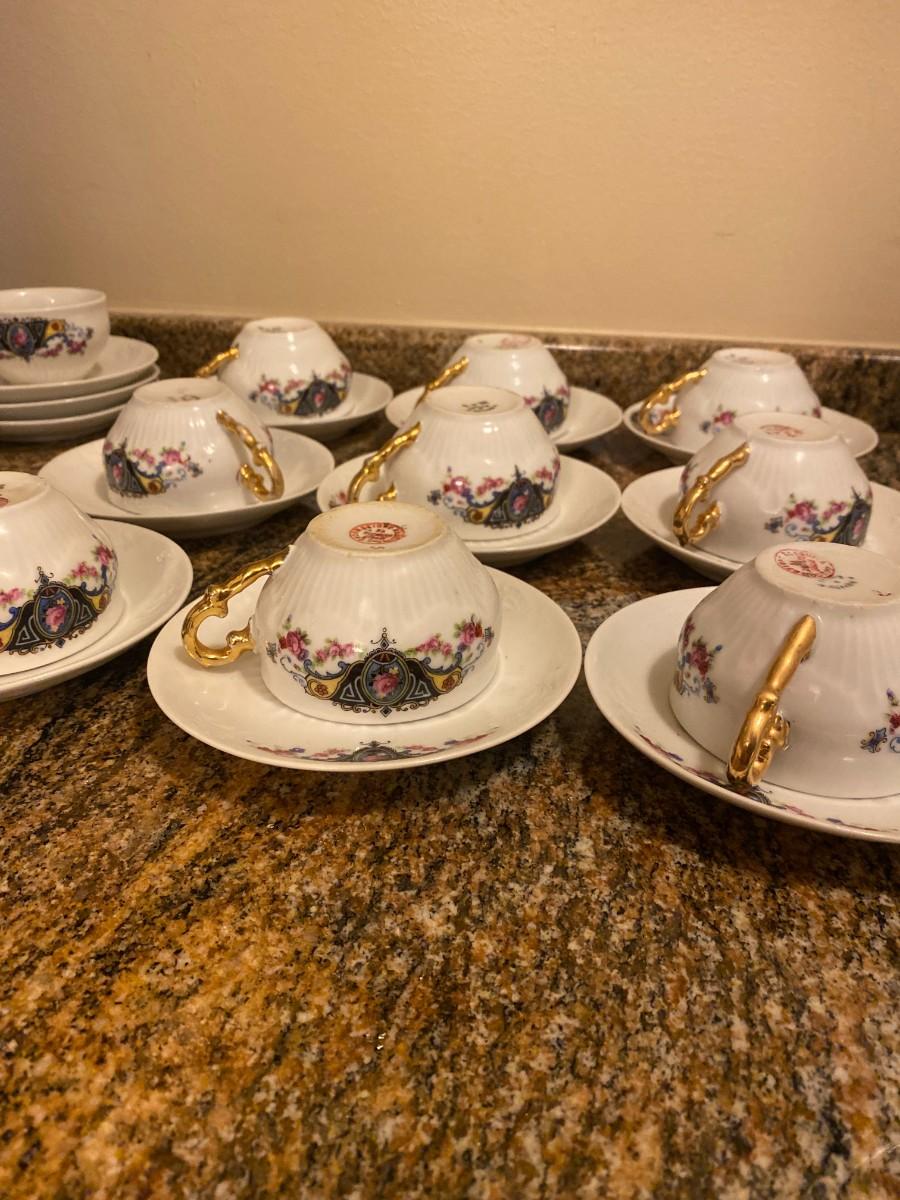 Italian espresso pot with set of espresso (11) cups and (13) saucers, a brass statue of a geisha (8”) and 4 tea cups with branch and leaf motif, brass and copper pitcher