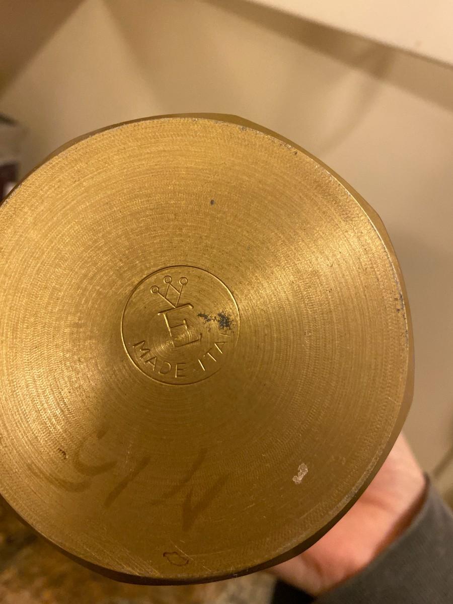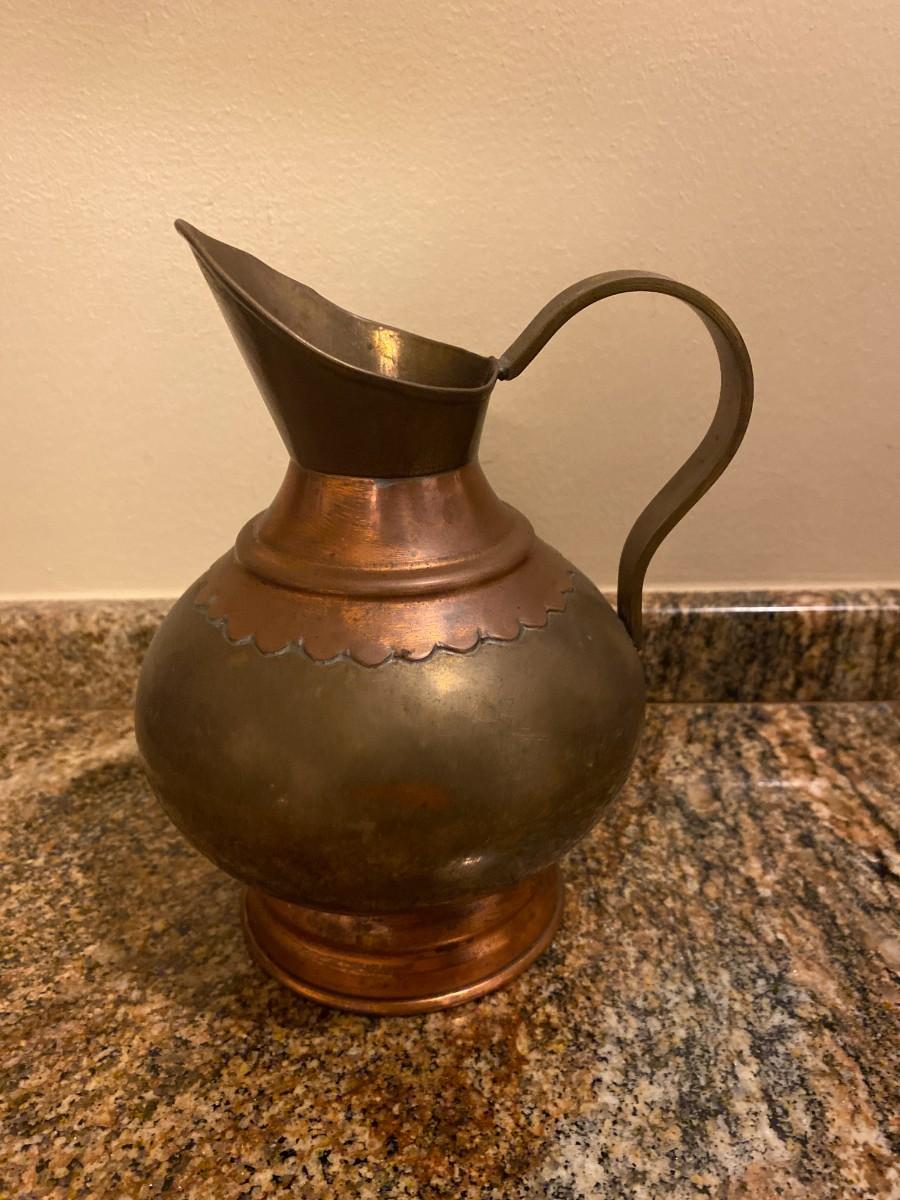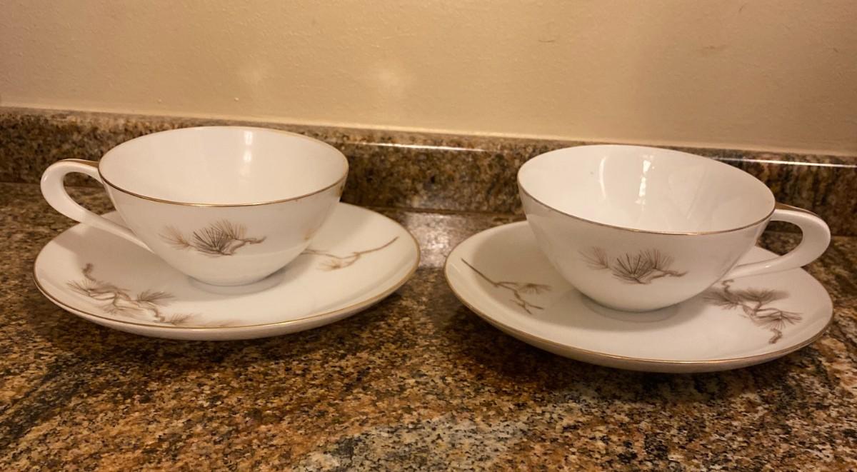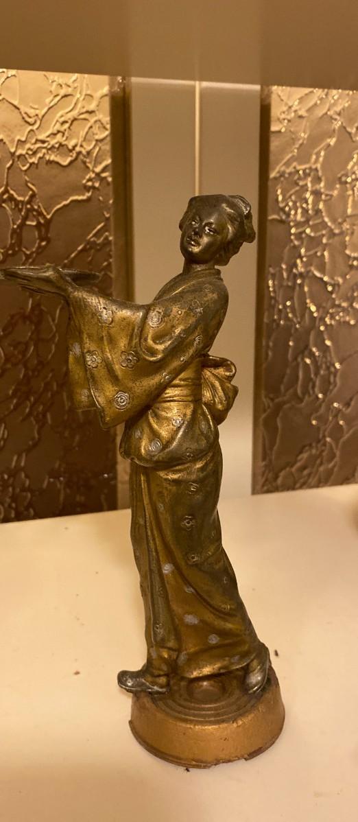 Italian espresso pot with set of espresso (11) cups and (13) saucers, a brass statue of a geisha (8”) and 4 tea cups with branch and leaf motif, brass and copper pitcher