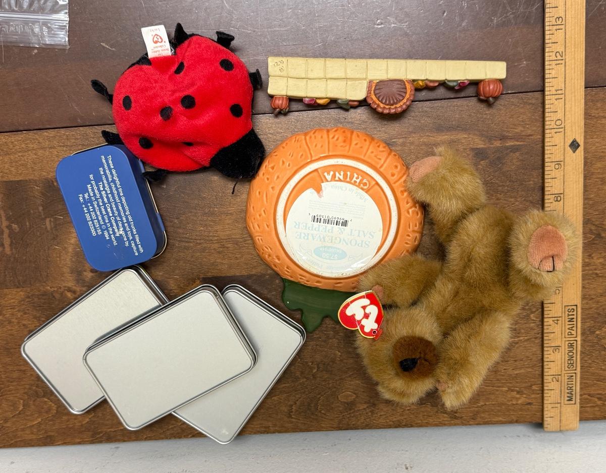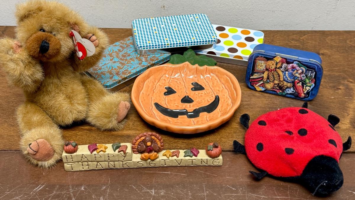 Misc Lot - cans, Halloween plate, Ladybug, Bear, Thanksgiving decor, etc