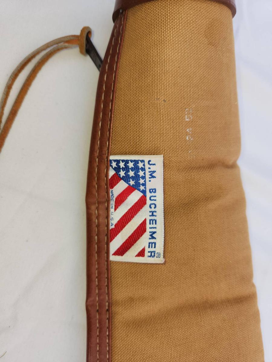 J.M. Buchheimer gun case constructed with durable canvas material, leather trim, and reinforced leather handles. Features a soft interior lining to ensure firearm protection and a zippered closure. Branded with the J.M. Buchheimer tag featuring an American flag design. Suitable for long firearms, such as rifles or shotguns. Appears well-crafted and functional for firearm storage and transport.