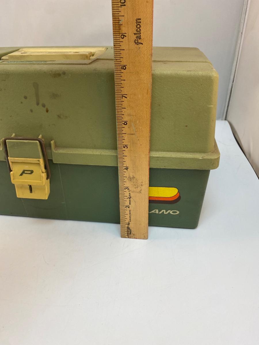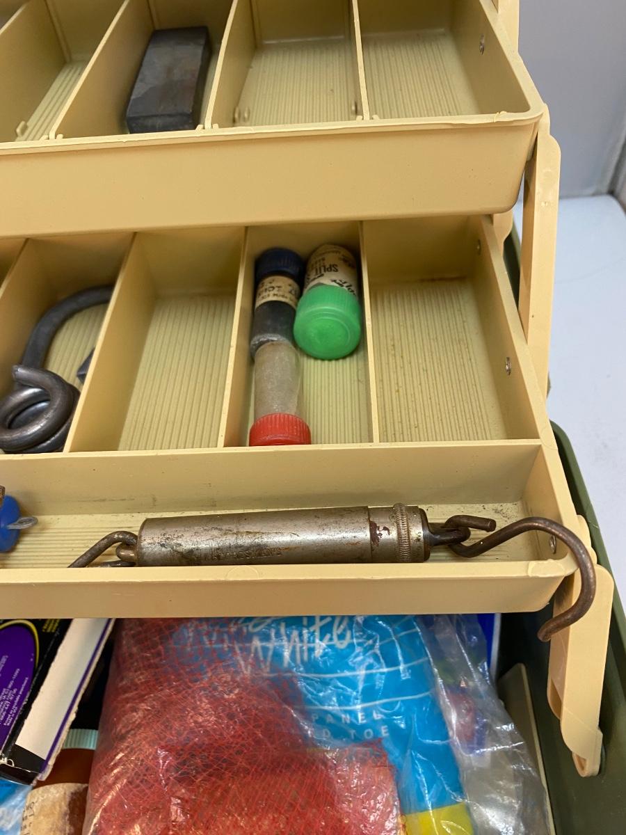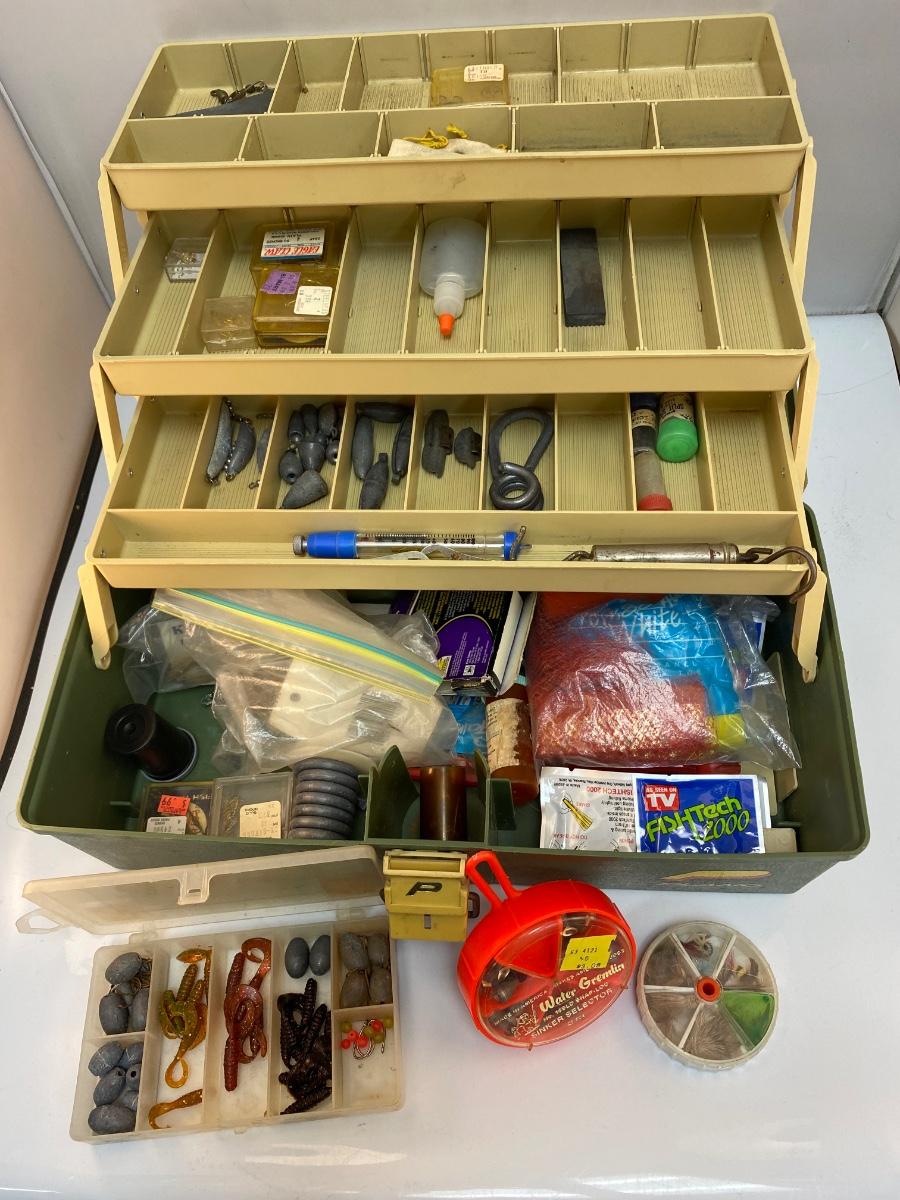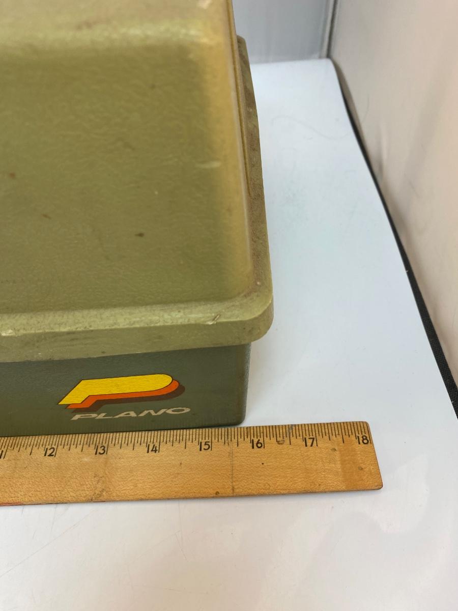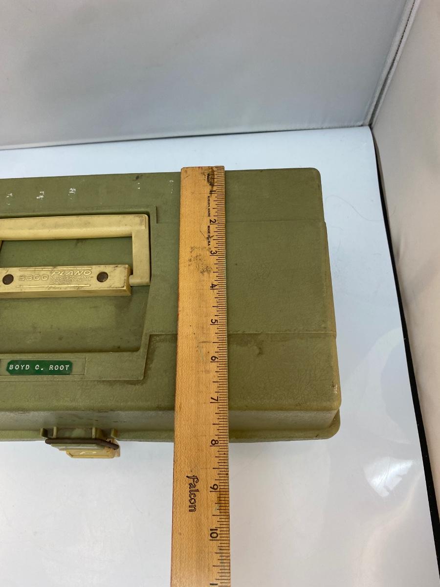 Vintage Green Plano 6300 Fishing Tackle Box with Various Gear Lures Hooks Weights
