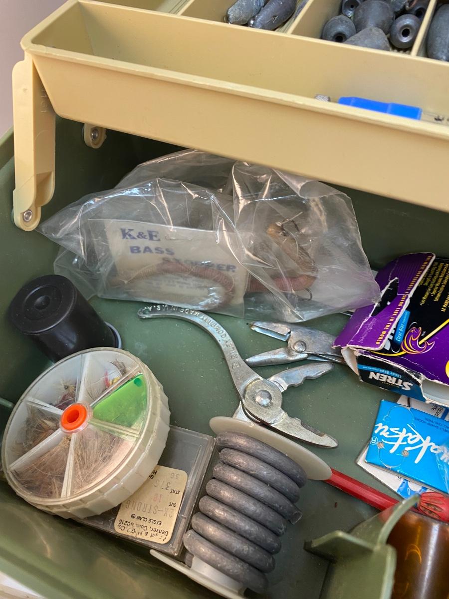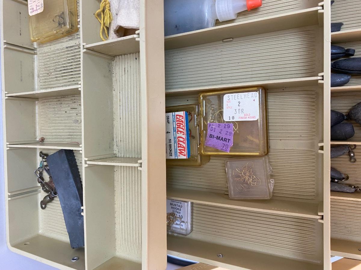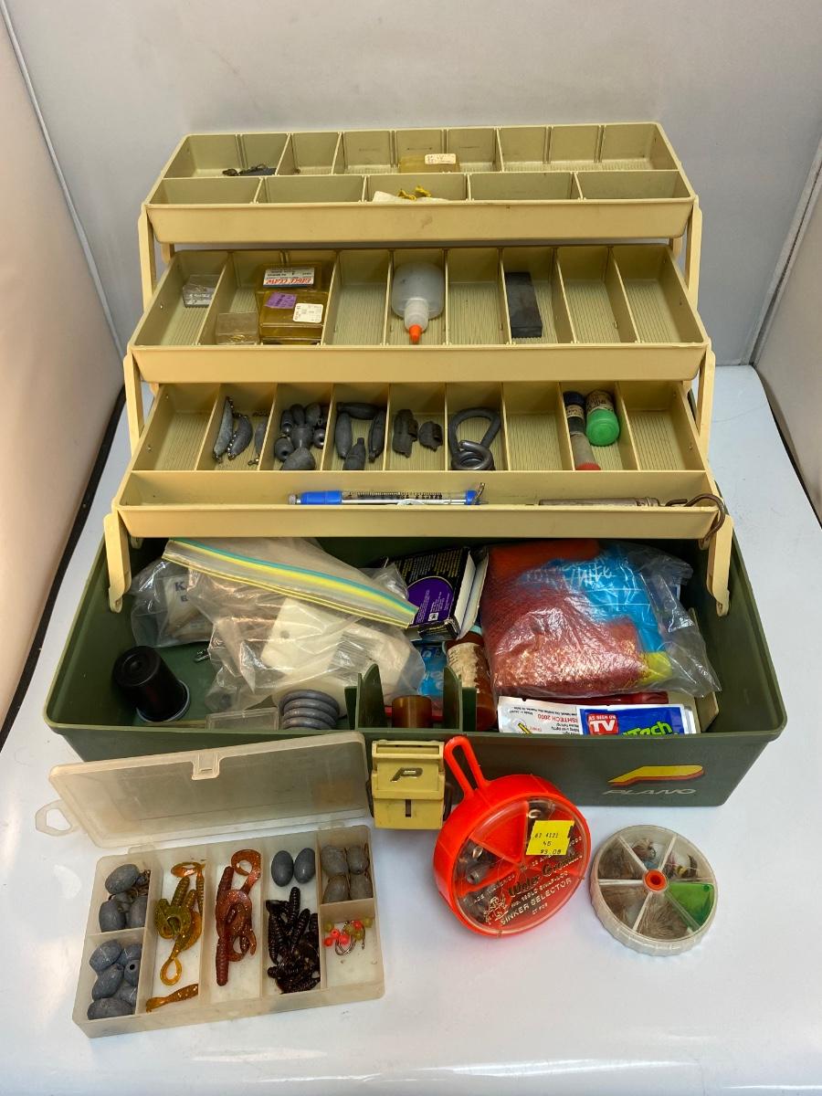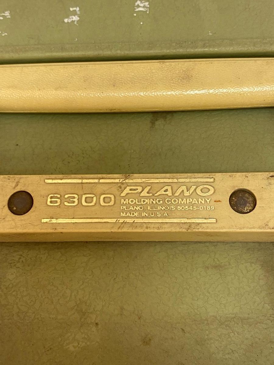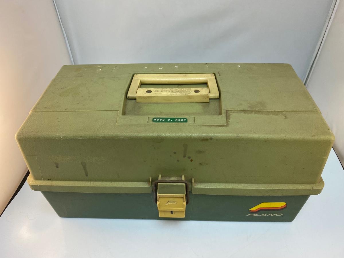 Vintage Green Plano 6300 Fishing Tackle Box with Various Gear Lures Hooks Weights