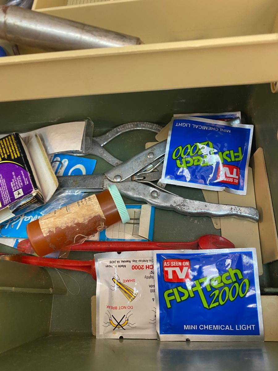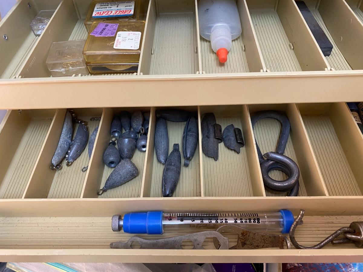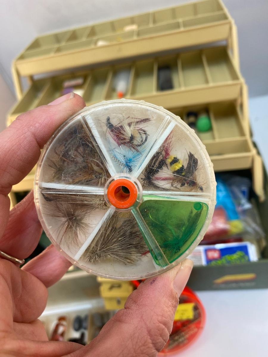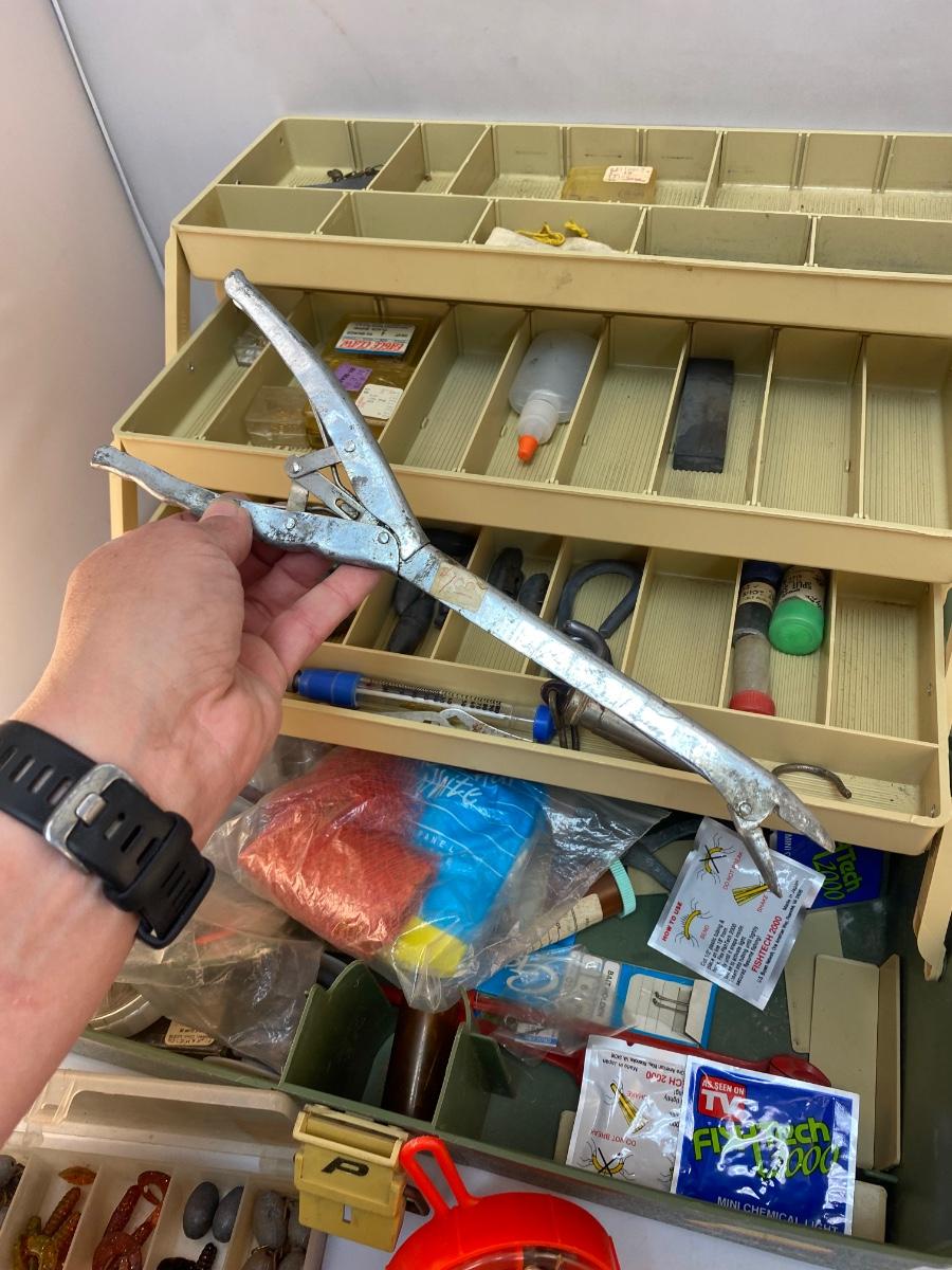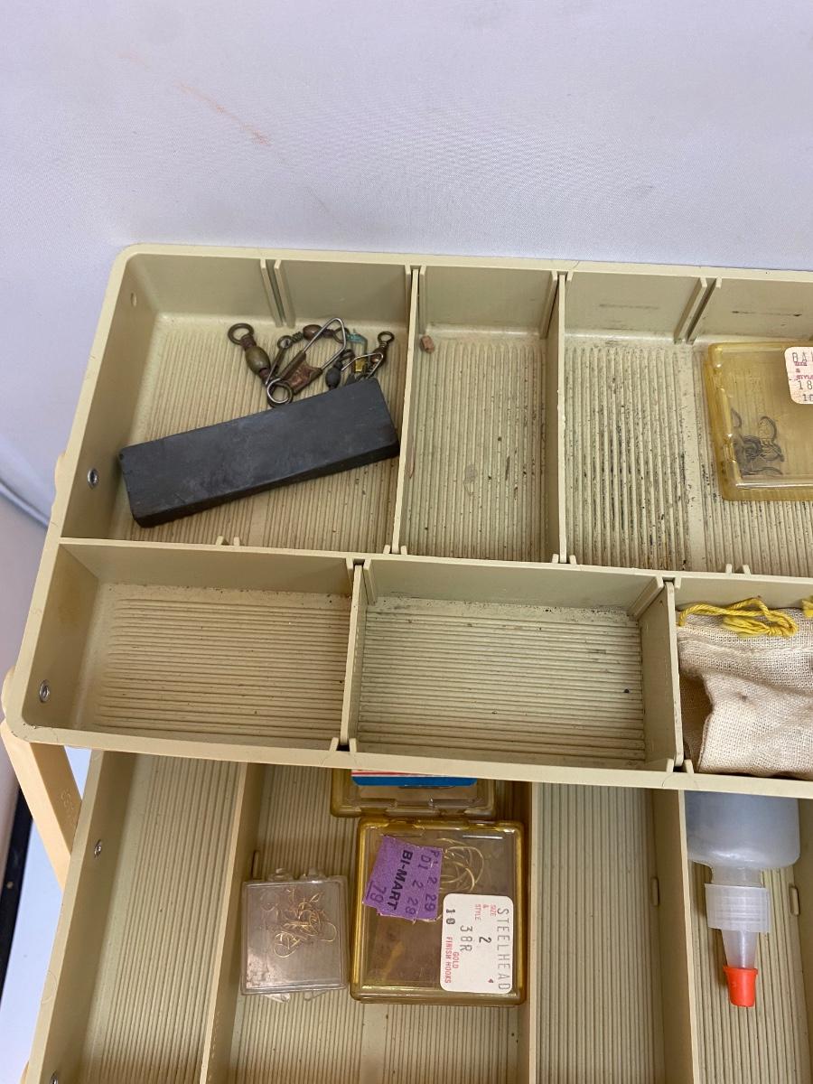 Vintage Green Plano 6300 Fishing Tackle Box with Various Gear Lures Hooks Weights