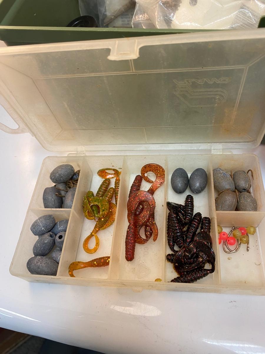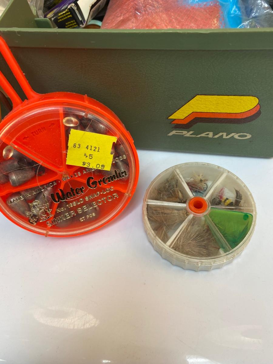 Vintage Green Plano 6300 Fishing Tackle Box with Various Gear Lures Hooks Weights. In good used condition. Mixed lot of fishing gear included. See Photos.