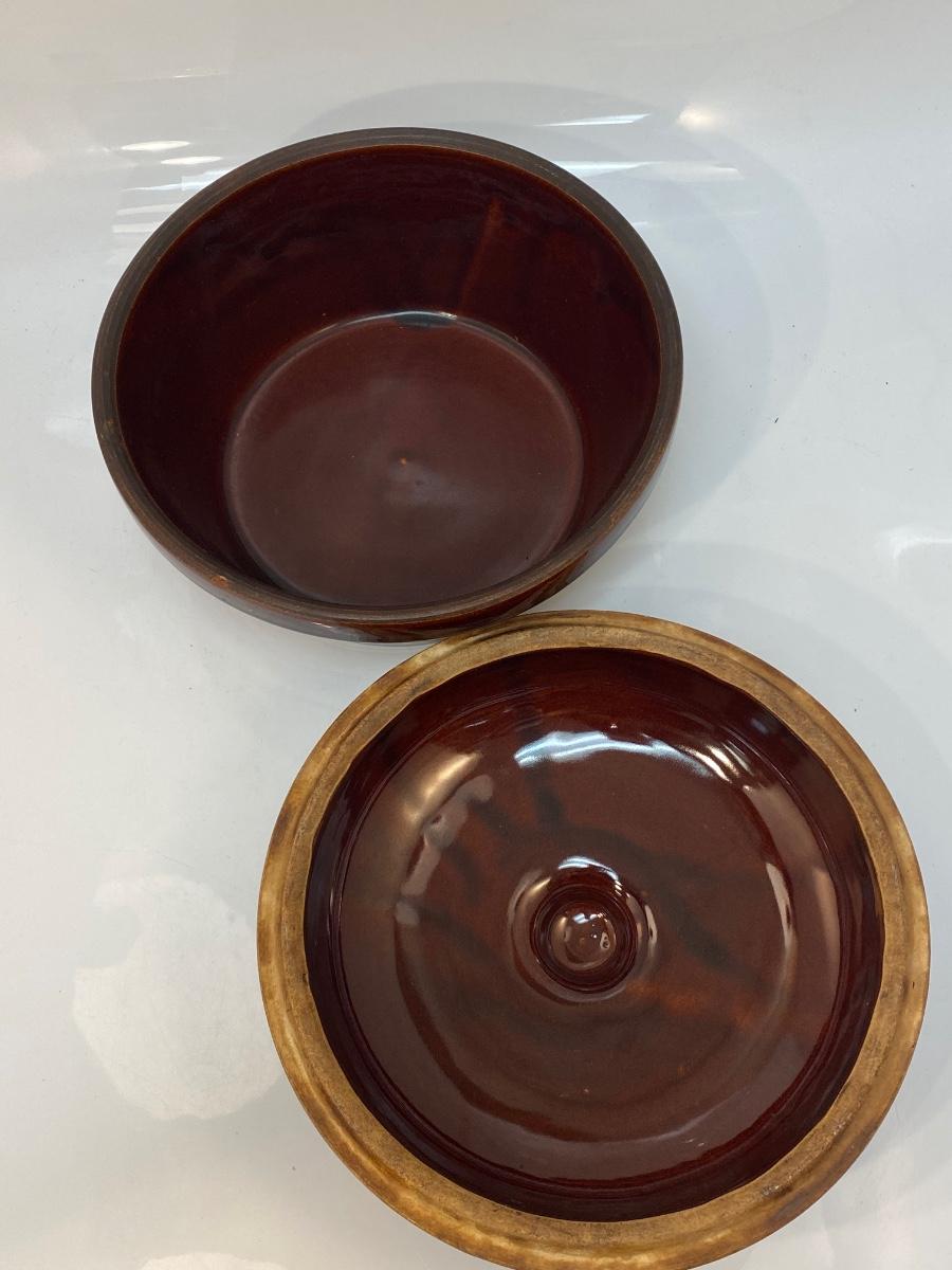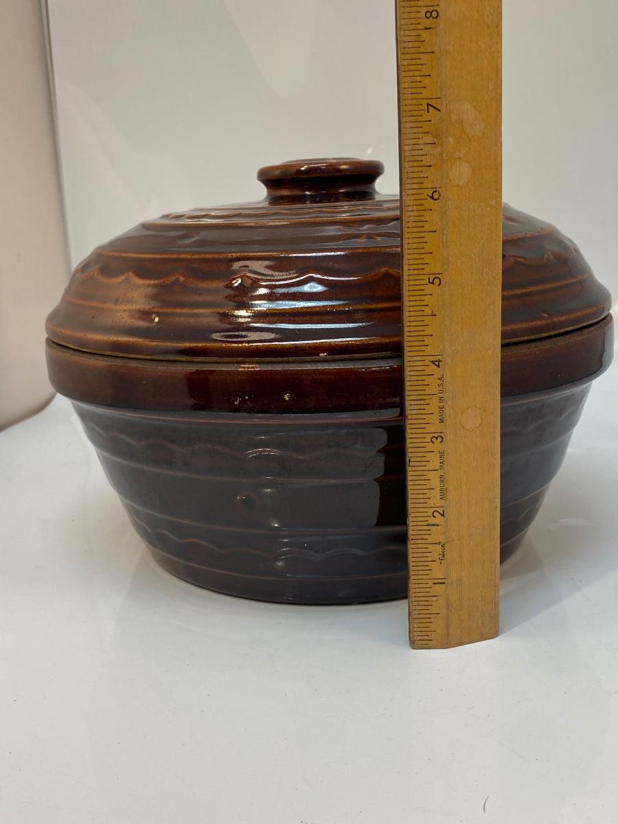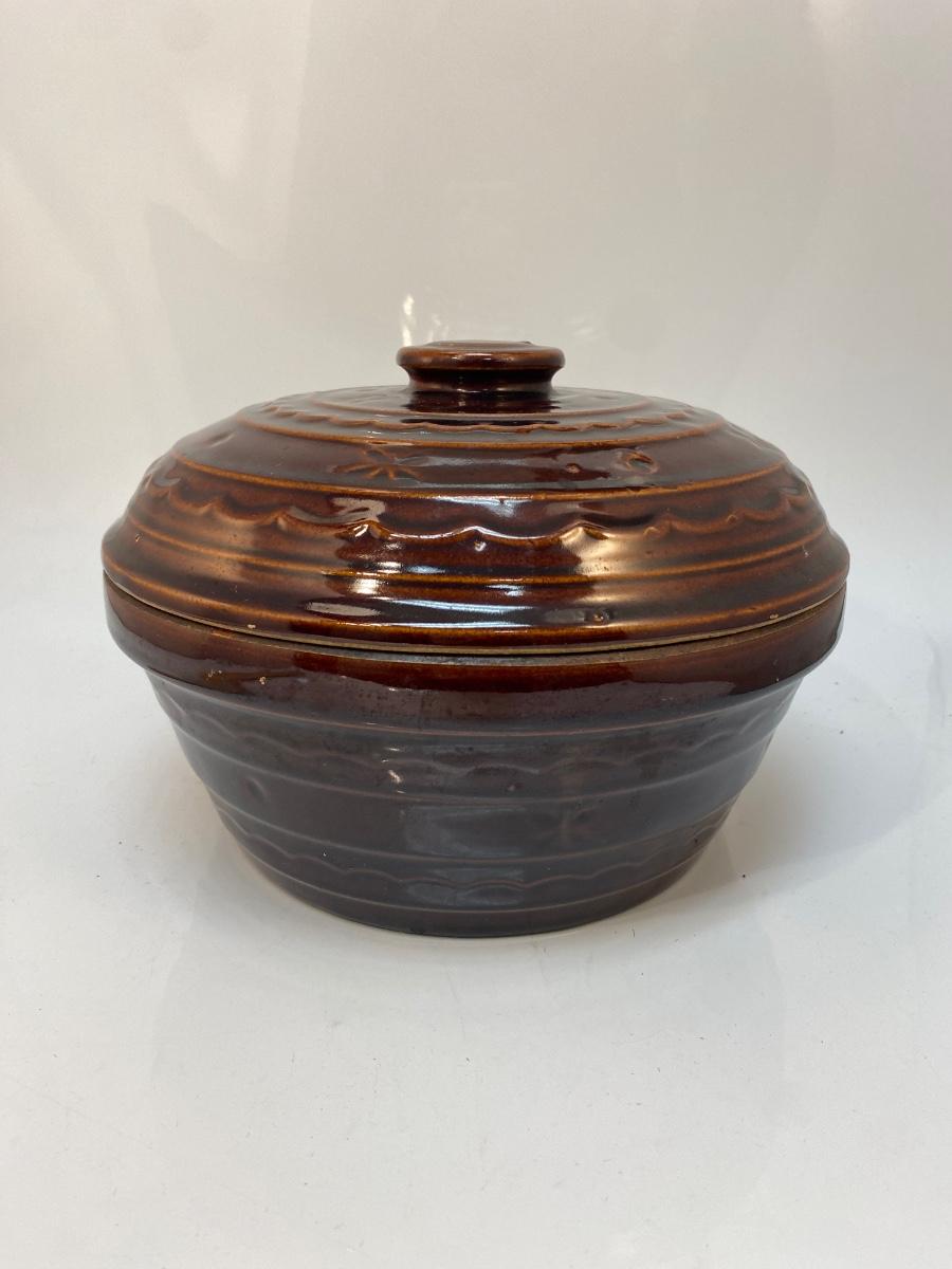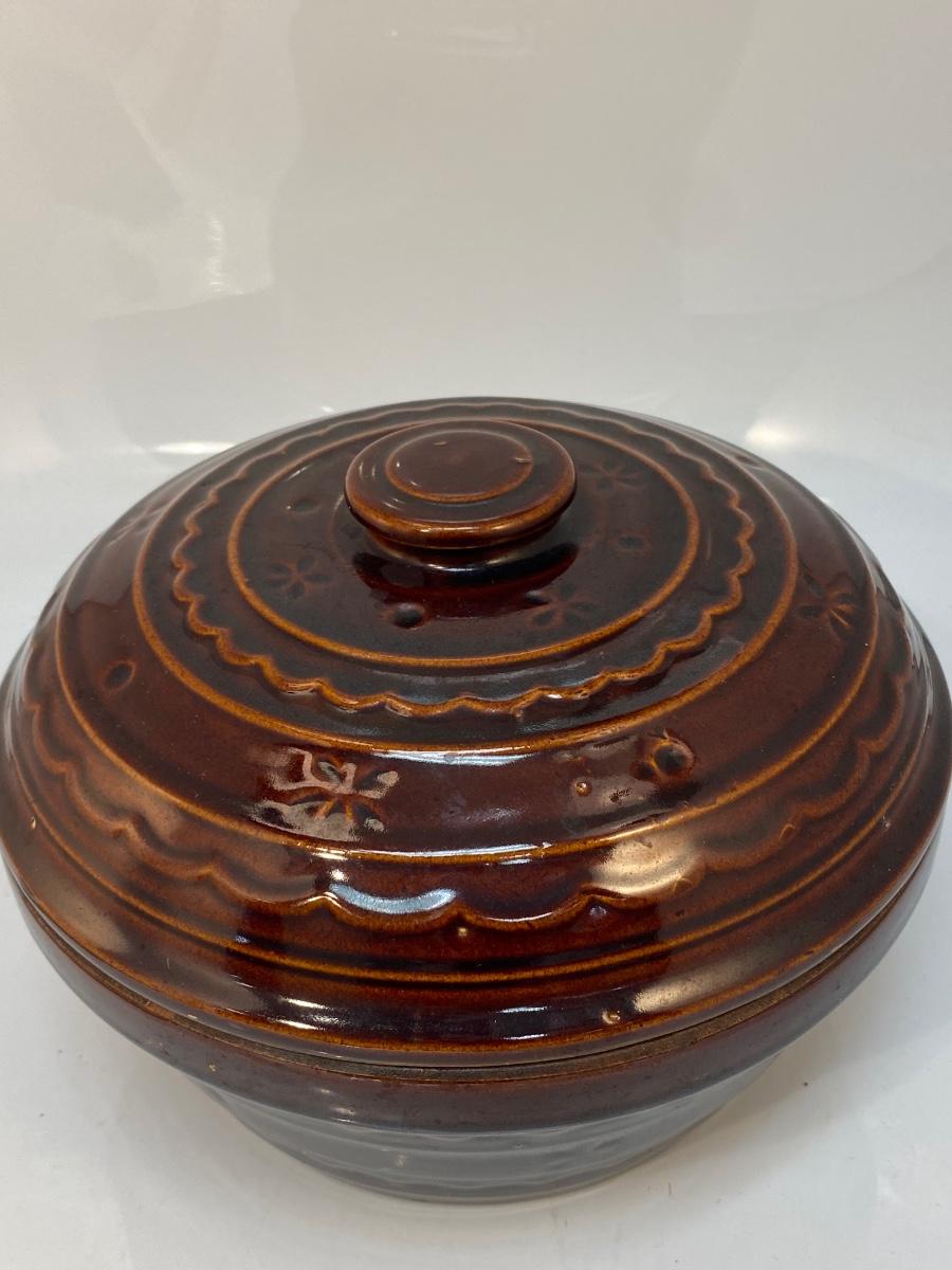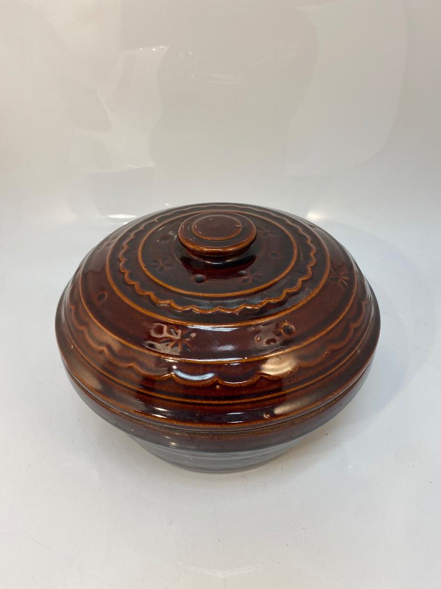 Vintage Dark Brown Mar-Crest Daisy Dot Stoneware Crock Dutch Oven Casserole Dish with Lid. In good condition. No chips, little signs of use. About 9" size.