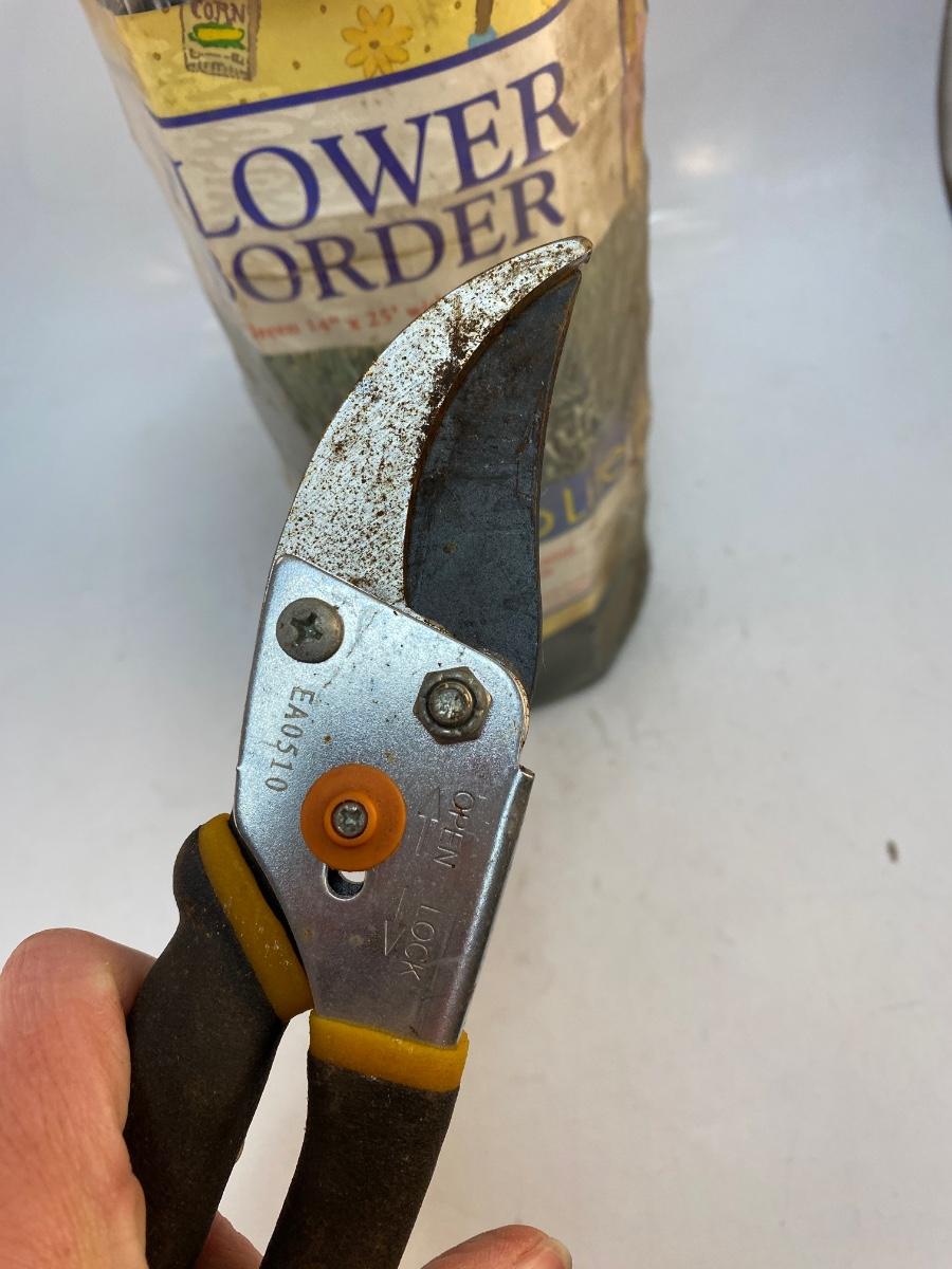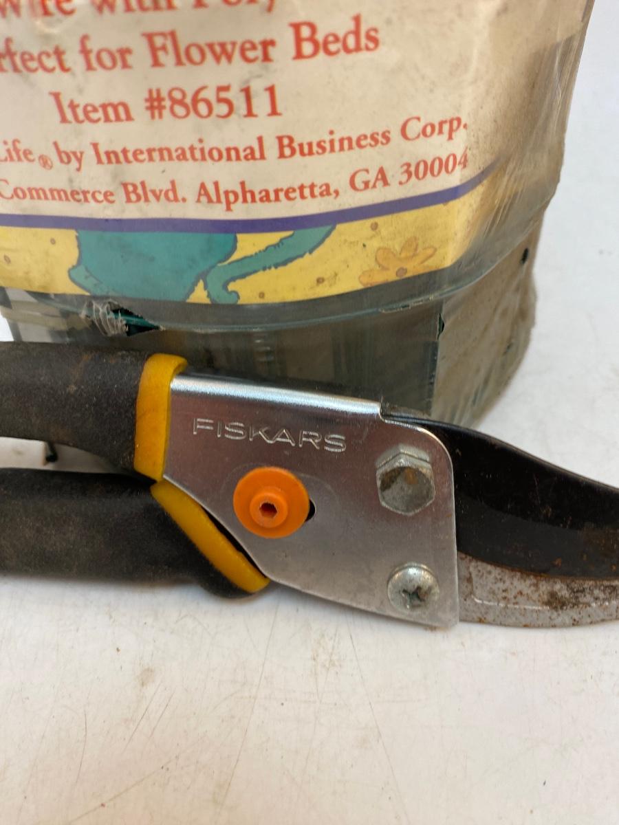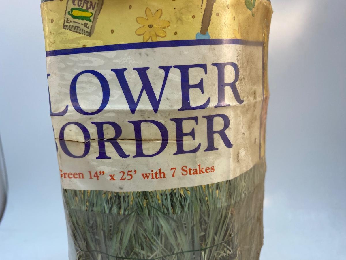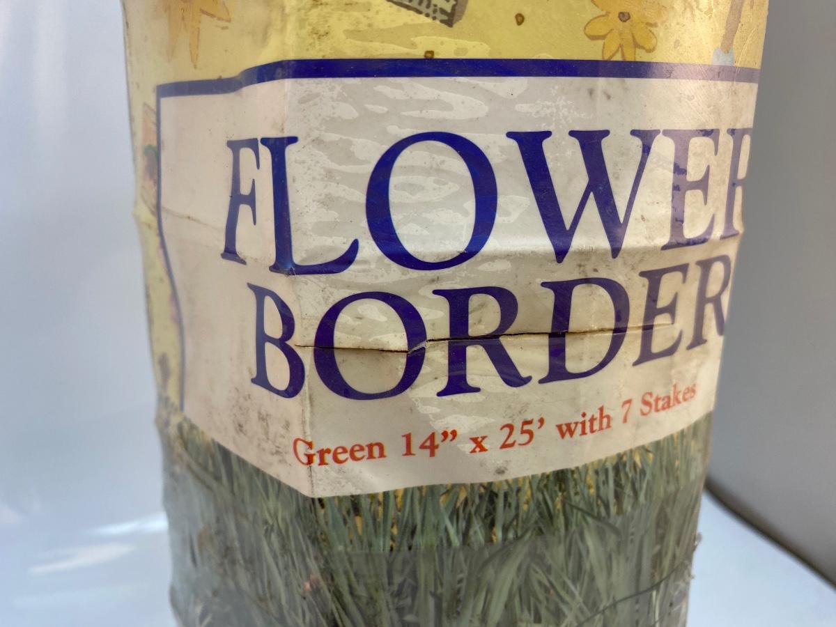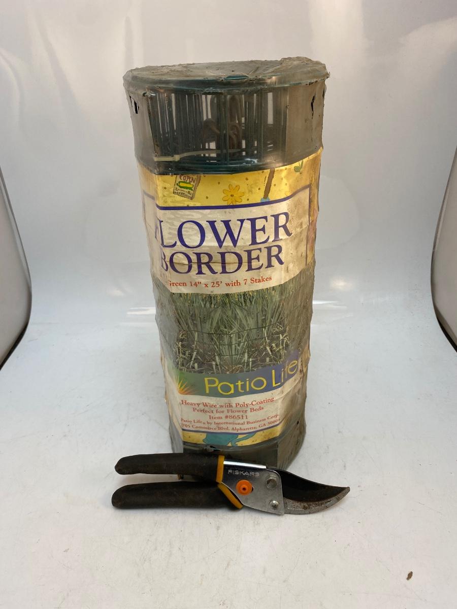 Unused Unopened Roll of Green Flower Border Fencing and Fiskers Limb Cutters. Border roll is 14" wide and 25' long.